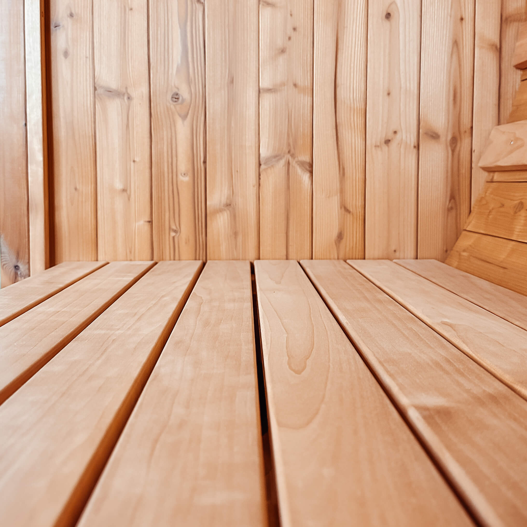 Jede Aura-Sauna ist aus feinster Thermofichte von Thermory gefertigt und somit auf Langlebigkeit ausgelegt. Die spezielle thermische Behandlung erhöht die Widerstandsfähigkeit des Holzes gegen Fäulnis und Witterungseinflüsse und sorgt dafür, dass Ihre Sauna ein dauerhafter Bestandteil Ihres Zuhauses bleibt.