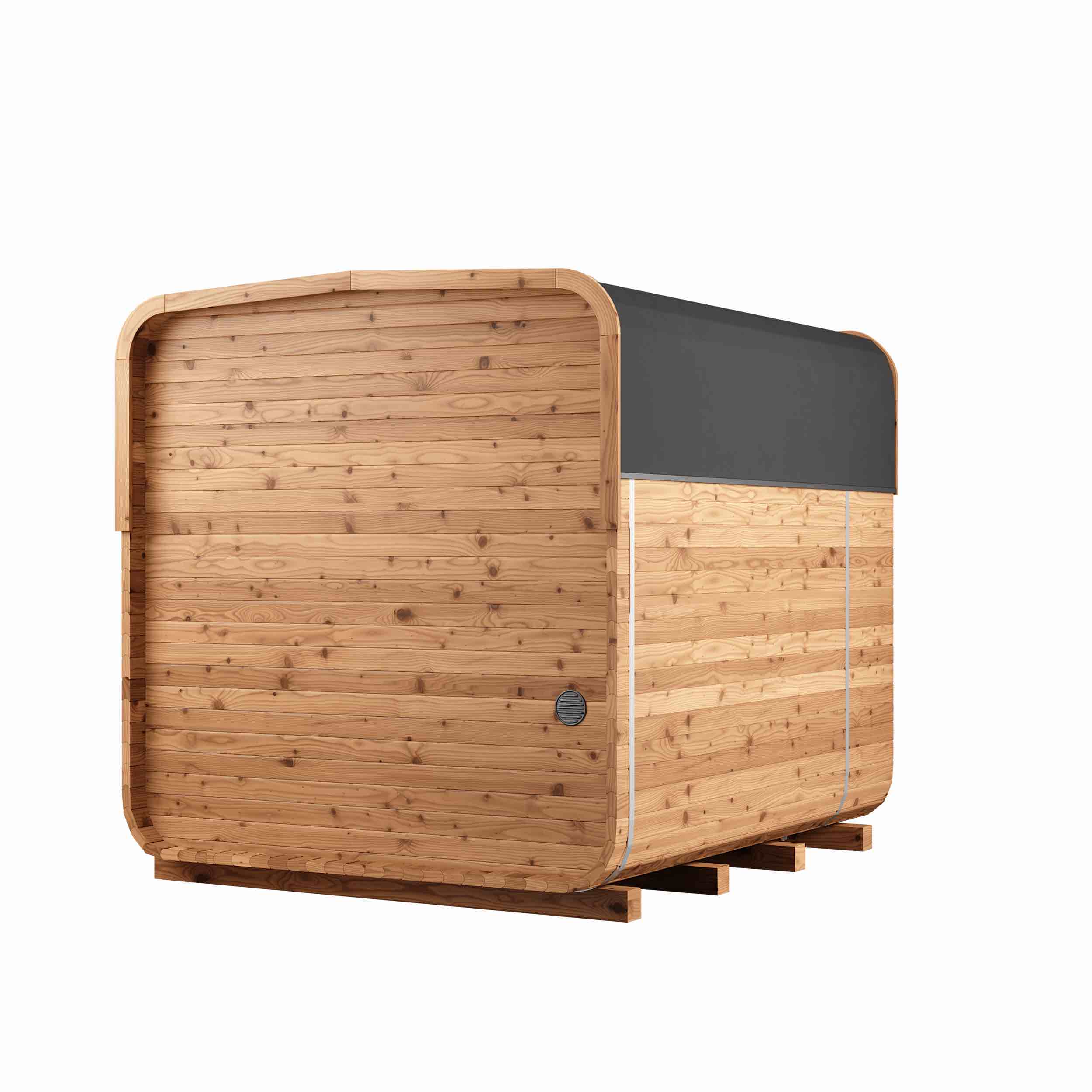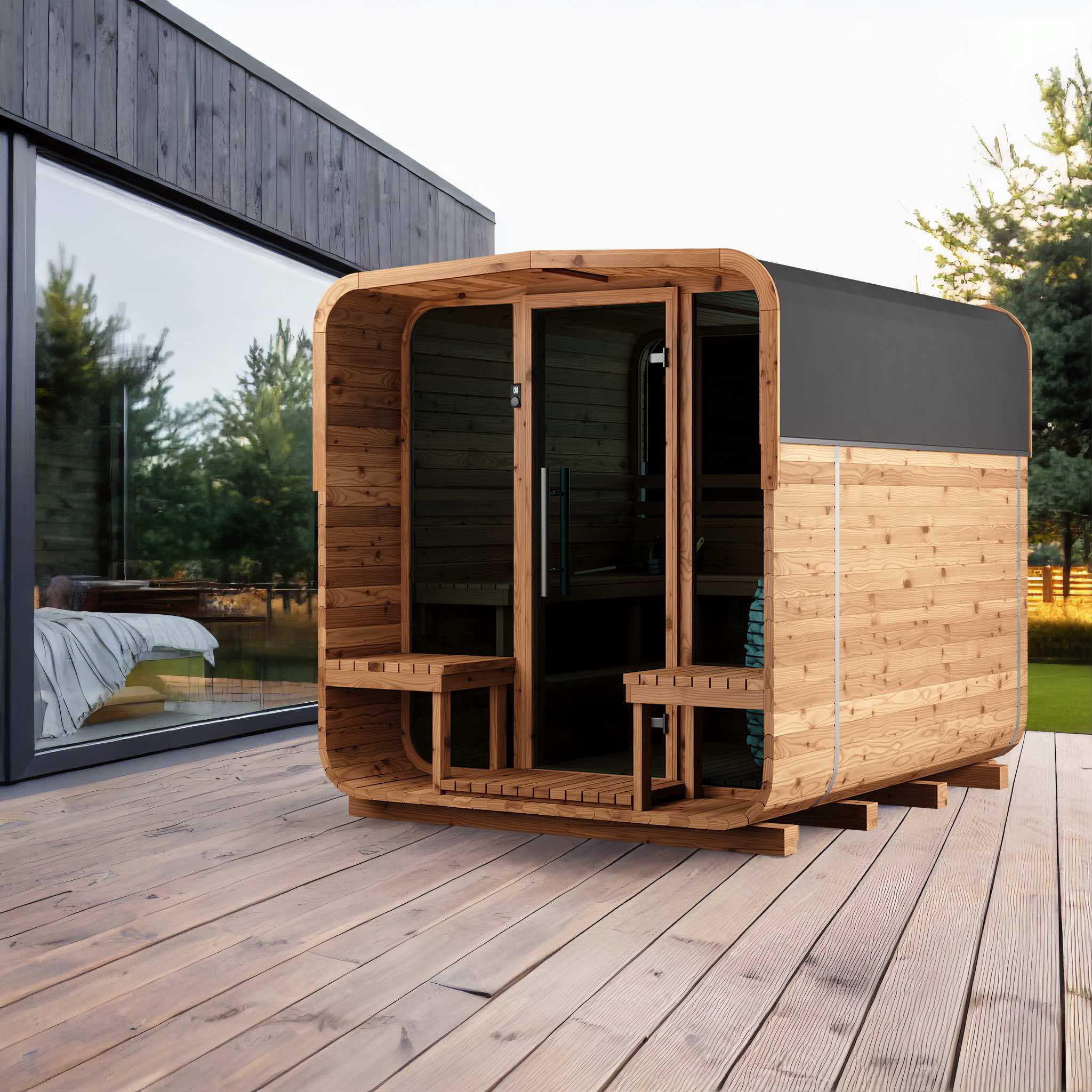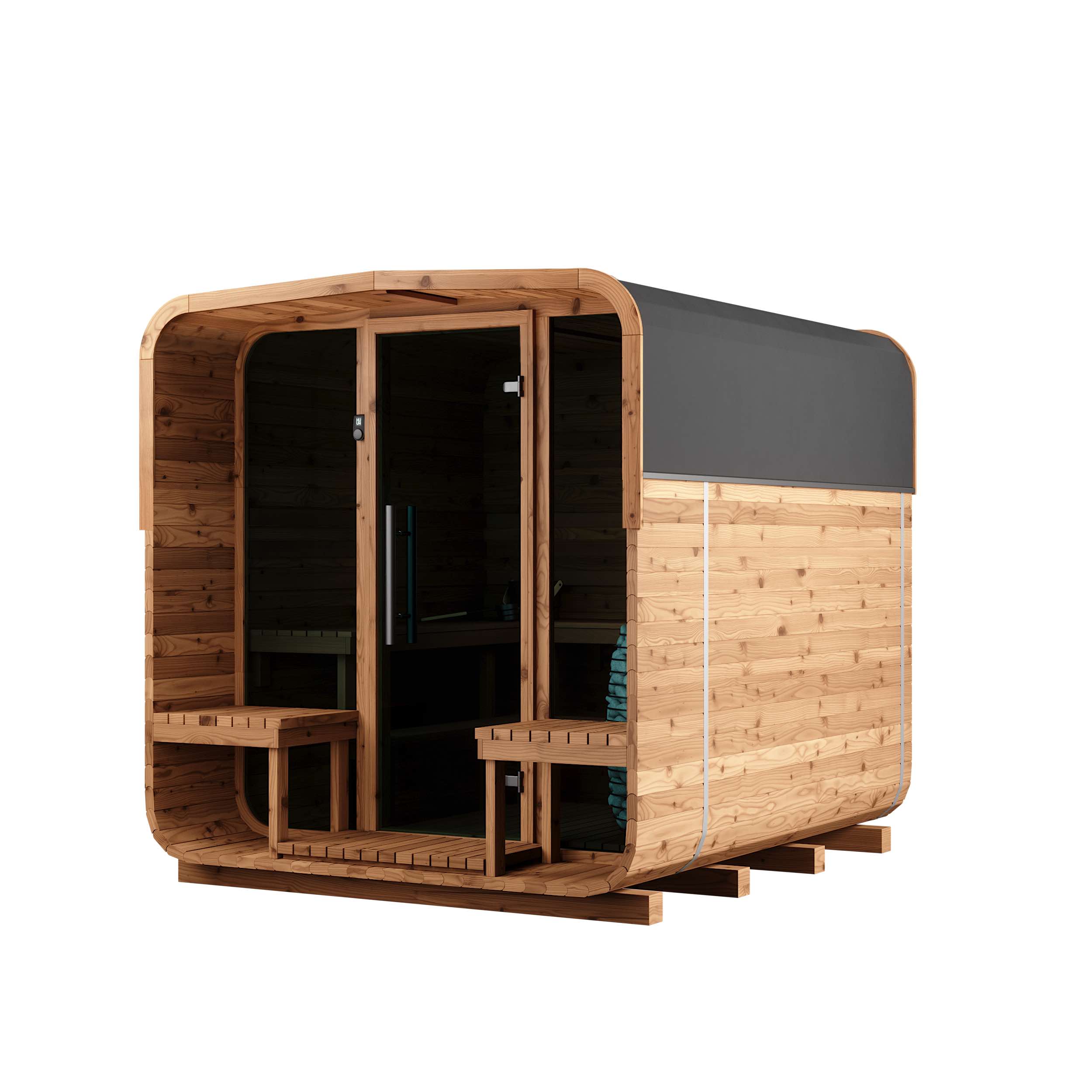 Erleben Sie die Eleganz des quadratischen Designs von Aura mit abgerundeten Kanten, das sich nahtlos in die natürliche Umgebung einfügt. Dieses Design wertet nicht nur Ihre Outdoor-Atmosphäre auf – die abgerundeten Ecken sorgen auch für eine gleichmäßige Wärmeverteilung und ein erstklassiges Saunaerlebnis.
