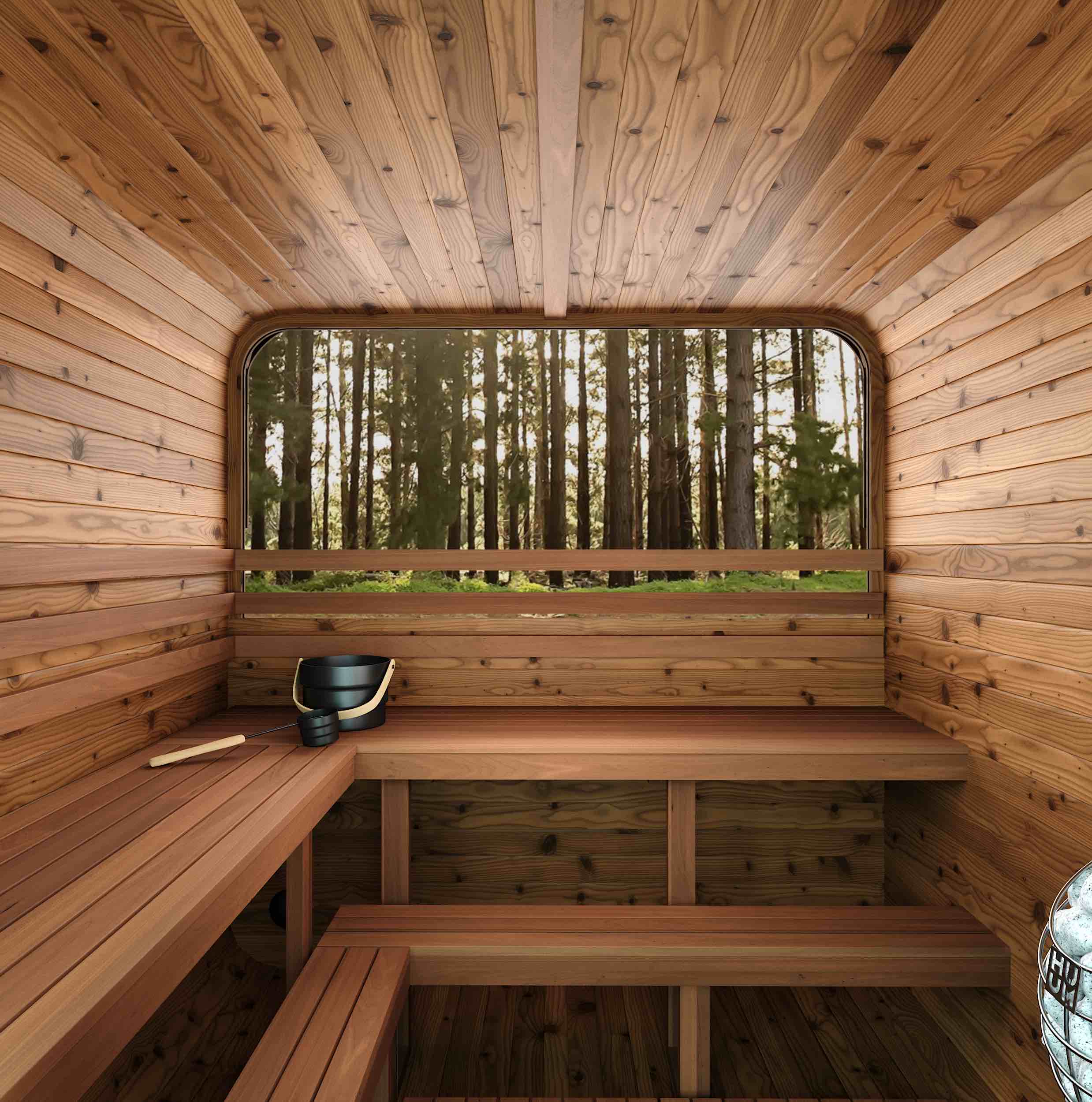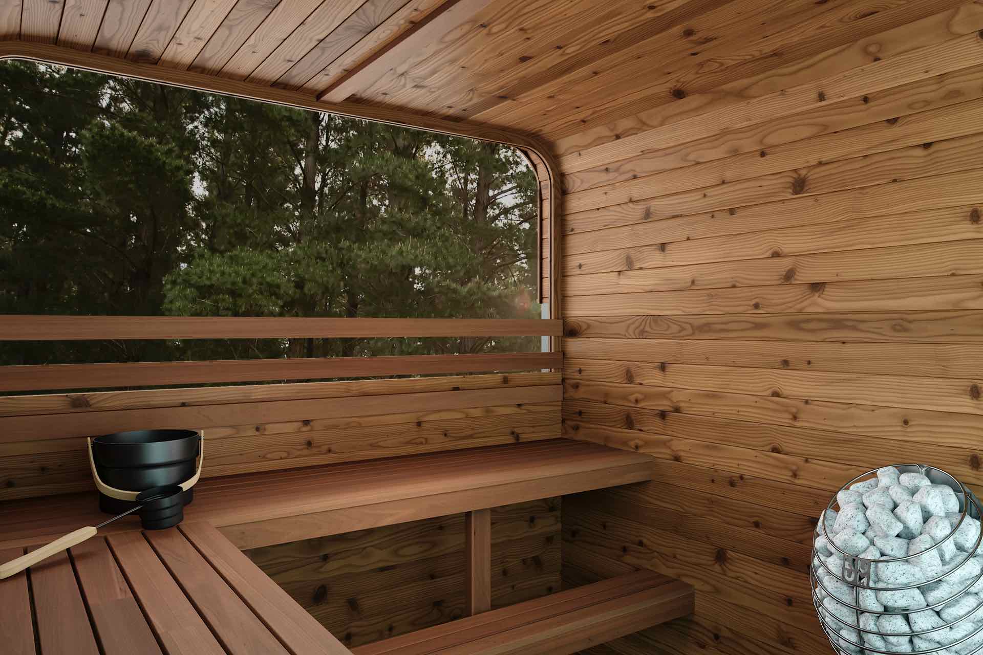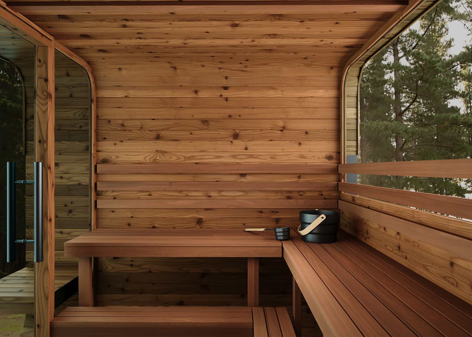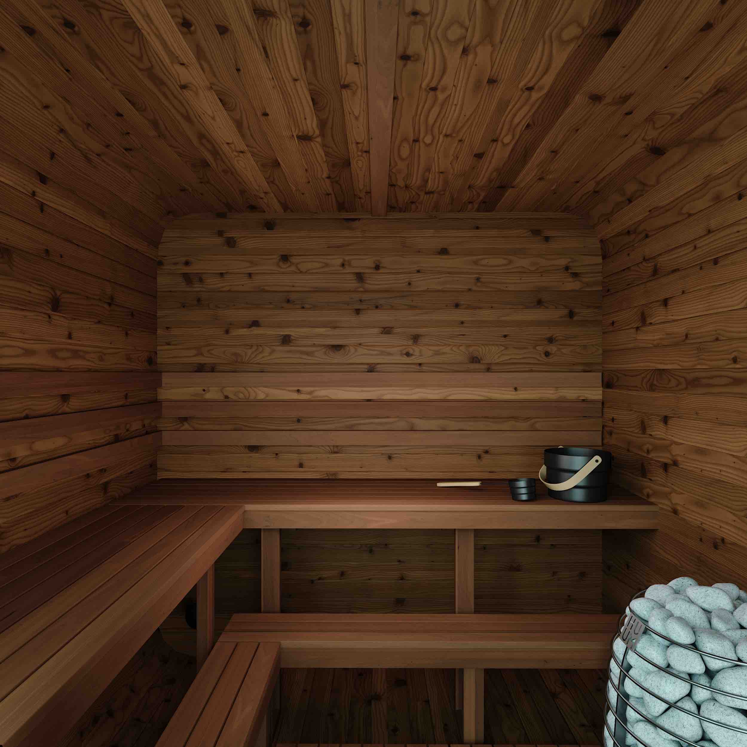 Erleben Sie die Eleganz des quadratischen Designs von Aura mit abgerundeten Kanten, das sich nahtlos in die natürliche Umgebung einfügt. Dieses Design wertet nicht nur Ihre Outdoor-Atmosphäre auf – die abgerundeten Ecken sorgen auch für eine gleichmäßige Wärmeverteilung und ein erstklassiges Saunaerlebnis.