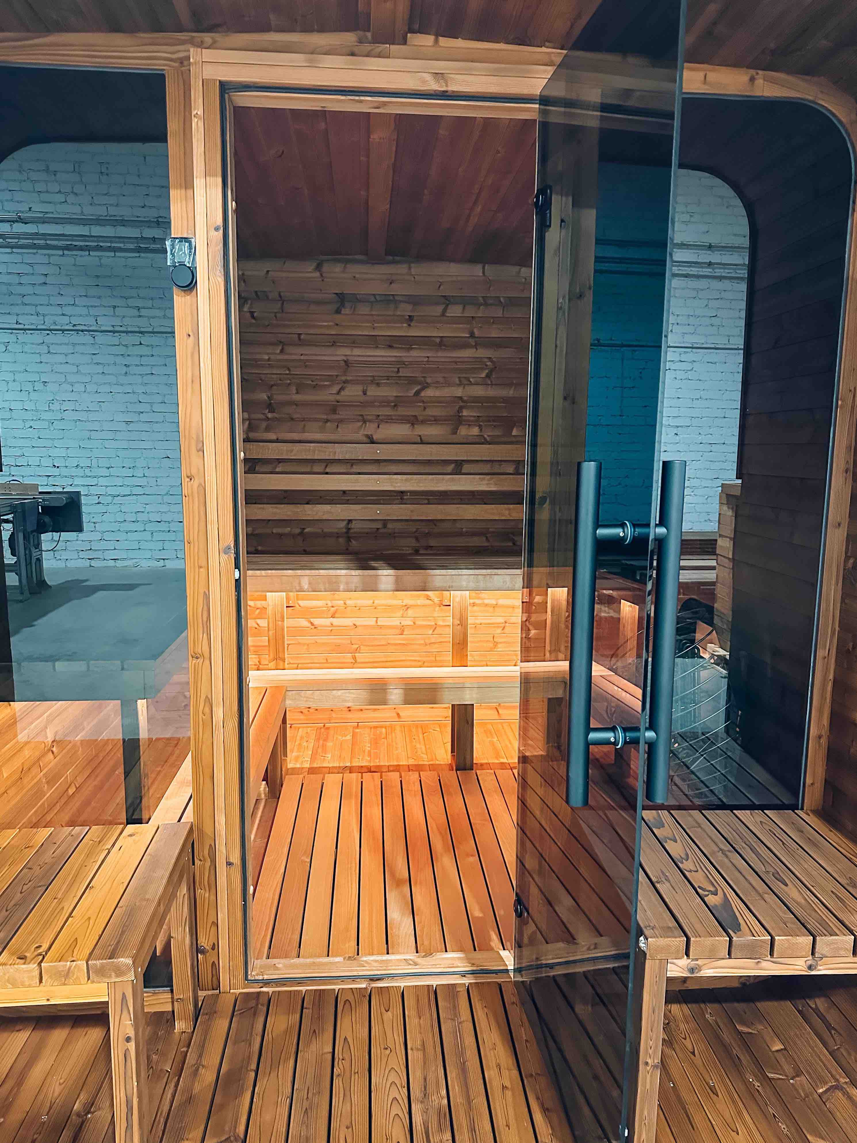 Das Highlight von AURA ist der einladende Verandabereich mit integrierten Bänken – ideal zum Entspannen vor oder nach dem Saunagang. Dieser zusätzliche Raum verleiht AURA einen Hauch von funktionaler Eleganz und macht sie zu mehr als nur einer Sauna.