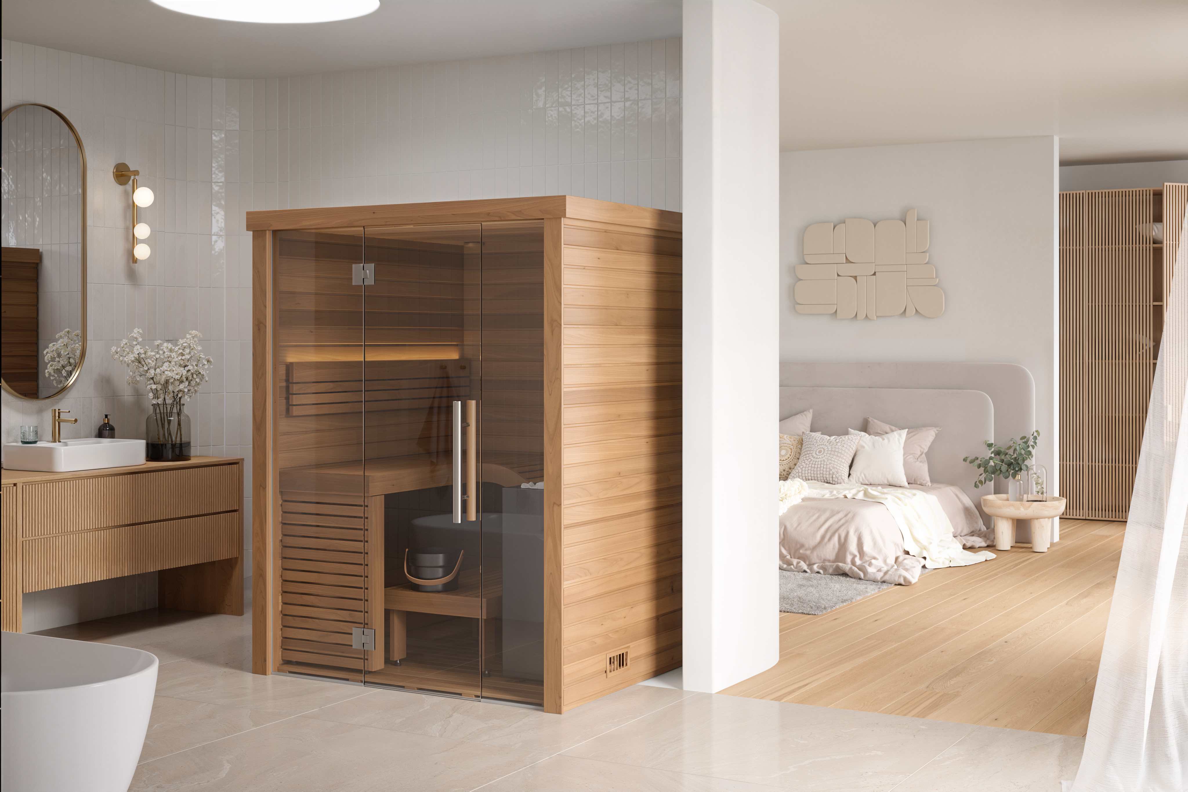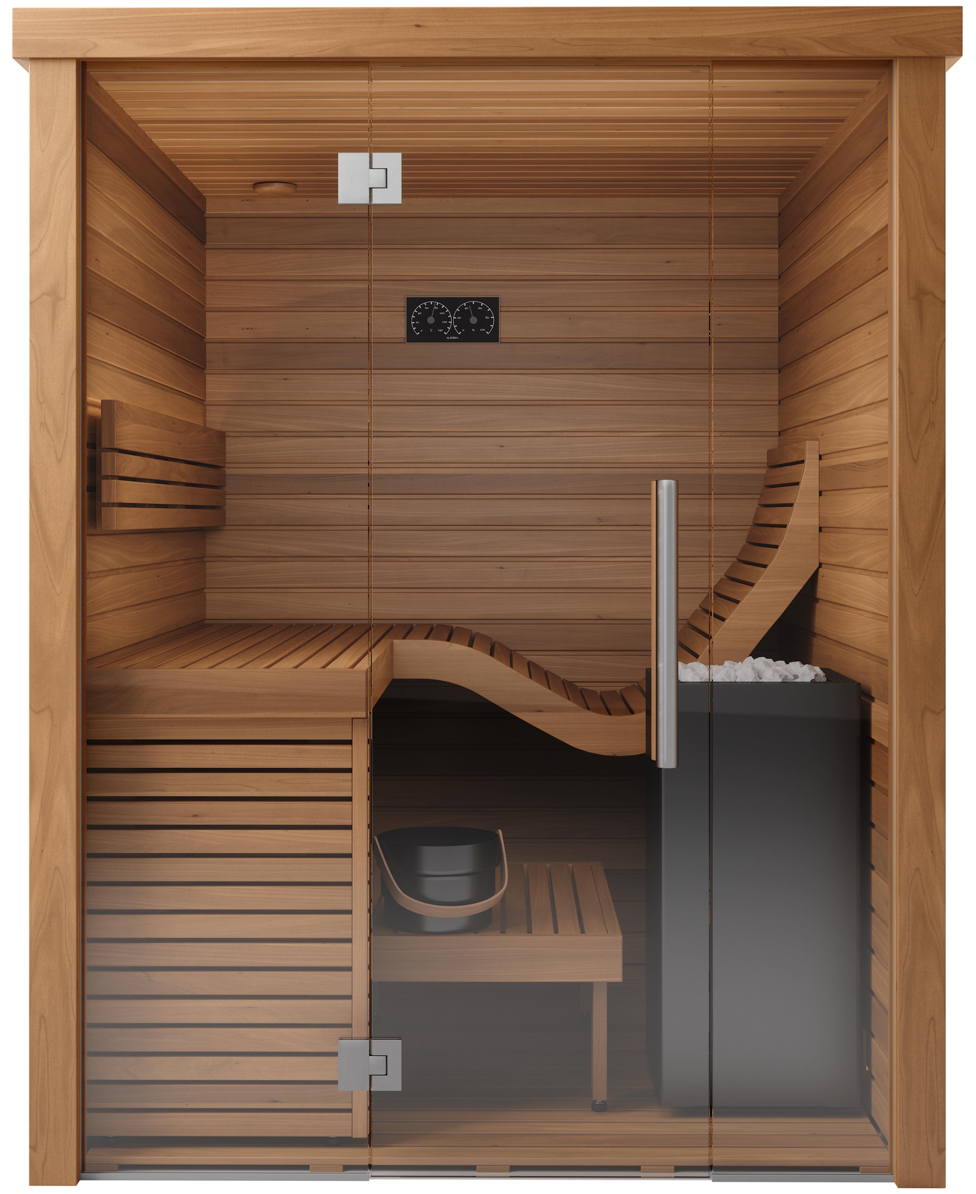 Mit ihrem ergonomischen Design und den charakteristisch geschwungenen Sitzflächen bringt die Baia-Sauna einen Hauch von Wellness-Luxus in kompaktere Innenräume. Geschwungene Bänke, die normalerweise nur in größeren Modellen zu finden sind, wurden hier für kleinere Räume neu interpretiert und bieten höchsten Komfort ohne Kompromisse.