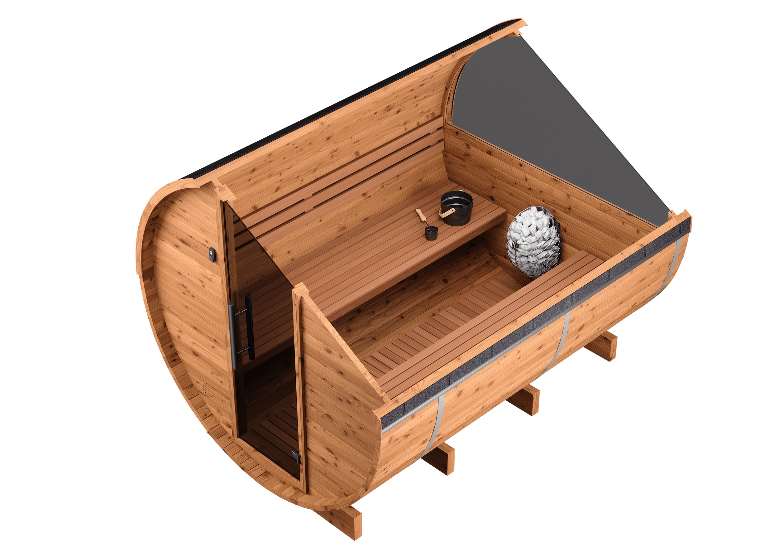 Genießen Sie die Ruhe der runden Form von Halo, die mit der natürlichen Umgebung harmoniert. Dieses Design wertet nicht nur Ihre Außenansicht auf, sondern sorgt auch für eine gleichmäßigere Wärmeverteilung in der Sauna.