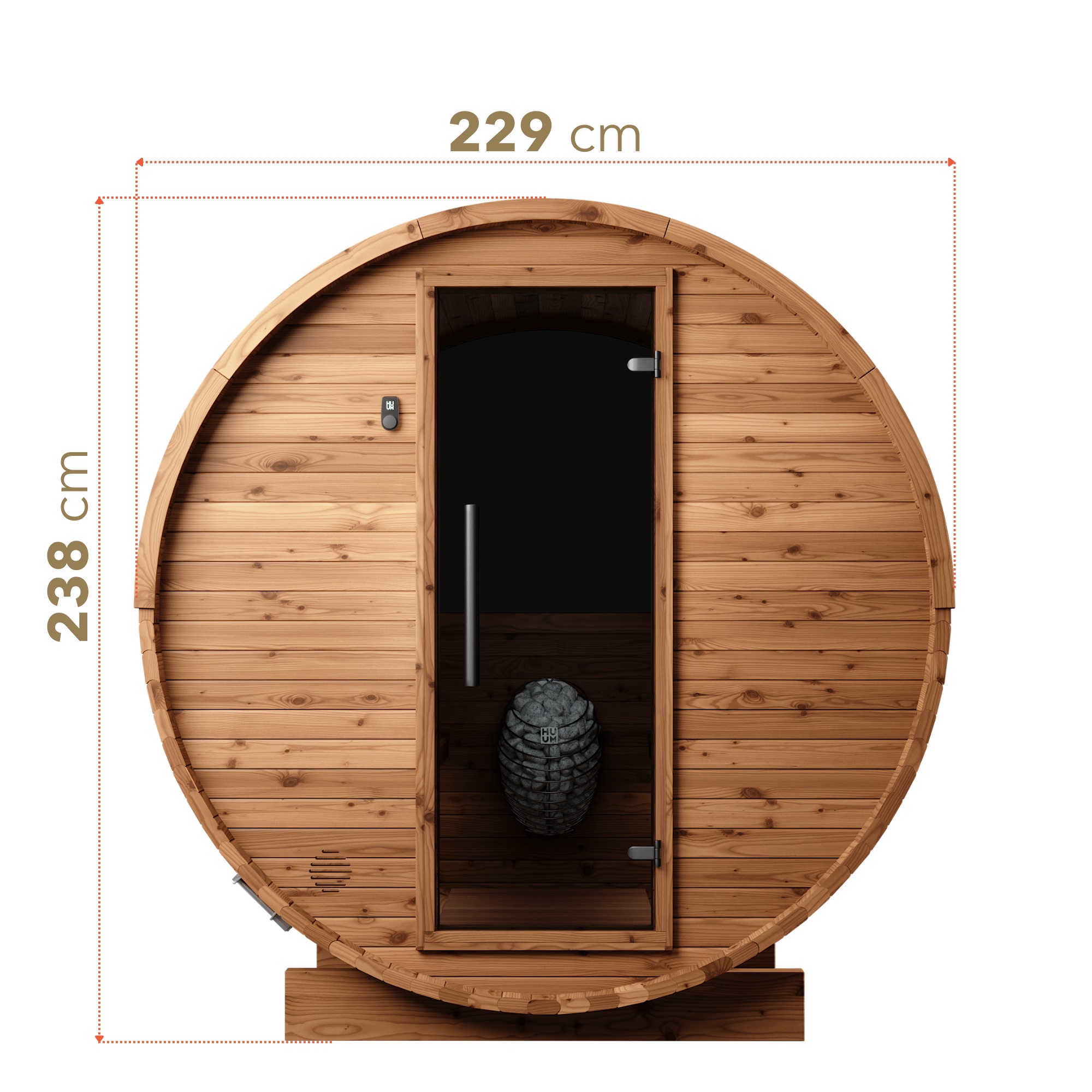 HALO-Saunen sind auf Komfort und Langlebigkeit ausgelegt und zeichnen sich durch eine runde, stromlinienförmige Form aus, die die Wärmeverteilung und Energieeffizienz optimiert. Diese Fasssaunen bieten eine gemütliche Atmosphäre zum Entspannen und werten jeden Außenbereich mit ihrem rustikalen Charme und ihrer modernen Funktionalität auf. Wählen Sie HALO für einen Hauch von Luxus in den Modellen Cosy oder Comfy, mit optionalem Umkleideraum für zusätzlichen Komfort.