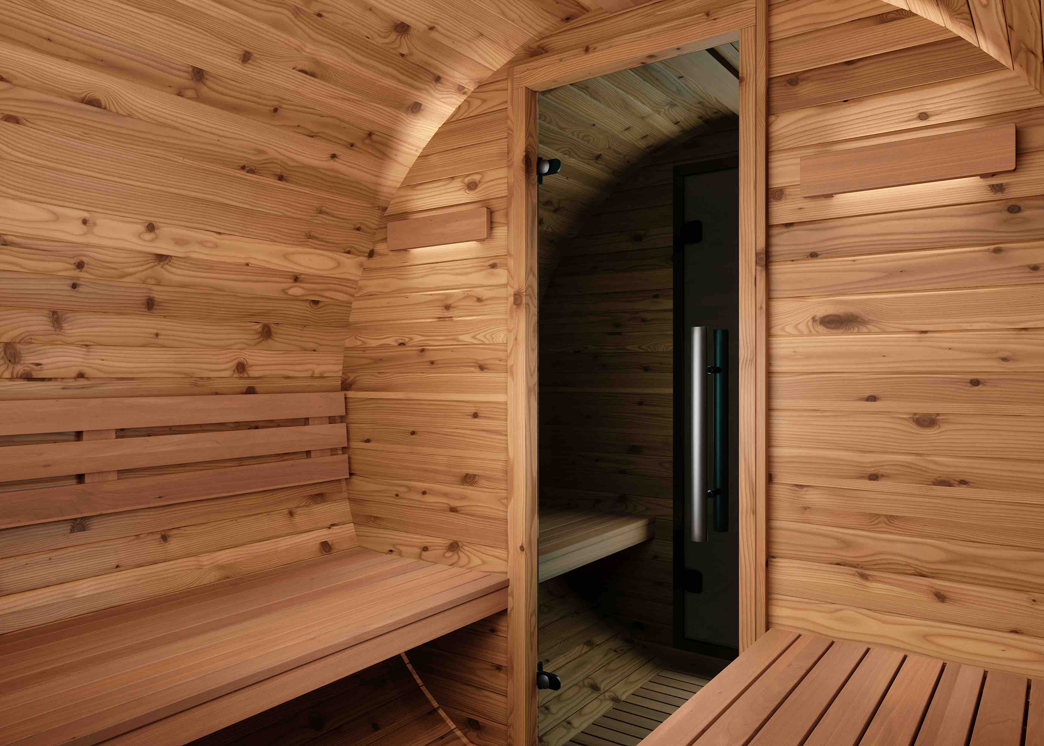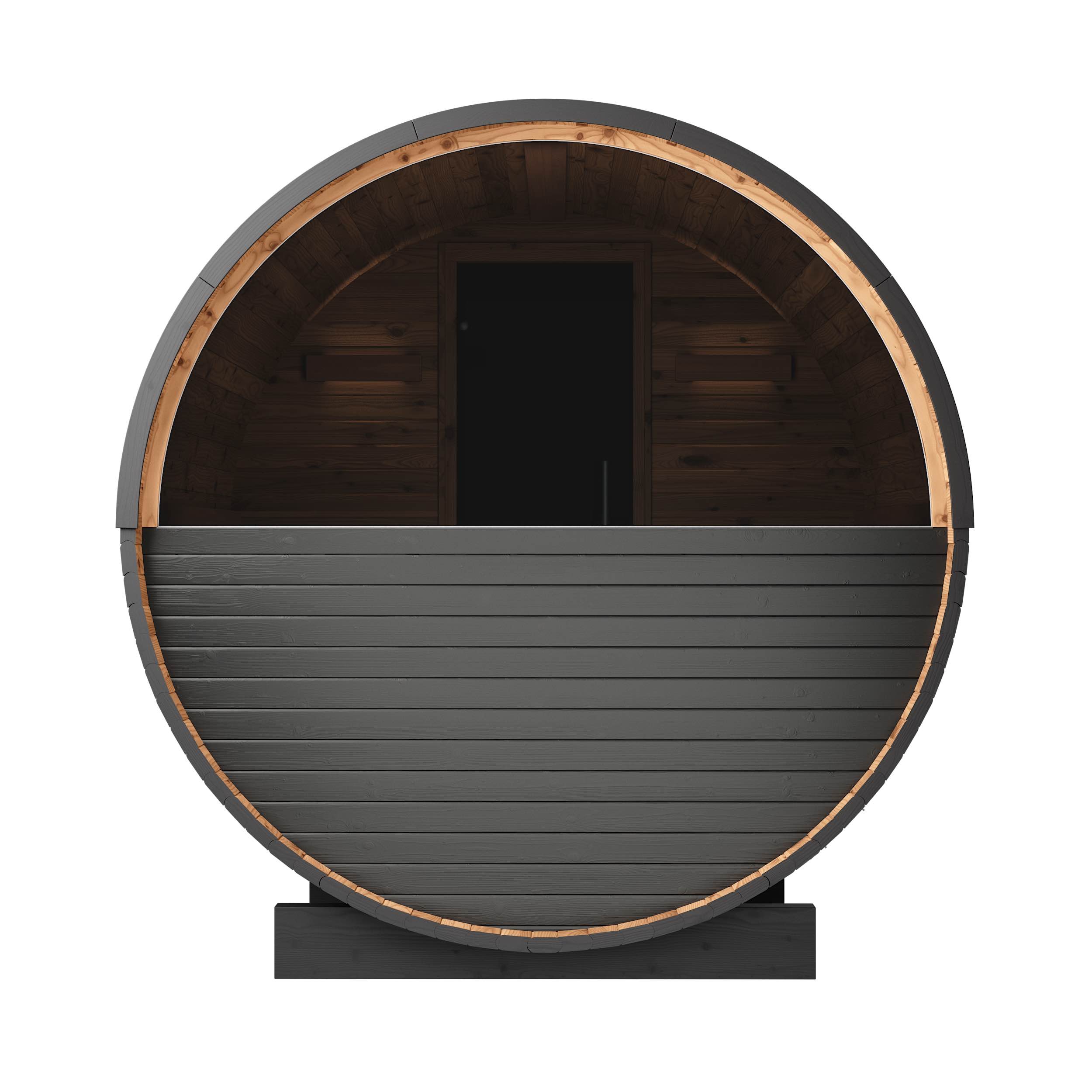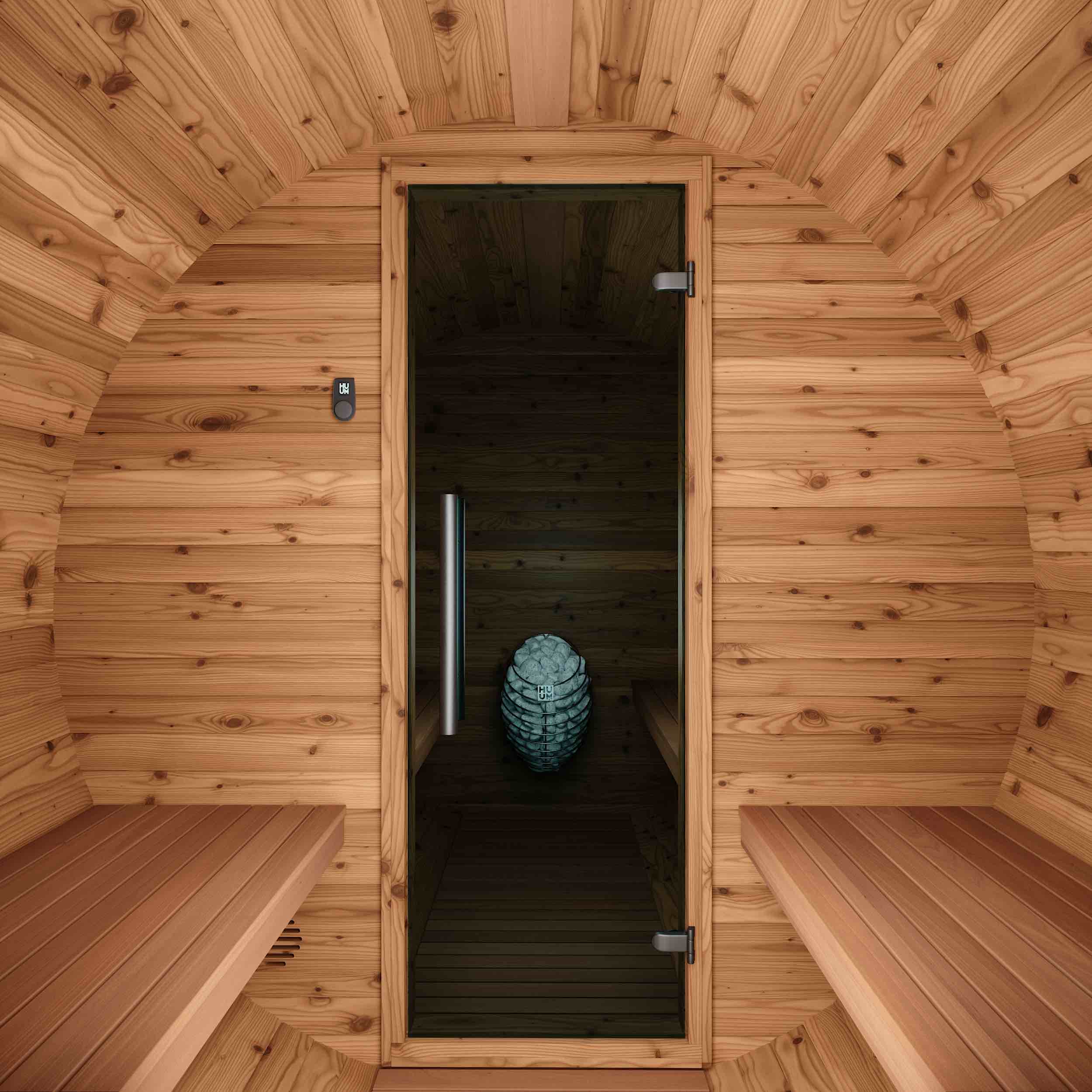 Genießen Sie die Ruhe der runden Form von Halo, die mit der natürlichen Umgebung harmoniert. Dieses Design wertet nicht nur Ihre Außenansicht auf, sondern sorgt auch für eine gleichmäßigere Wärmeverteilung in der Sauna.