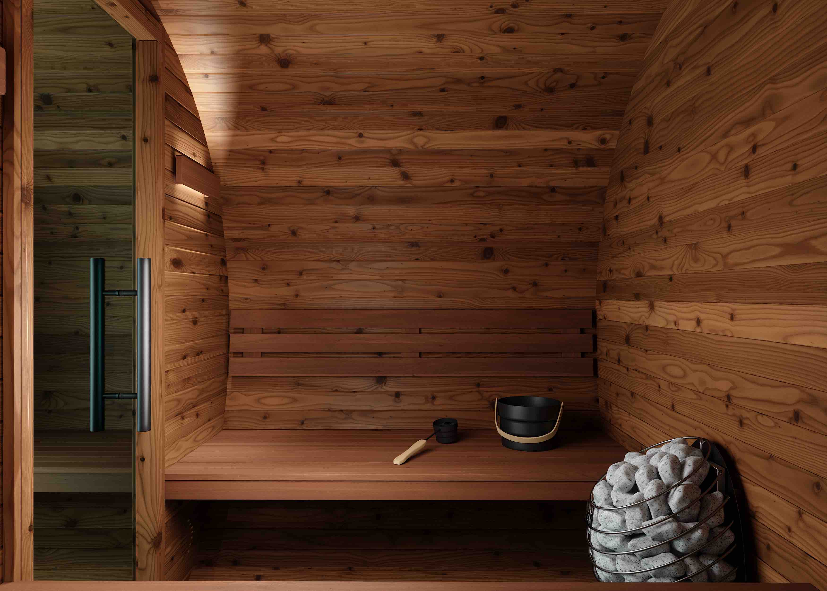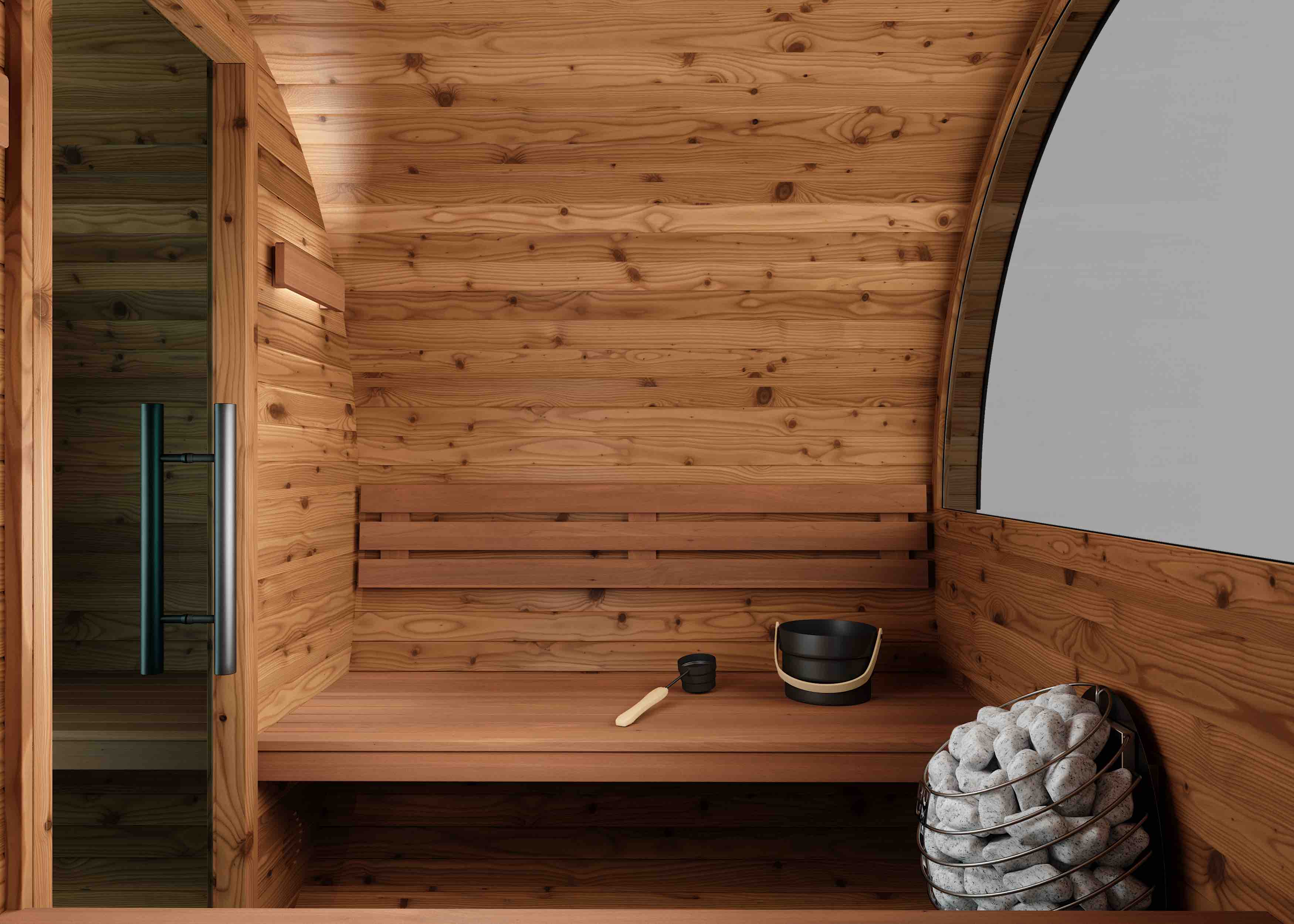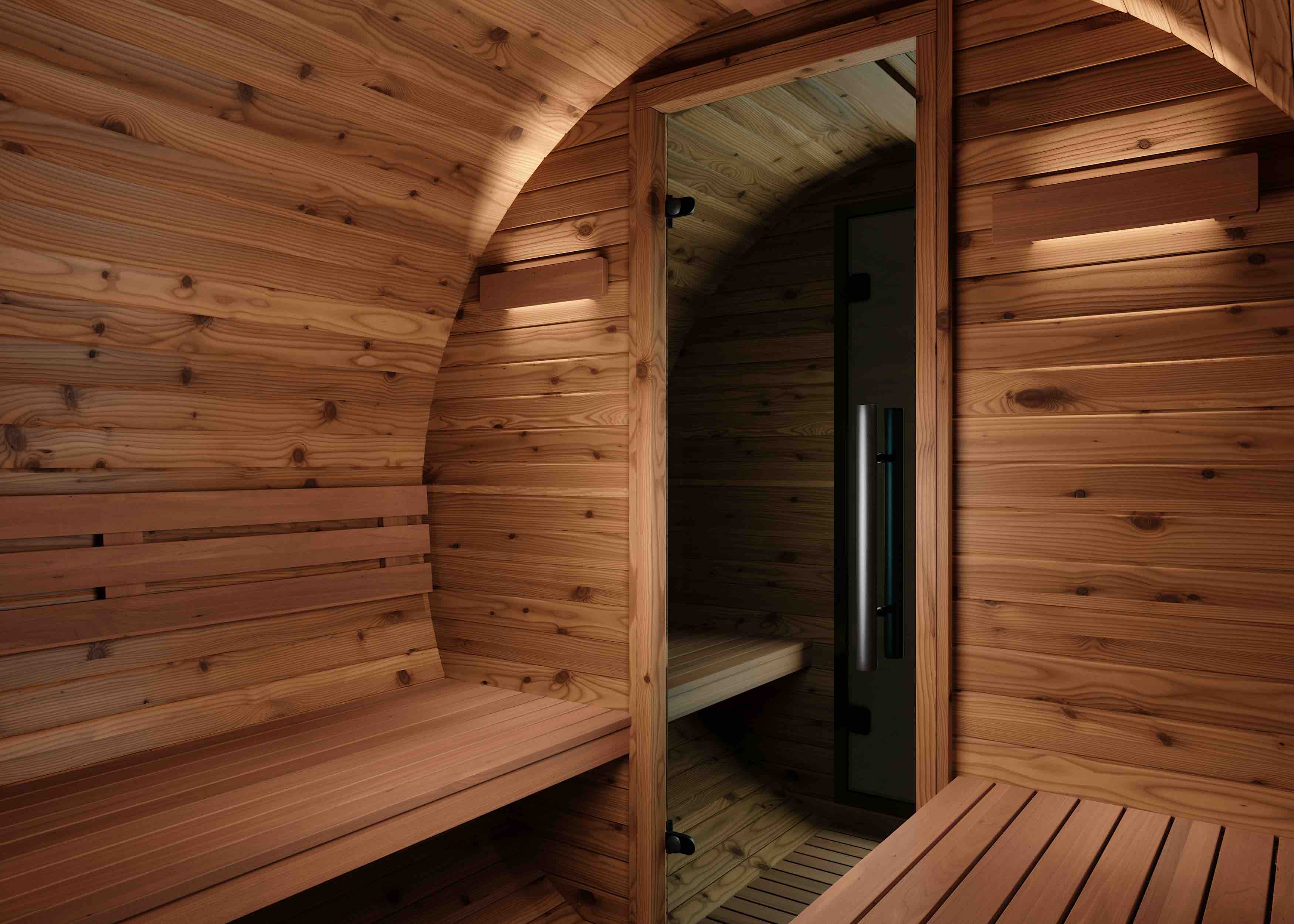Genießen Sie die Ruhe der runden Form von Halo, die mit der natürlichen Umgebung harmoniert. Dieses Design wertet nicht nur Ihre Außenansicht auf, sondern sorgt auch für eine gleichmäßigere Wärmeverteilung in der Sauna.
