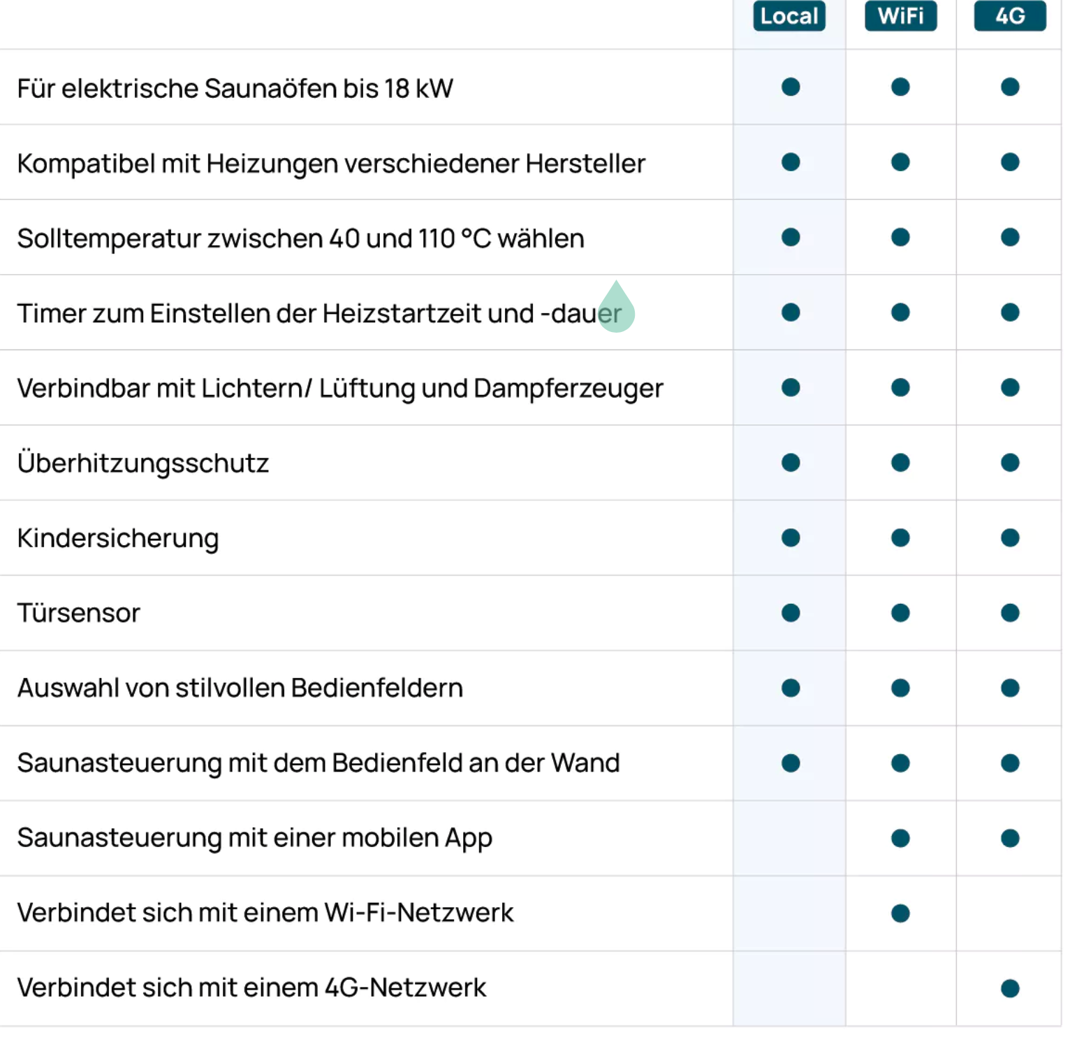 Sie können auch die Saunabeleuchtung, die Belüftung und den Verdampfer an das Steuersystem anschließen, um den Komfort zu erhöhen. Ein Überhitzungsschutz und eine Kindersicherung sorgen für die Sicherheit Ihrer Sauna.
