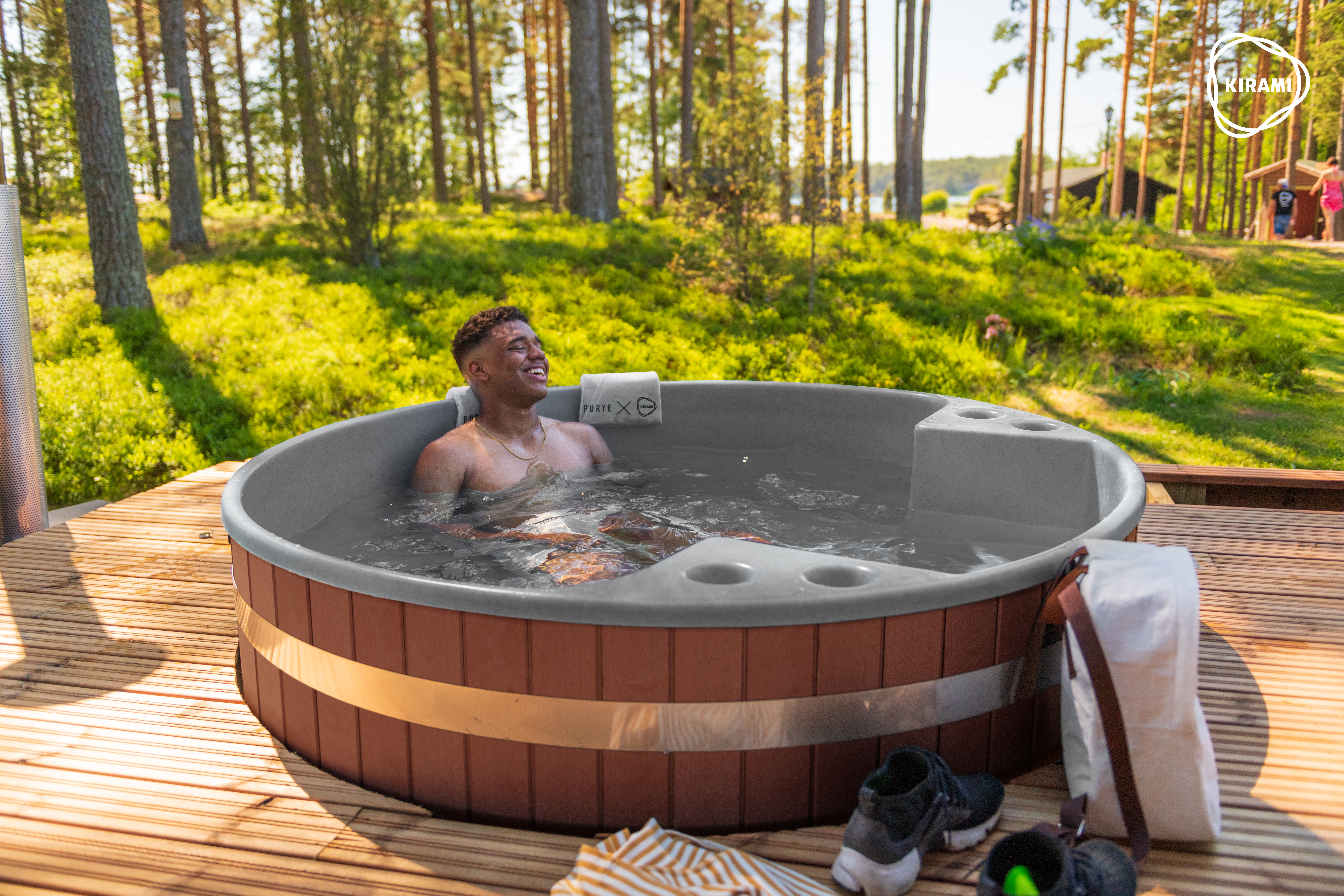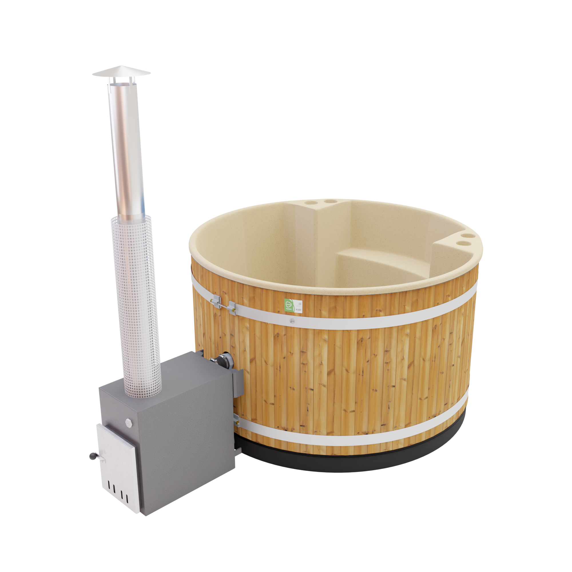 Die als Außenverkleidung dienende wärmebehandelte Kiefer ist eine einheimische Alternative zu dunklem Importholz. Thermoholz ist ein langlebiges und hochwertiges Material mit einem warmen braunen Farbton, welches seine Form beibehält. Die durchscheinende, samtweiche beige Innenwanne ist mit “Flöckchen-Effekt” nuanciert. Ein schöner, warmer Farbton verleitet zu Stundenlang baden.