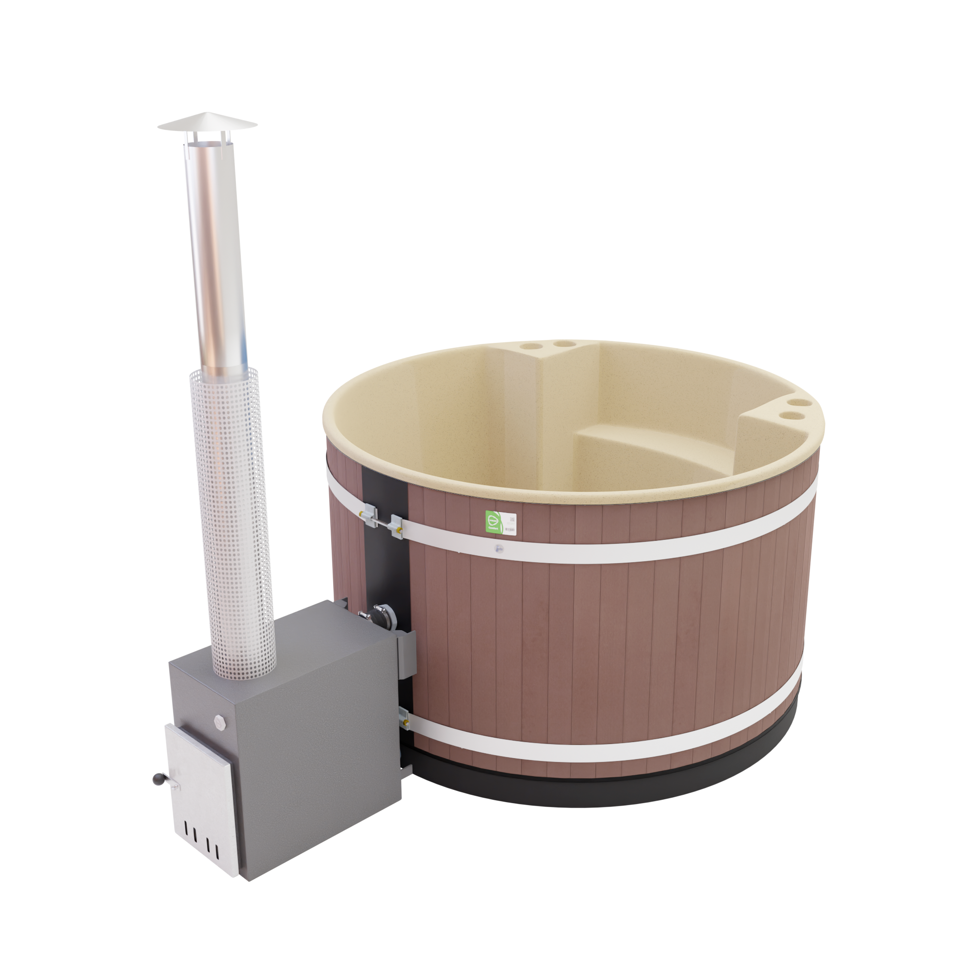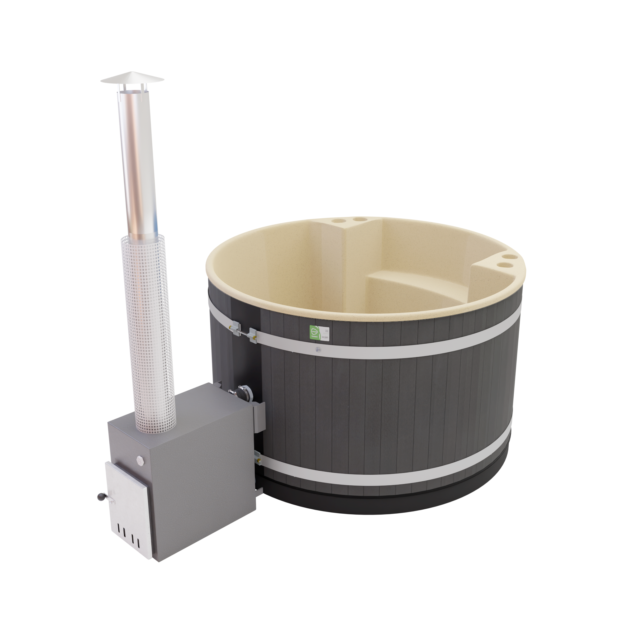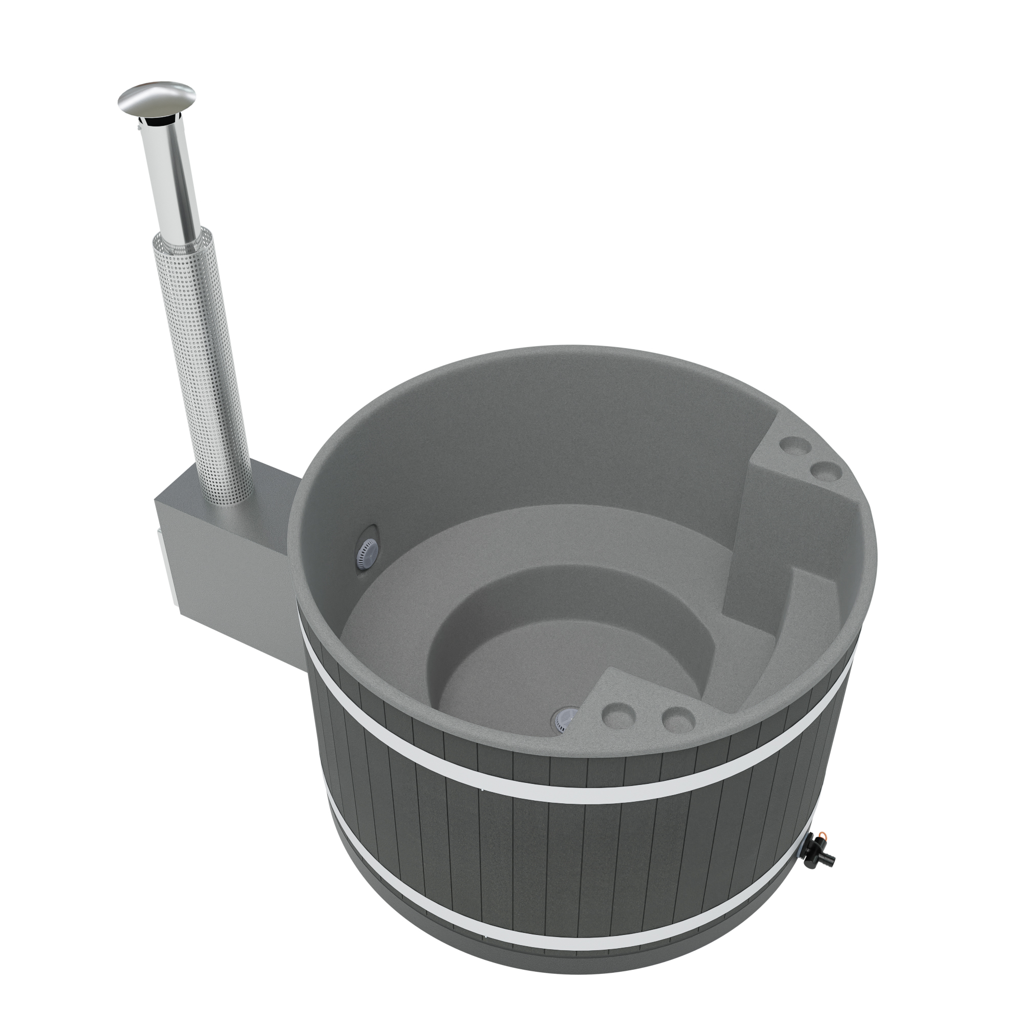 Als Außenofen kommt der grau gehaltene CULT-si zum Einsatz, der sich ideal zum Beheizen kleiner Badefässer eignet. Er wurde aus hochwertigem Meeresaluminium gefertigt, was eine äußerst gute Wärmeleitfähigkeit sicherstellt.