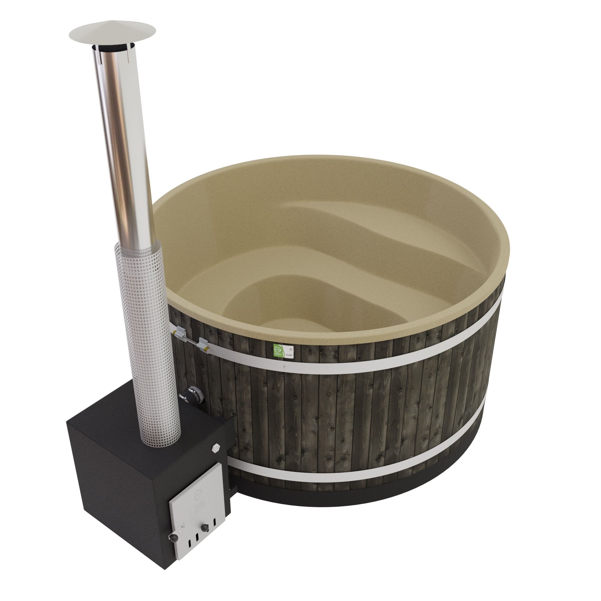 Als Außenofen kommt der schwarz gehaltene, leistungsfähige Cube zum Einsatz, der sich ideal zum Beheizen auch größer Badefässer eignet. Er wurde aus hochwertigem Meeresaluminium gefertigt, was eine äußerst gute Wärmeleitfähigkeit sicherstellt.