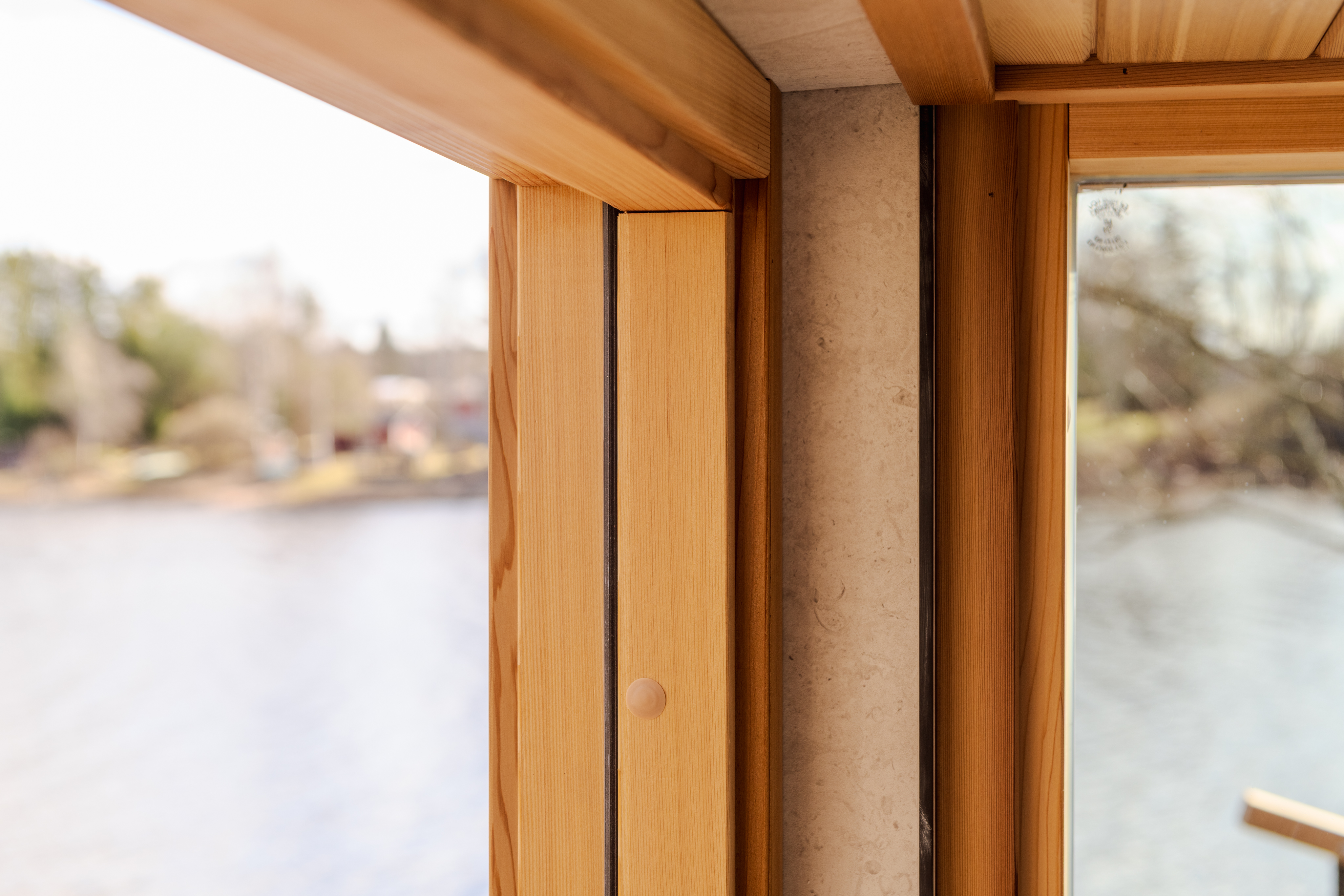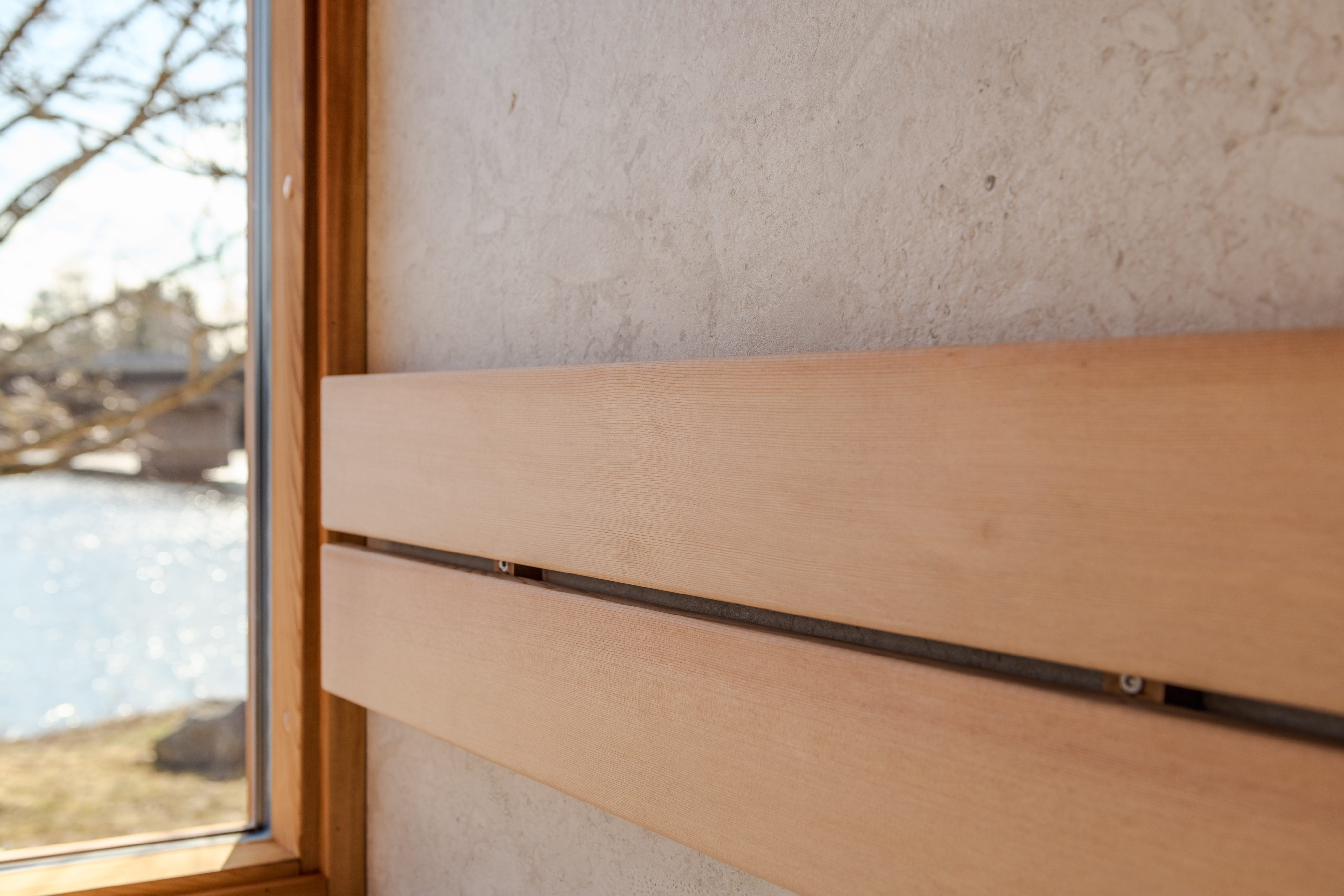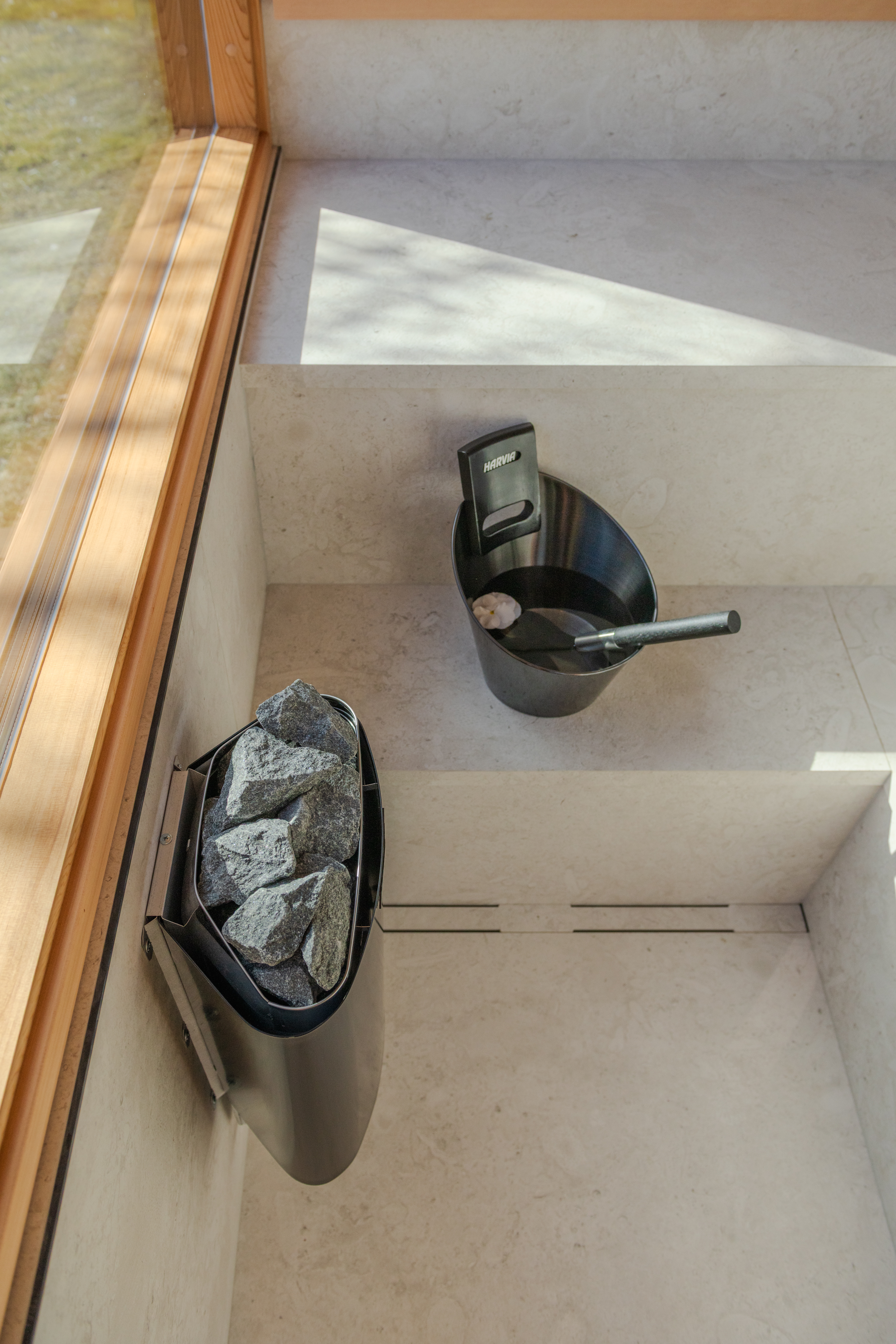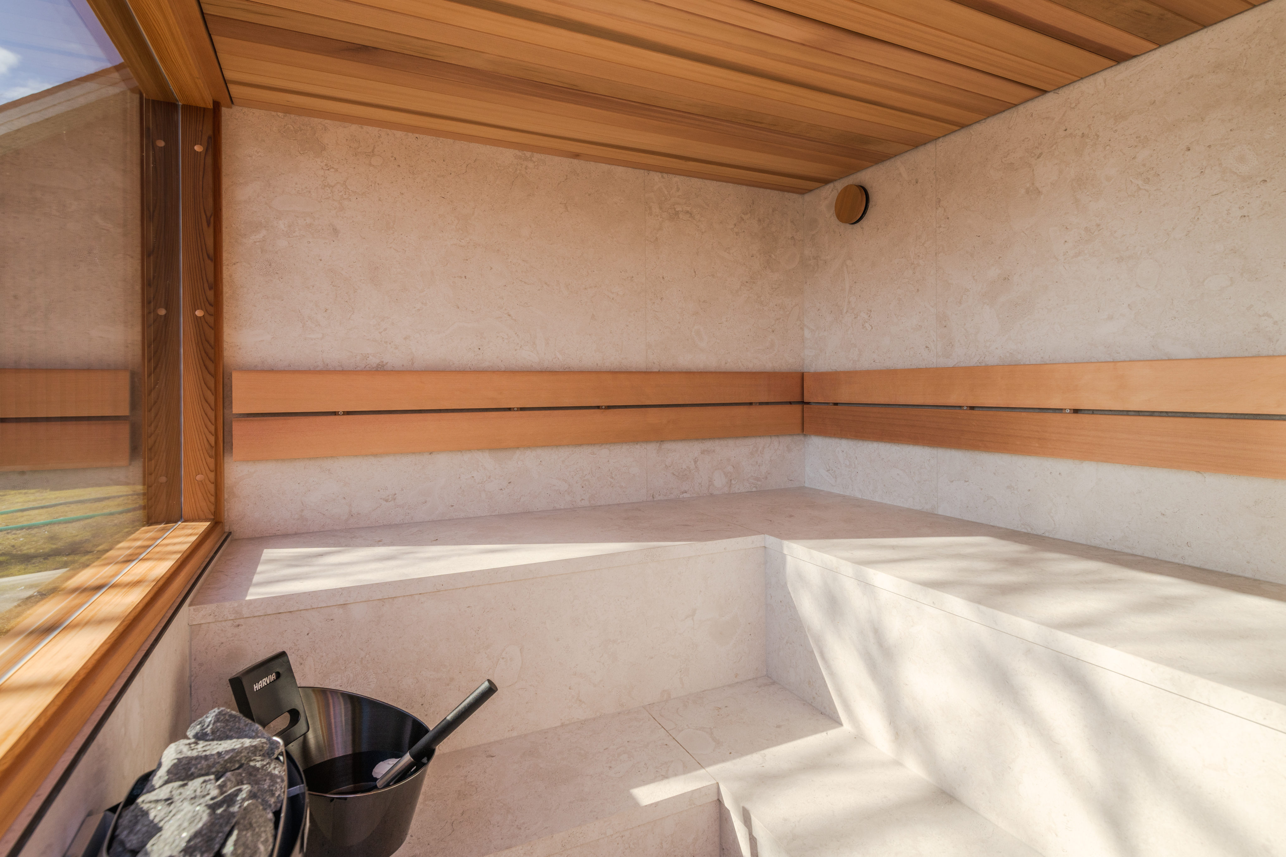 Die L-förmigen Bänke sind mit Fliesen in der gleichen Größe wie die Innen- und Außenflächen der Sauna belegt. Dank der geschlossenen Saunabänke beträgt der beheizte Innenraum energieeffiziente 5,06 Kubikmeter. Ein kleiner 3,6-kW-Ofen reicht zum Beheizen dieser Außensauna aus, während für eine ähnlich große Sauna üblicherweise ein 8–10-kW-Ofen benötigt wird.