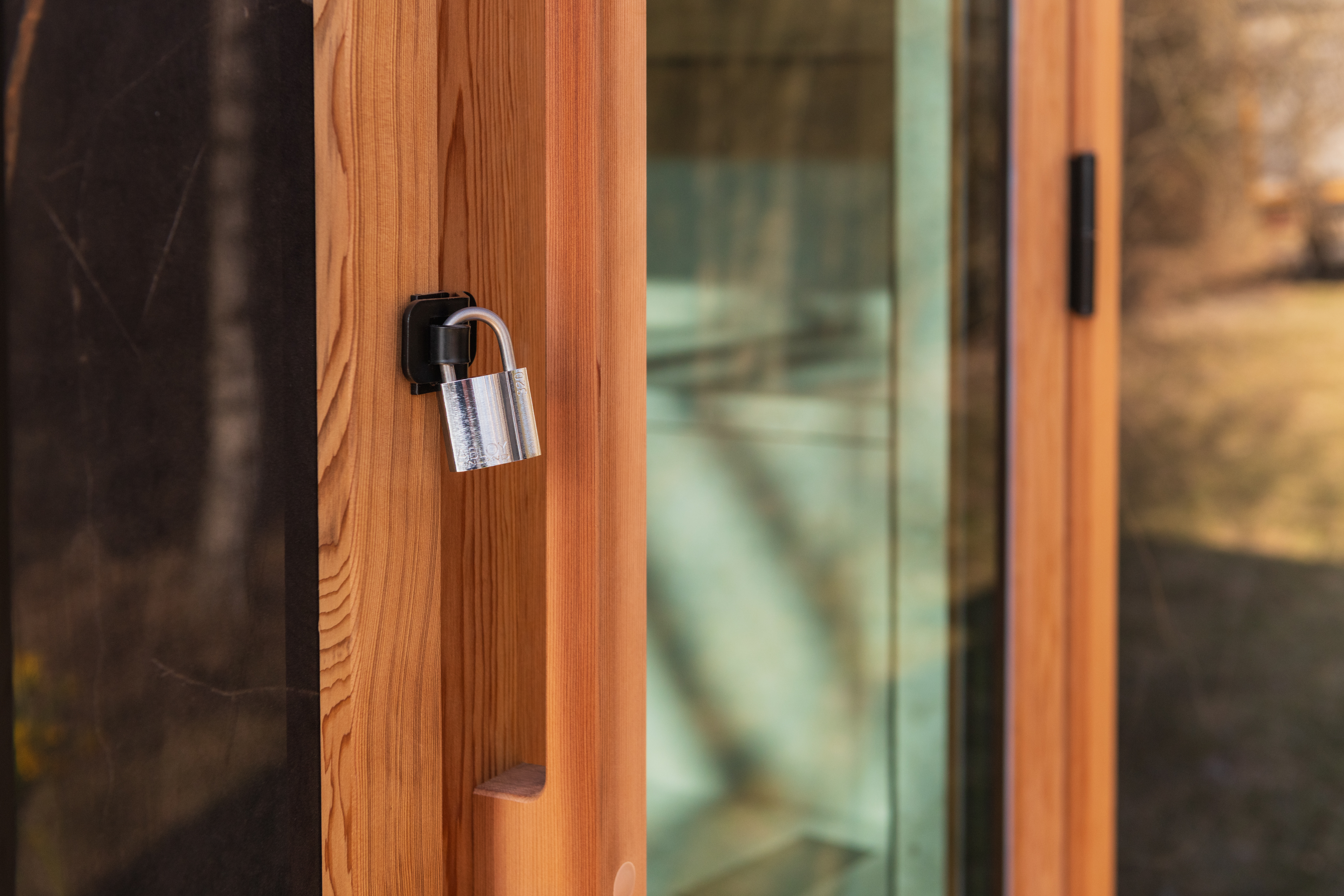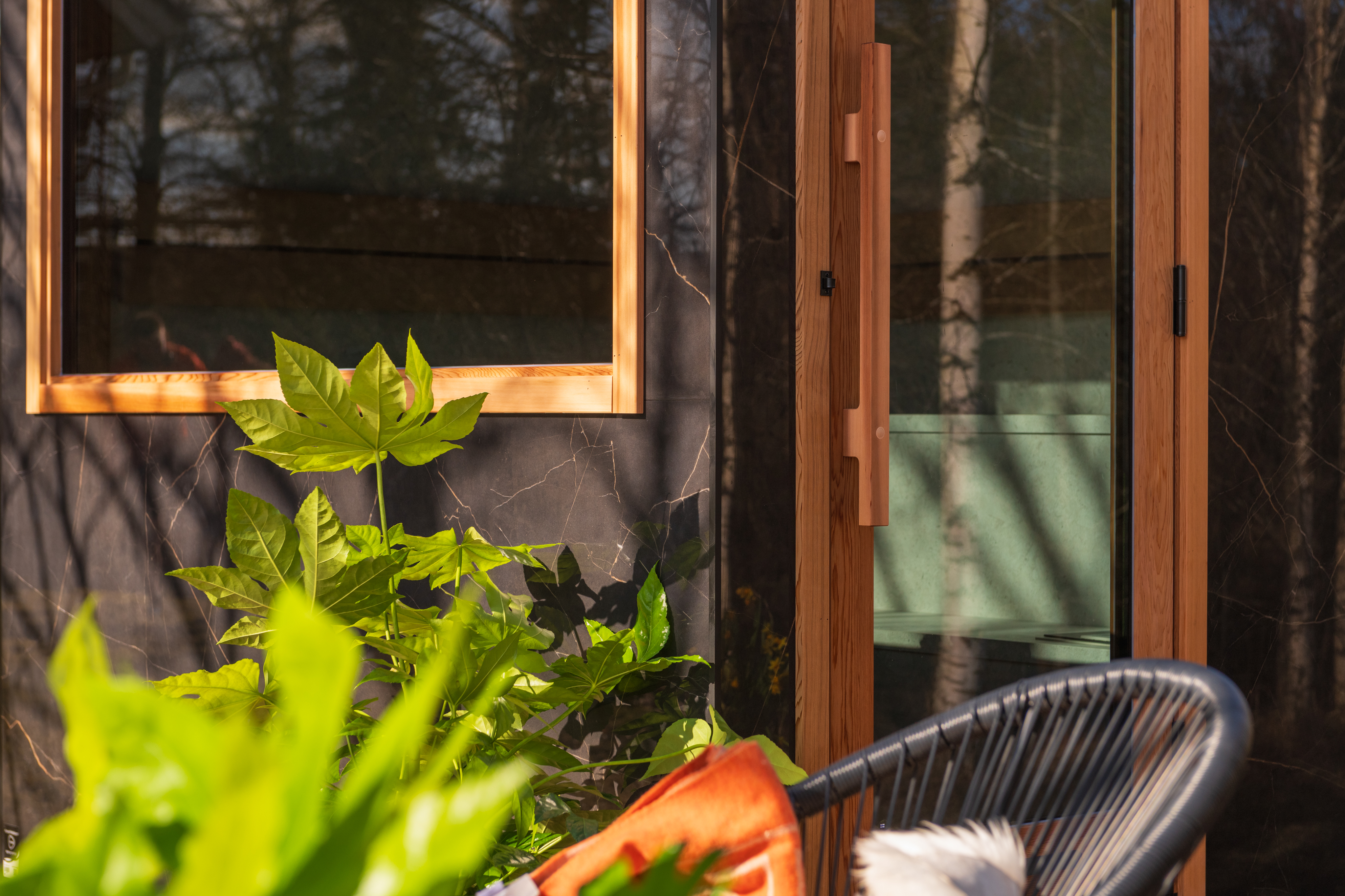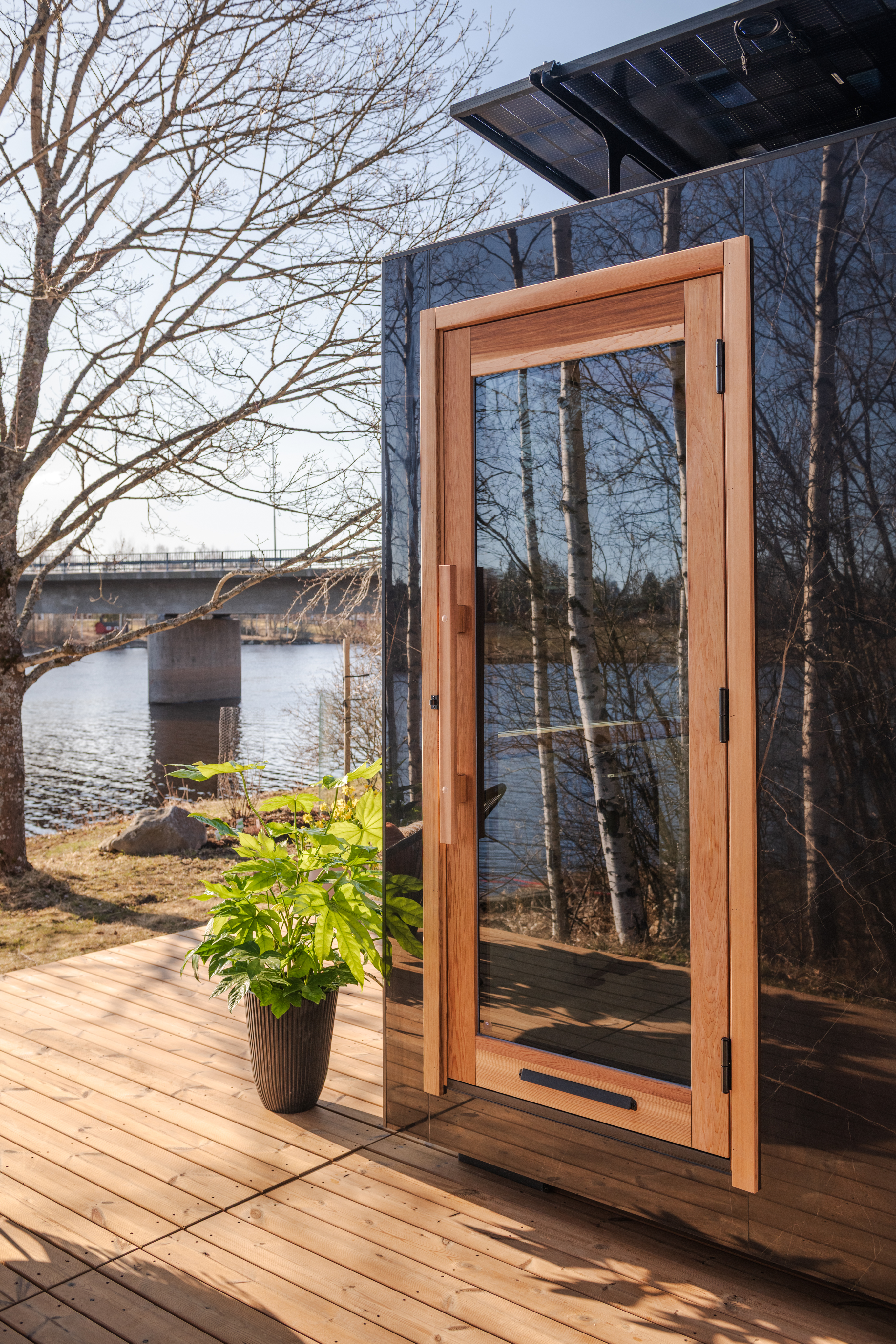 Die gesamte Konstruktion der Außensauna ist vollisoliert. Die dreifach verglasten Fenster und Türen aus grau getöntem, gehärtetem Thermoglas verbessern die Energieeffizienz der Sauna, während das Argongas zwischen den Glasschichten die Isolierung verbessert.