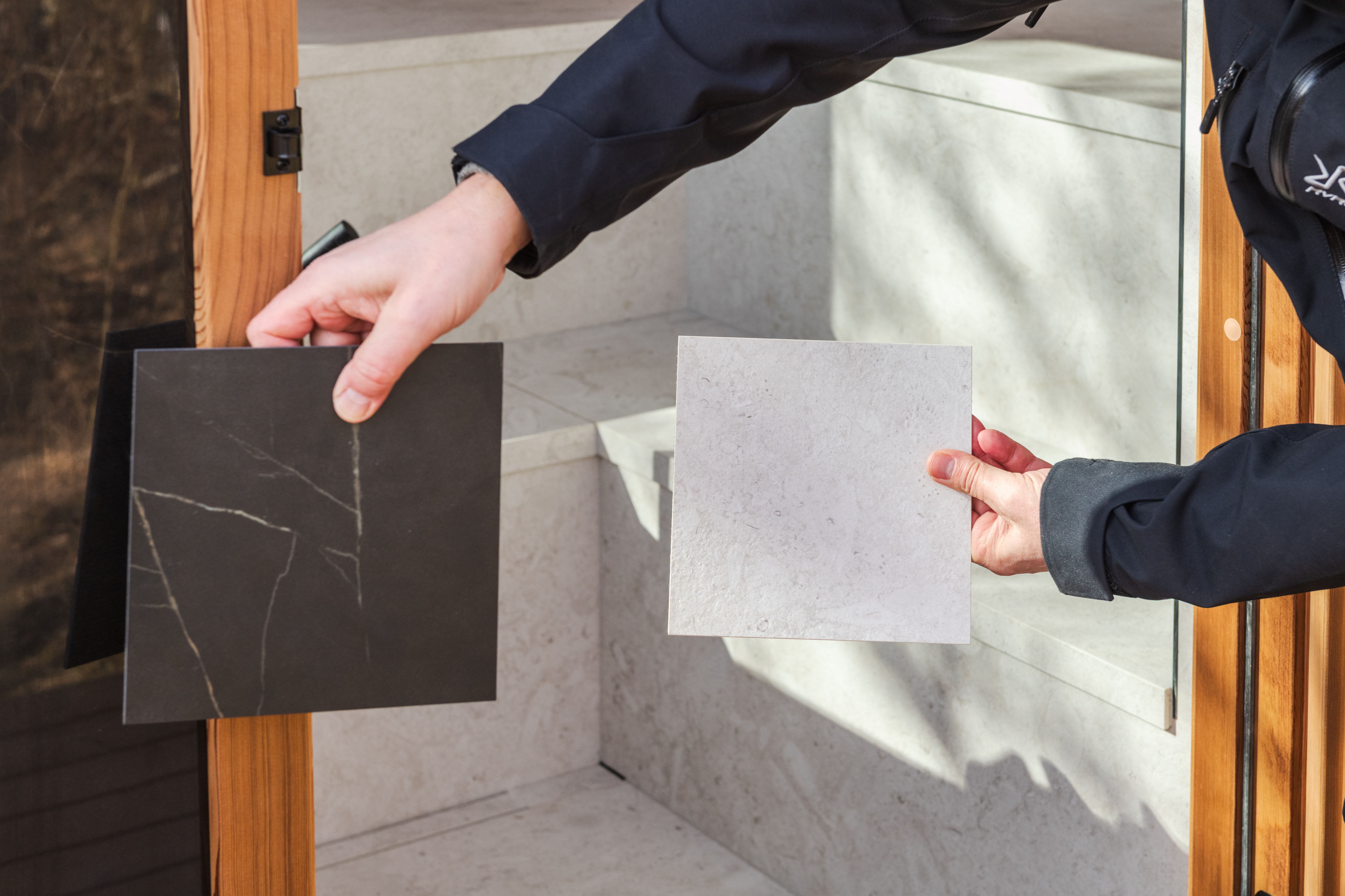 Die Außenverkleidung der Außensauna besteht aus langlebigen, stilvollen, großformatigen, tiefglänzenden schwarzen Fliesen, die moderne Eleganz, Raffinesse und Zeitlosigkeit ausstrahlen. Diese Fliesen sind leicht zu reinigen und haben eine UV-beständige Oberfläche. Die Innenflächen der Sauna sind mit stilvollen, langlebigen, großformatigen, korallenweißen Fliesen verkleidet, die der Größe der Außenfliesen entsprechen. Der Innenraum strahlt modernes Design und Funktionalität aus und verbindet finnische Traditionen mit anspruchsvoller europäischer Ästhetik.