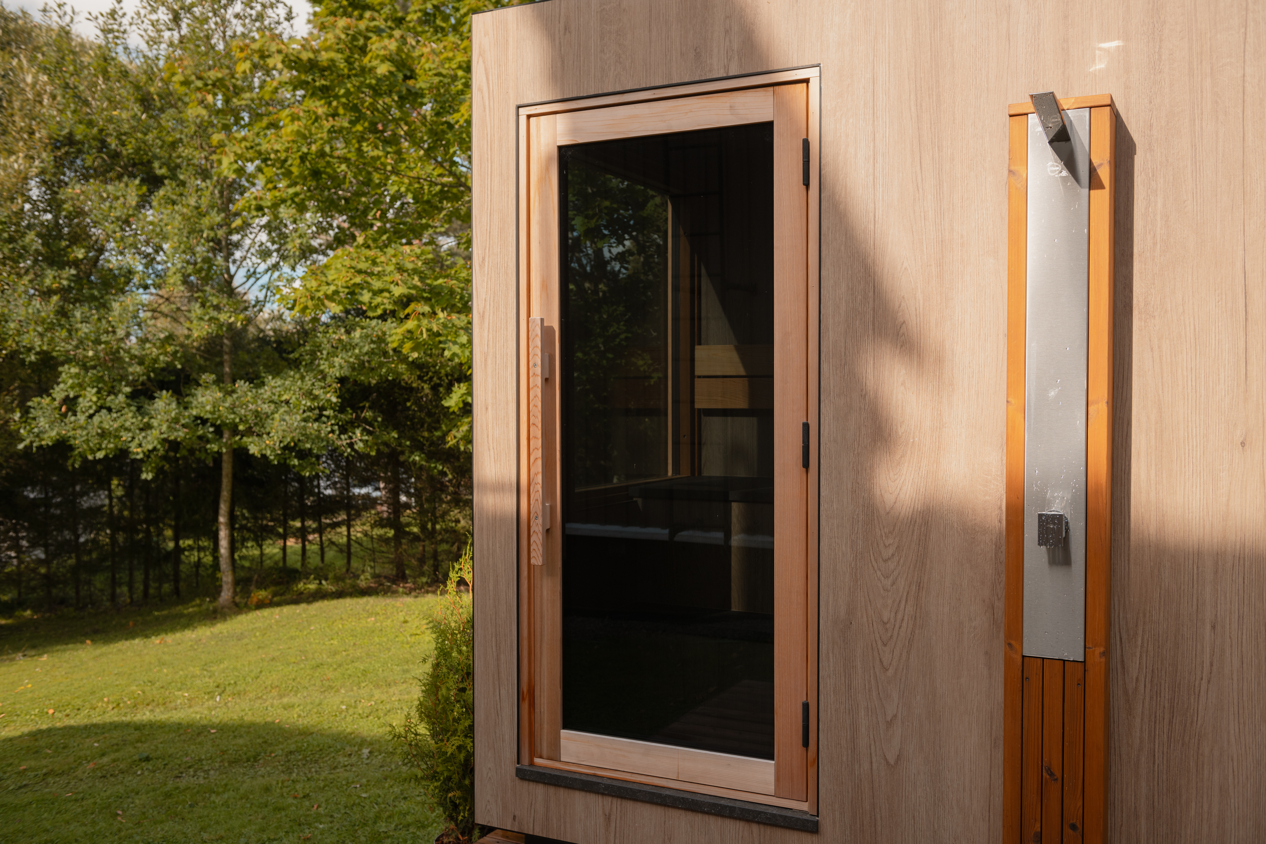 Die gesamte Konstruktion der Außensauna ist vollständig isoliert. Die dreifach verglasten Fenster und Türen aus grau getöntem, gehärtetem Thermoglas verbessern die Energieeffizienz der Sauna, während das Argongas zwischen den Glasschichten die Isolierung verbessert.