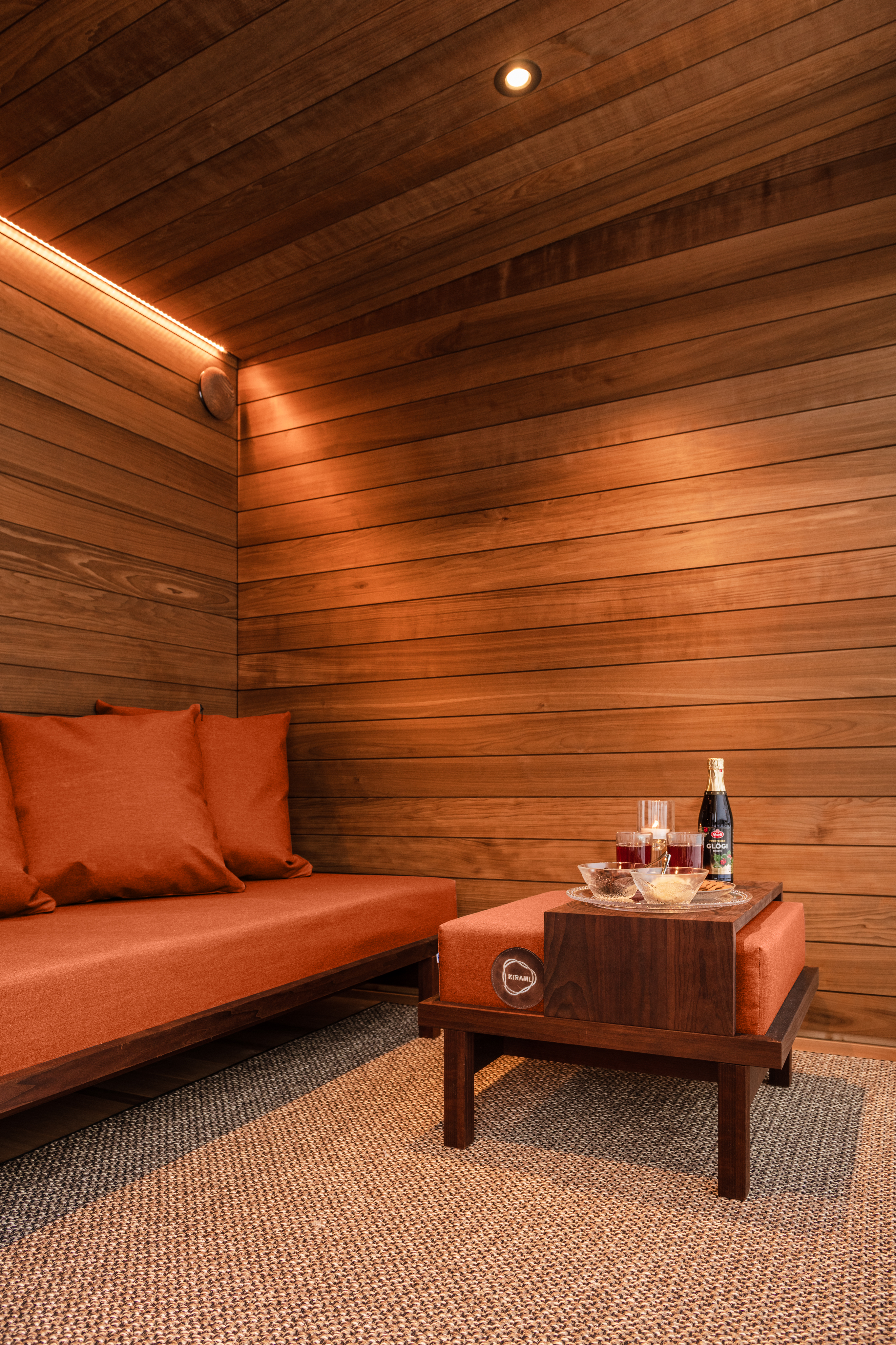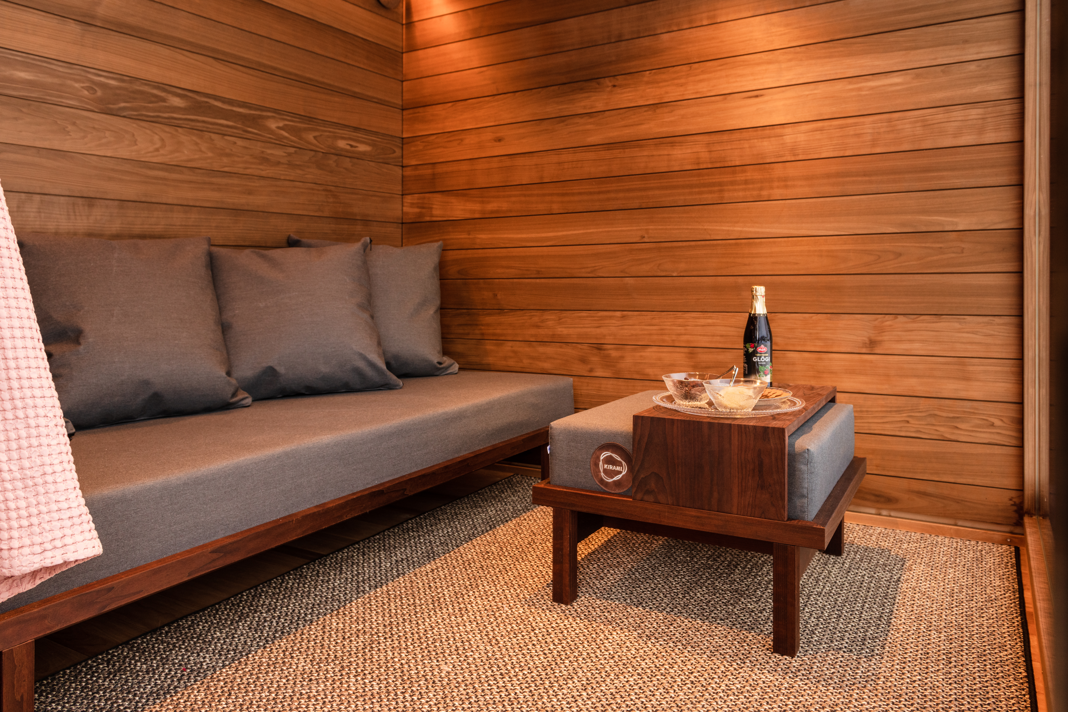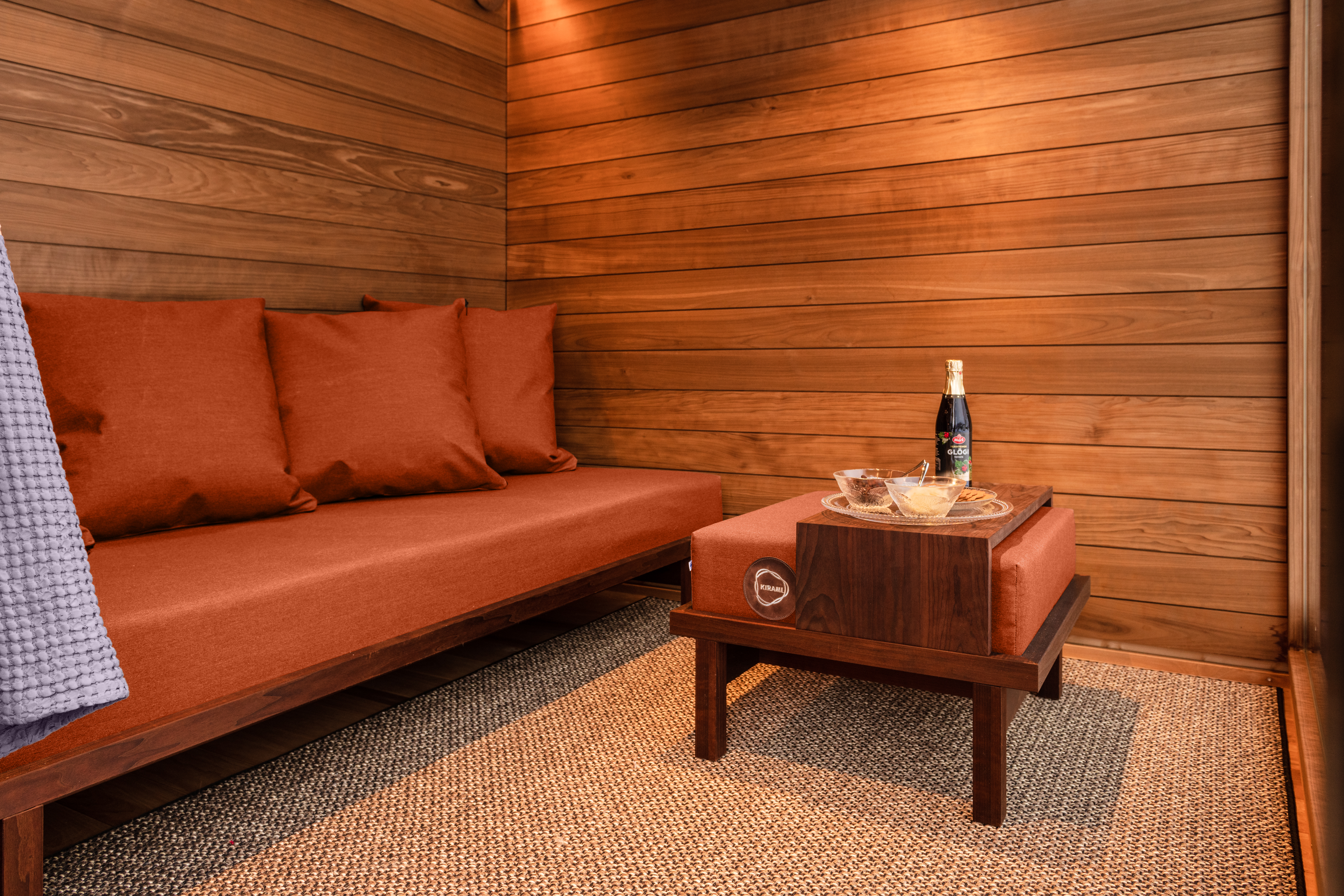 Der Stoff des Sofas ist auch für den Außenbereich geeignet, da er wasserdicht, UV- und schimmelresistent ist. Der Stoff ist mit einer schmutzabweisenden Teflon-Behandlung versehen, die einen ausgezeichneten Schutz bietet, wenn Sie sich etwa zum Trocknen nach der Sauna auf das Sofa setzen. Das Sitzkissen des Sofas dient als Schlafplatz und die vier großen und weichen Rückenkissen laden zum Anlehnen ein. Um sich vollständig zu entspannen, empfiehlt es sich, zwischendurch die Füße auf den Polsterhocker zu legen oder den Hocker zusammen mit dem Tablett als Tisch zu benutzen. Das robuste Tablett bleibt mitsamt Ihrer darauf platzierten Leckereien sicher auf seinem Platz auf dem Hocker und kann auf Wunsch entfernt werden. Die weichen Teile des Polsterhockers sind mit dem gleichen orangefarbenen Stoff wie das Sofa überzogen, und das Tablett ist wie das Gestell des Sofas und des Polsterhockers aus wärmebehandelter Massivholz gefertigt. Alle Teile der Garnitur wurden stilistisch perfekt aufeinander abgestimmt und unterstreichen so die Gemütlichkeit der Kirami FinVision® -Lounge.