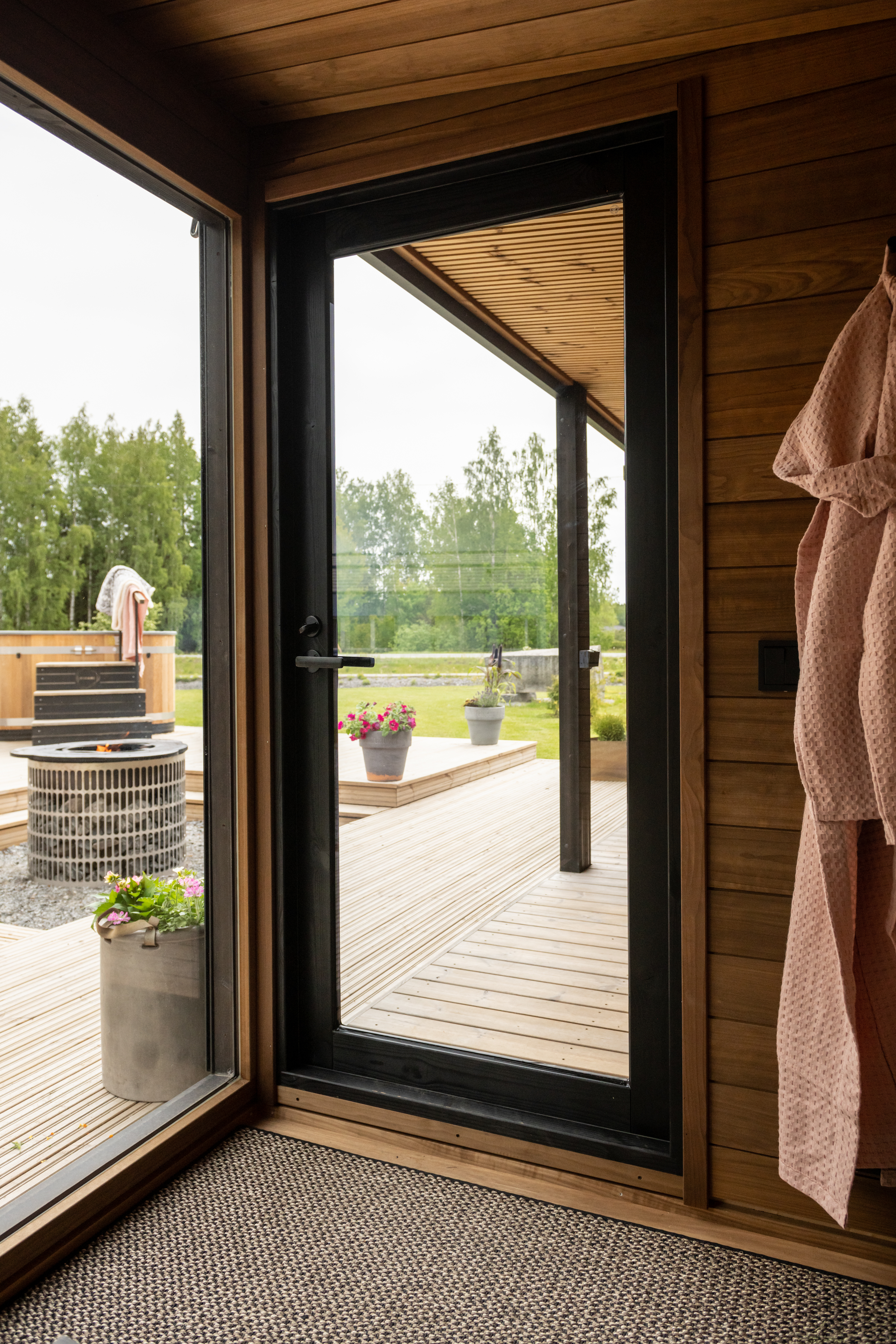 Eine rauchgraue, abschließbare Glastür mit einem schwarzen Holzrahmen schafft eine gemütliche Atmosphäre und ein Gefühl von Weite in der Lounge. Die hochwertige Thermoglastür ist solide gebaut und bleibt gut geschlossen. Die Anzahl der Türen der Lounge M hängt von der Wahl des Kunden ab und davon, ob die Lounge M neben der Sauna platziert oder als separates Modul aufgestellt wird.