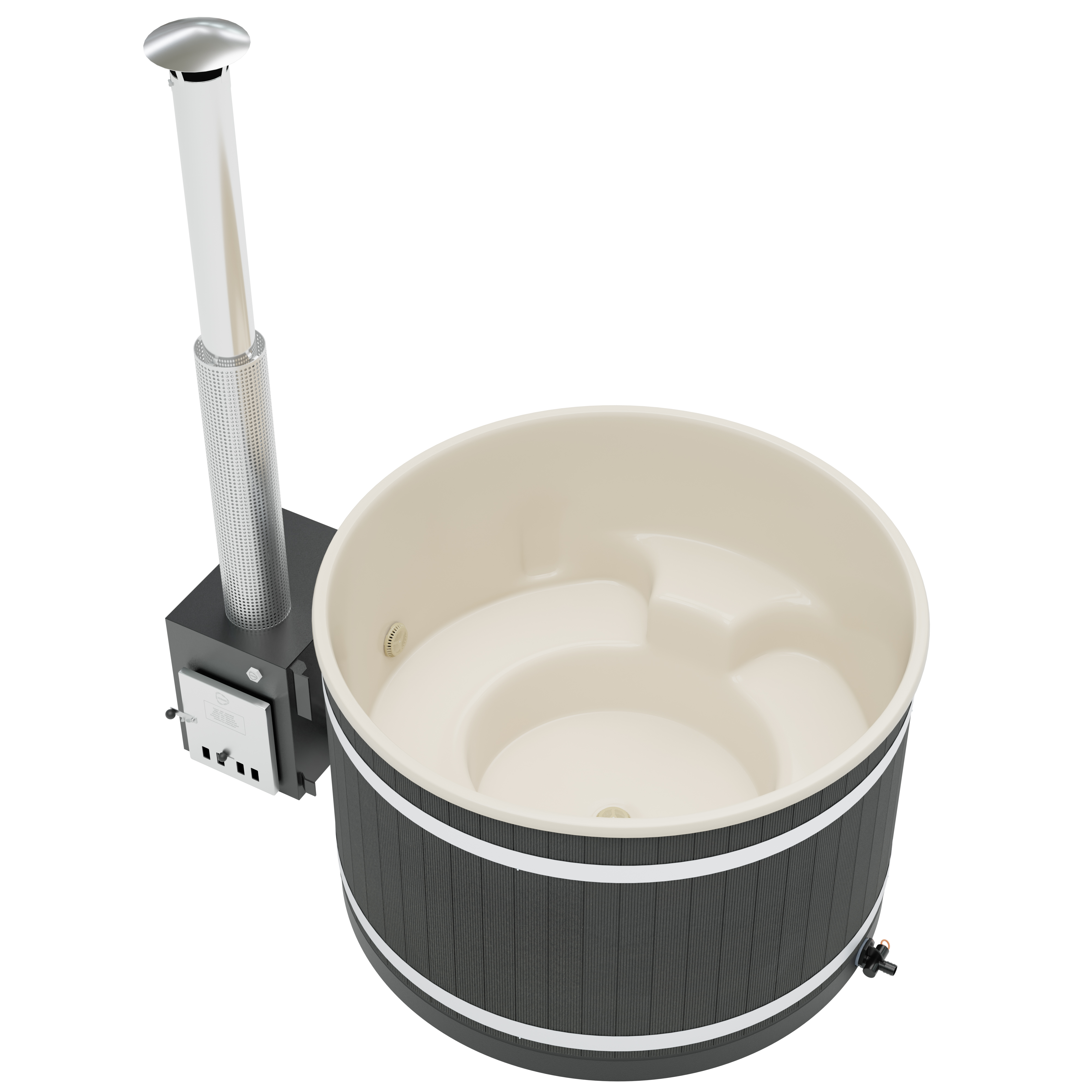 Als Außenofen kommt der schwarz gehaltene, leistungsfähige Cube zum Einsatz, der sich ideal zum Beheizen auch größer Badefässer eignet. Er wurde aus hochwertigem Meeresaluminium gefertigt, was eine äußerst gute Wärmeleitfähigkeit sicherstellt.