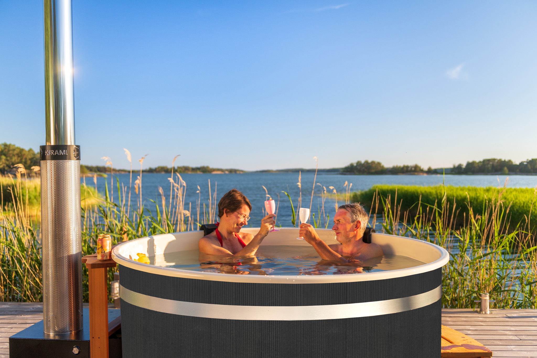 Als Außenverkleidung dienen dunkelbraune, gerillte Paneele aus recyceltem Kunststoff, die sich für ein moderner Umfeld eignen. Die gerillte Oberfläche lässt sich leicht reinigen und erfordert abgesehen von der Wäsche keine Instandhaltung. Champagne ist klar und luxuriös Wahl als Innenfarbe. Dieses elegante und fabelhafte Interieur garantiert unvergessliche und romantische Bademomente.