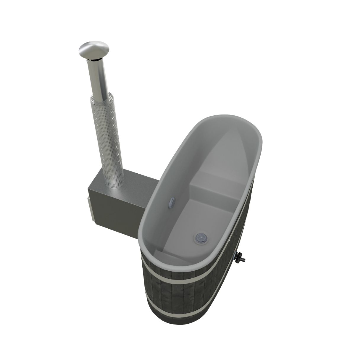Als Außenofen kommt der grau gehaltene CULT-si zum Einsatz, der sich ideal zum Beheizen kleiner Badefässer eignet. Er wurde aus hochwertigem Meeresaluminium gefertigt, was eine äußerst gute Wärmeleitfähigkeit sicherstellt.