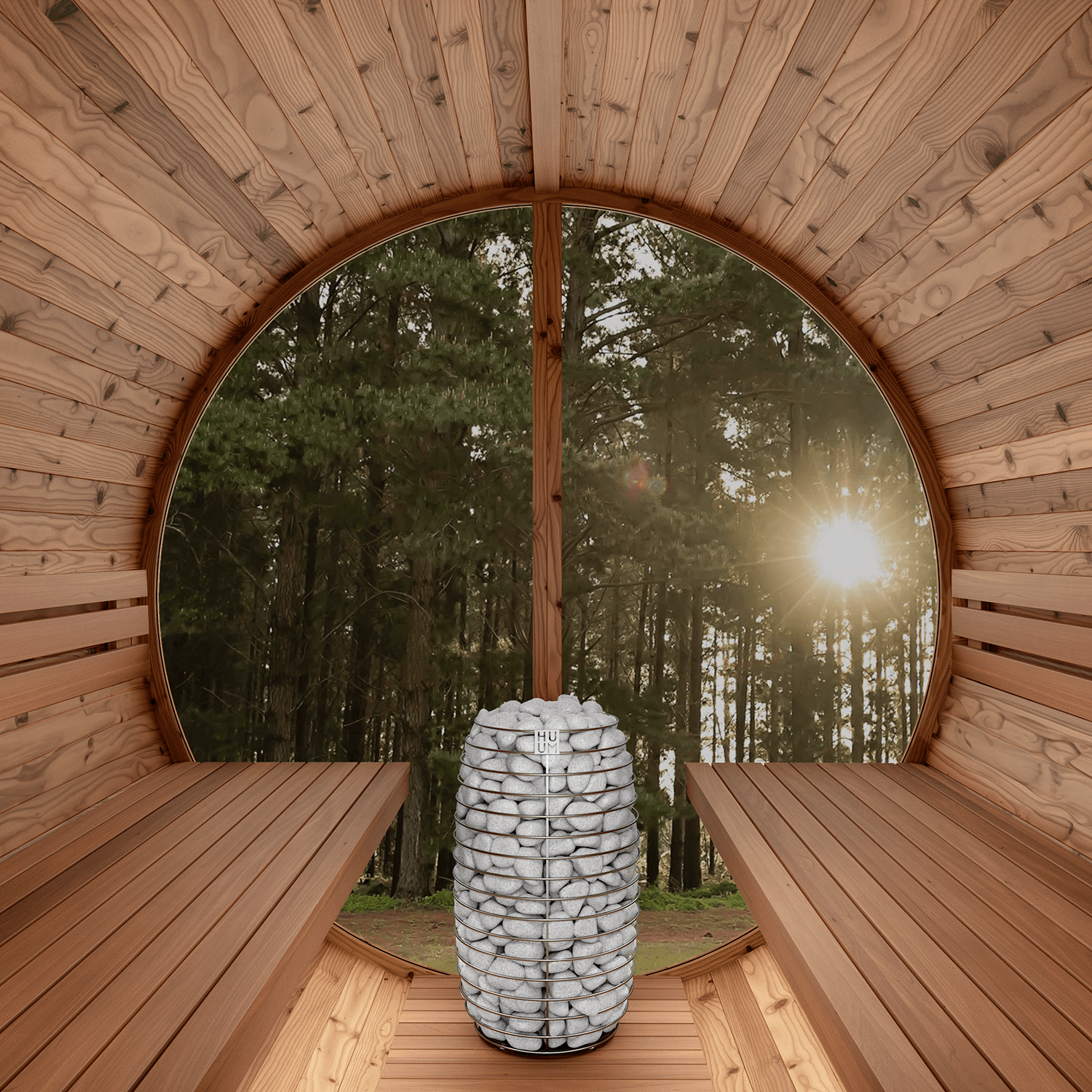 Genießen Sie die Ruhe der kreisförmigen Form von Luma, die mit der natürlichen Umgebung harmoniert. Dieses Design wertet nicht nur Ihre Außenansicht auf, sondern sorgt auch für eine gleichmäßigere Wärmeverteilung in der Sauna.