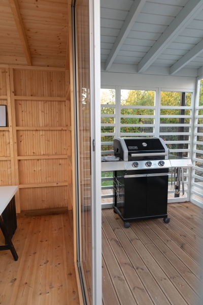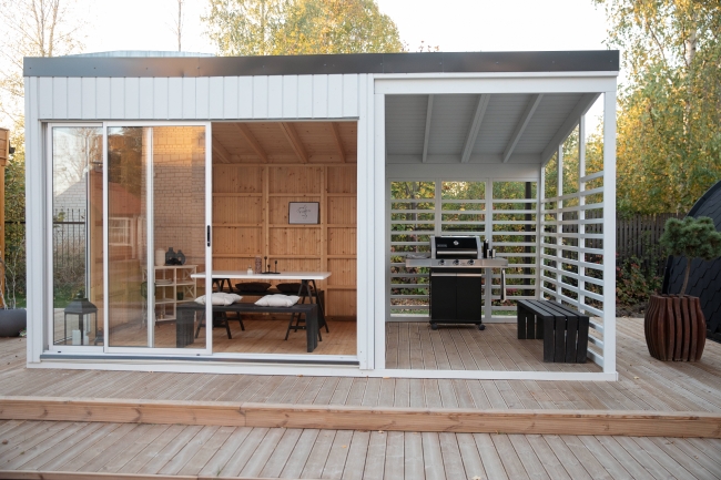 Die neue Überdachung ist stilvoll und hat ein sehr praktisches Layout. Das neue zweiteilige Modell kann als Sommerküche, Gartenhütte, Grillplatz, Treffpunkt für junge Leute oder als persönliches Atelier dienen, in dem Kreativität anfängt zu fliegen. ... Es ist eine Mehrzweckbarriere, die sowohl für das moderne als auch für das traditionelle Haus geeignet ist.