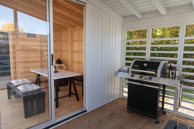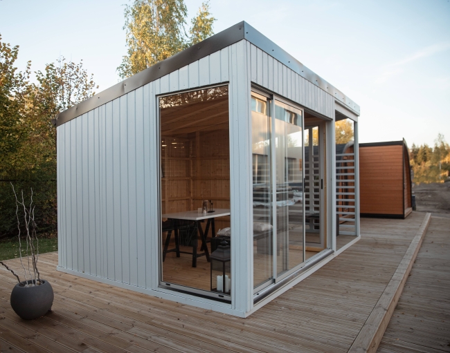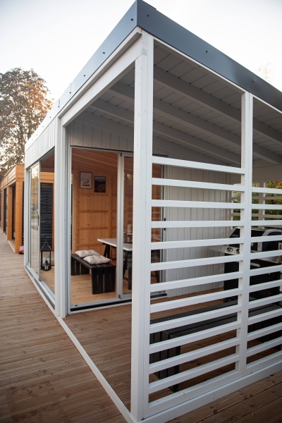 Die abschließbaren Schiebetüren des Easy Cube sind in zwei Seiten integriert. Bei gutem Wetter können die Schiebetüren geöffnet und der Erweiterungsraum in einen einheitlichen Raum integriert werden.