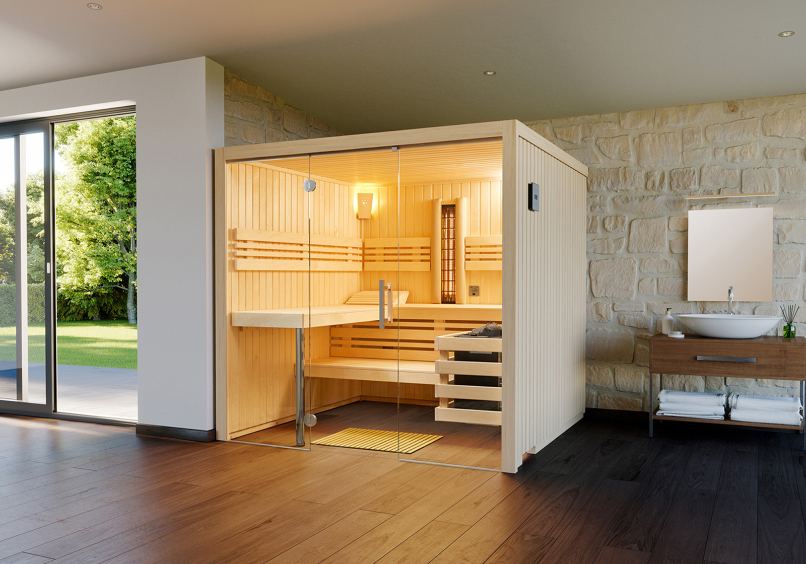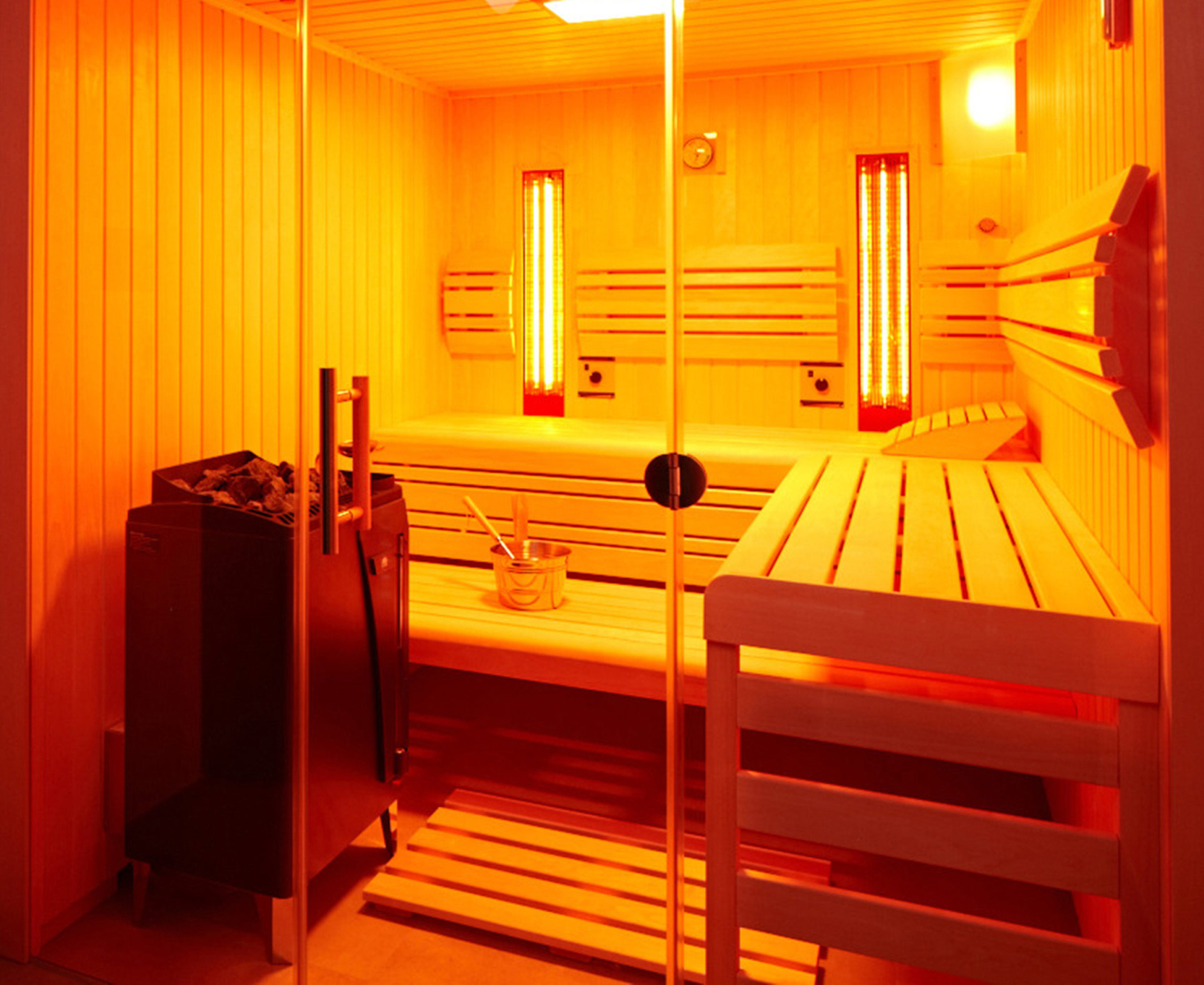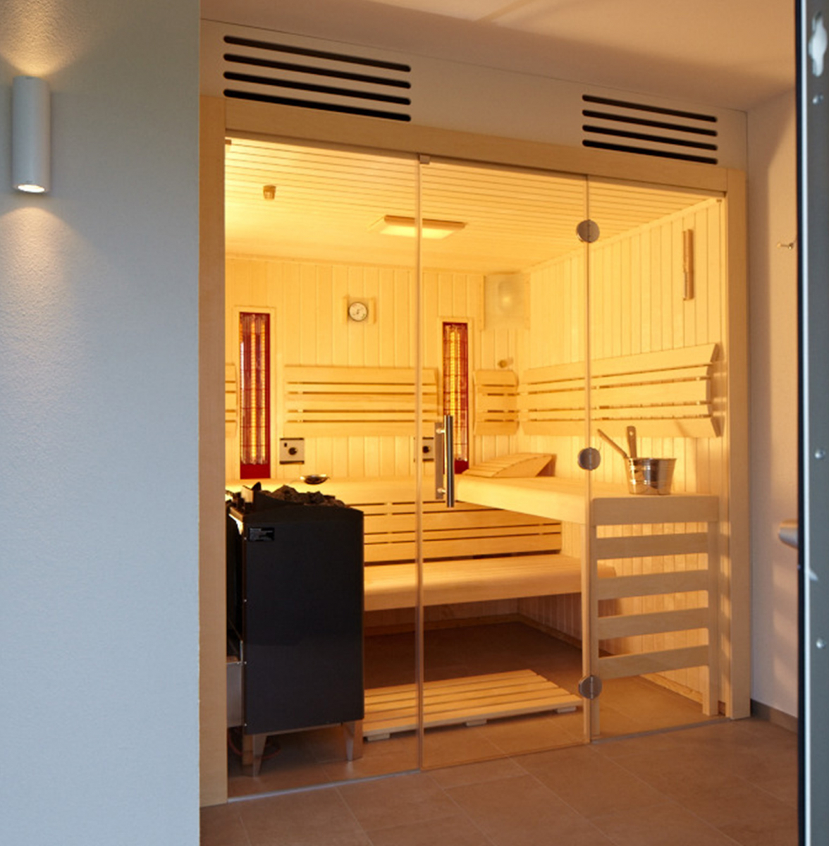 - bequemen Liegen mit einer Breite von 58 cm (bei kleinen Saunen 48 cm breit)