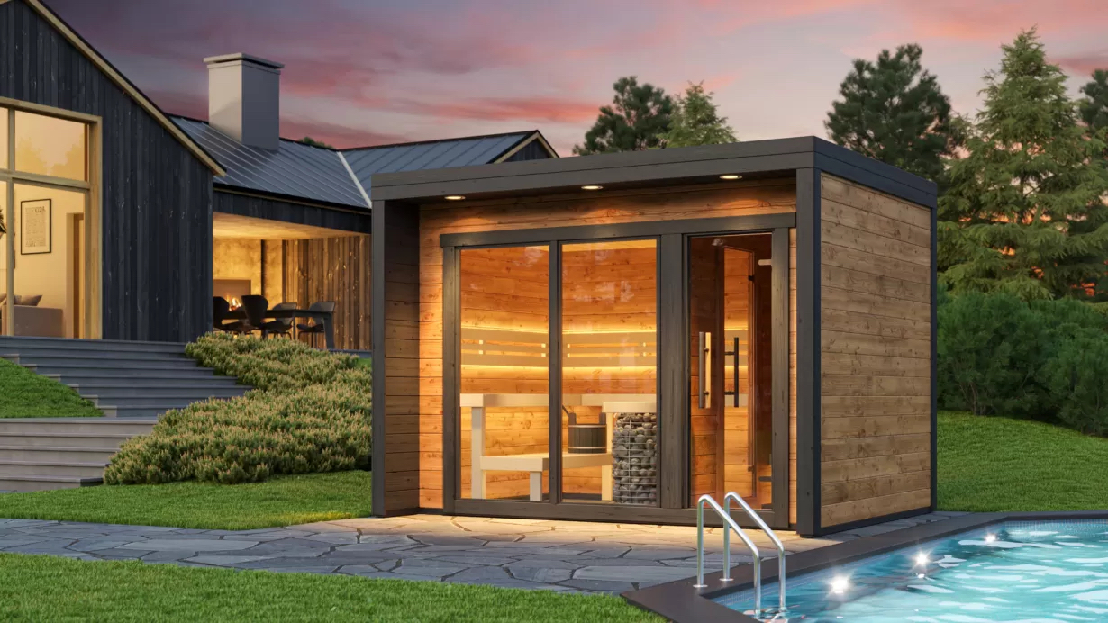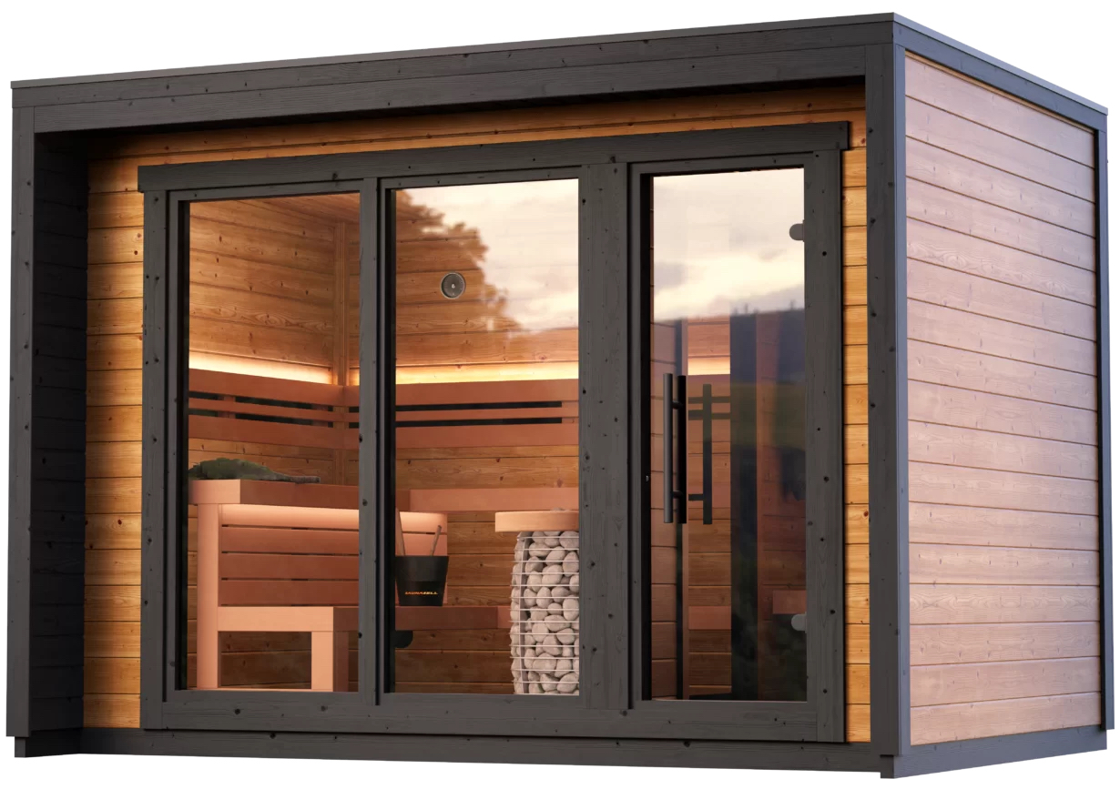 Die Patio M ist eine praktische Zweiraumsauna. Der Vorraum ist der perfekte Ort zum Abkühlen zwischen den Saunagängen.