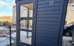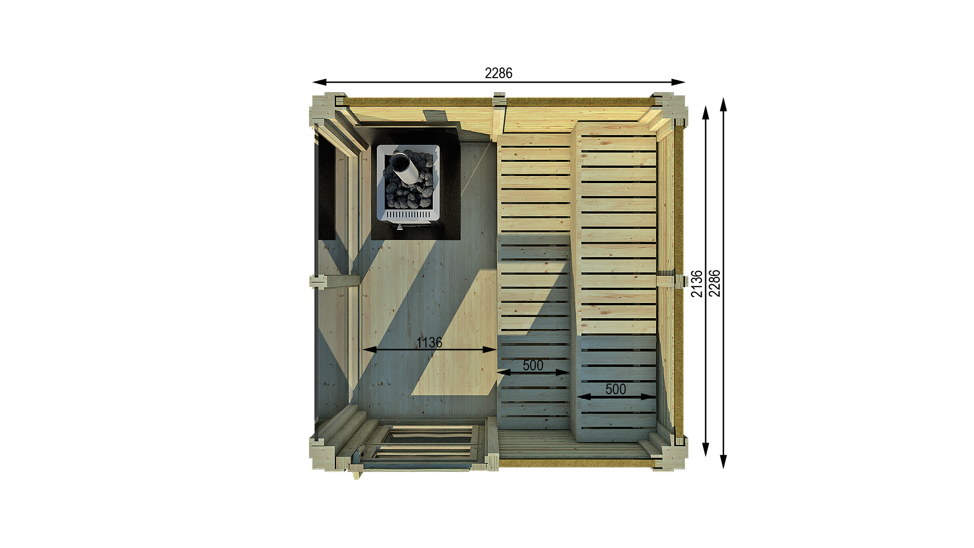 Im Inneren der Sauna: Die 2 Saunabänke 500 x 2136 mm (BxL) wurden aus Laubholz hergestellt; Das Saunaraumvolumen beträgt 17 m3. Die Tür der Sauna besitzt Maße von 819 x 2032 mm (aus Fichte) mit großen Hartglasfenstern und Schloss.