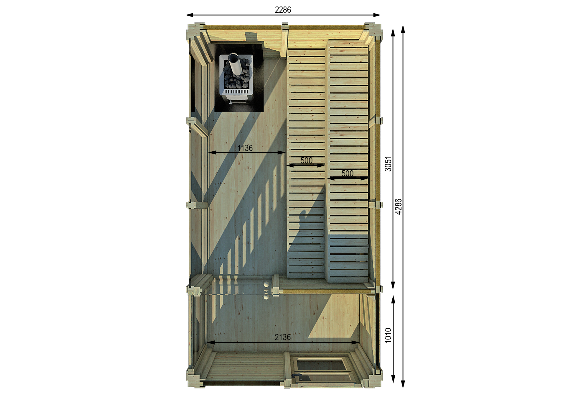 Im Inneren der Sauna: Die 2 Saunabänke 500 x 2136 mm (B x L) wurden aus Laubholz hergestellt; Das Saunaraumvolumen beträgt 24 m3. Die innere Glastür ist aus gehärtetem braun getöntem Glas. Die Türgröße beträgt 698 x 1855 mm, die Dicke des gehärteten Glases beträgt 8 mm. Die Außentür der Sauna besitzt Maße von 819 x 2032 mm (aus Fichte) mit großen Hartglasfenstern und Schloss.