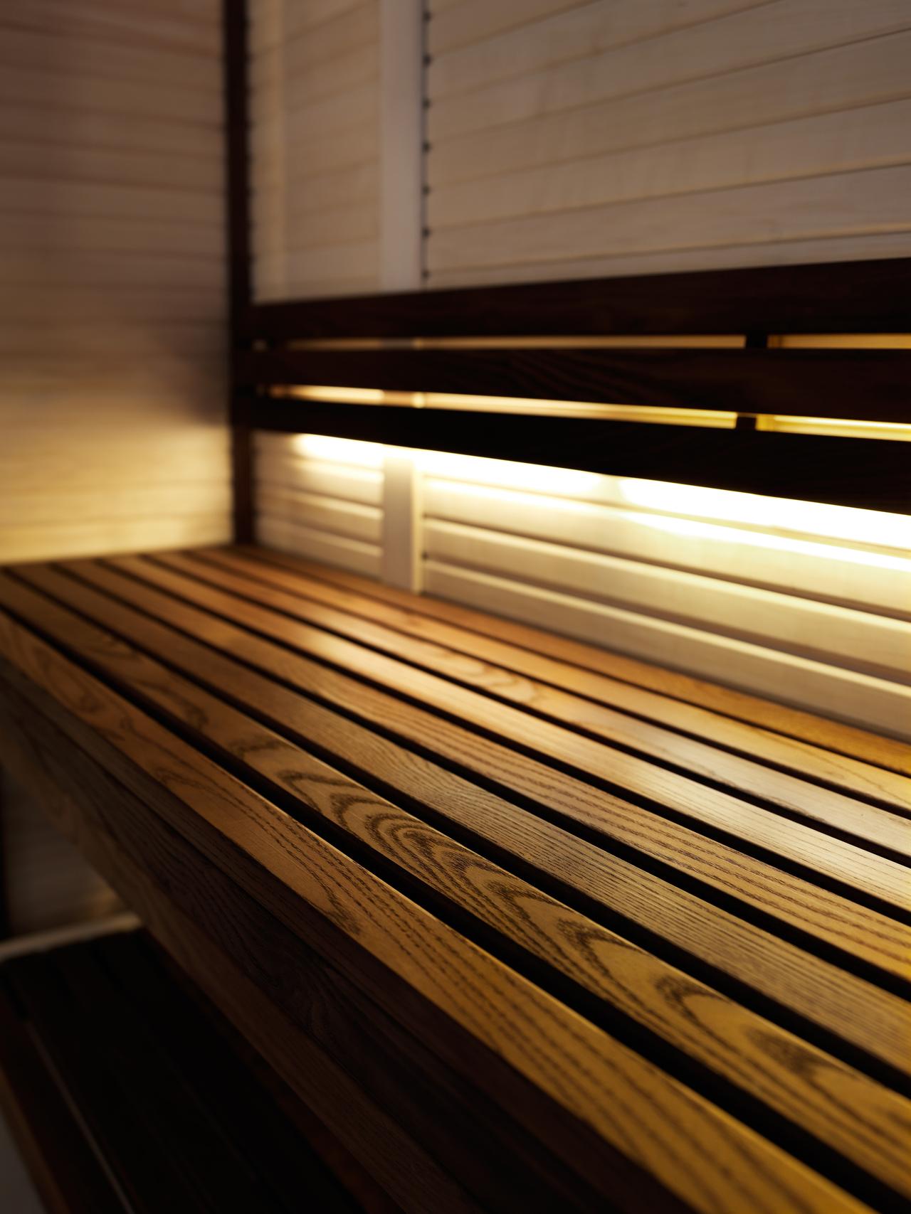 In der Saunakabine befinden sich zwei Bänke mit unterschiedlichen Höhen. Die Bänke bestehen aus dunkler Thermoesche: Die Wände und das Dach aus waagerecht verlegten hellen Espenpaneelen.