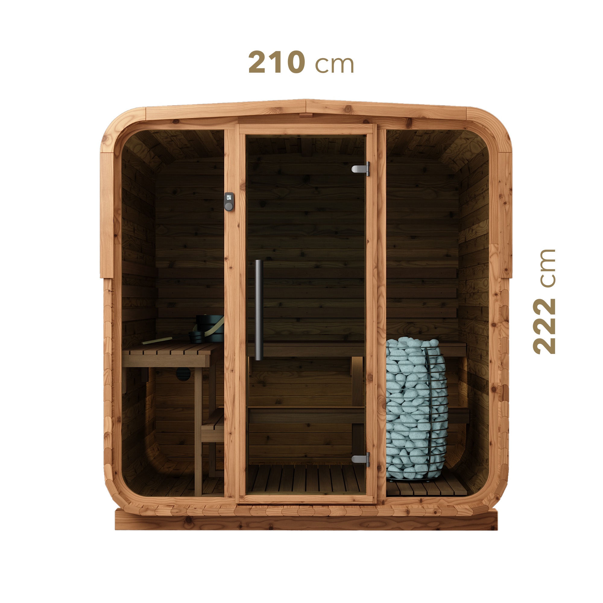Solas schlanke, quadratische Form mit abgerundeten Kanten zeigt eine moderne Ästhetik, die jede Außenumgebung ergänzt. Das Design sieht nicht nur großartig aus, sondern sorgt auch für eine gleichmäßige Wärmeverteilung in der Sauna.