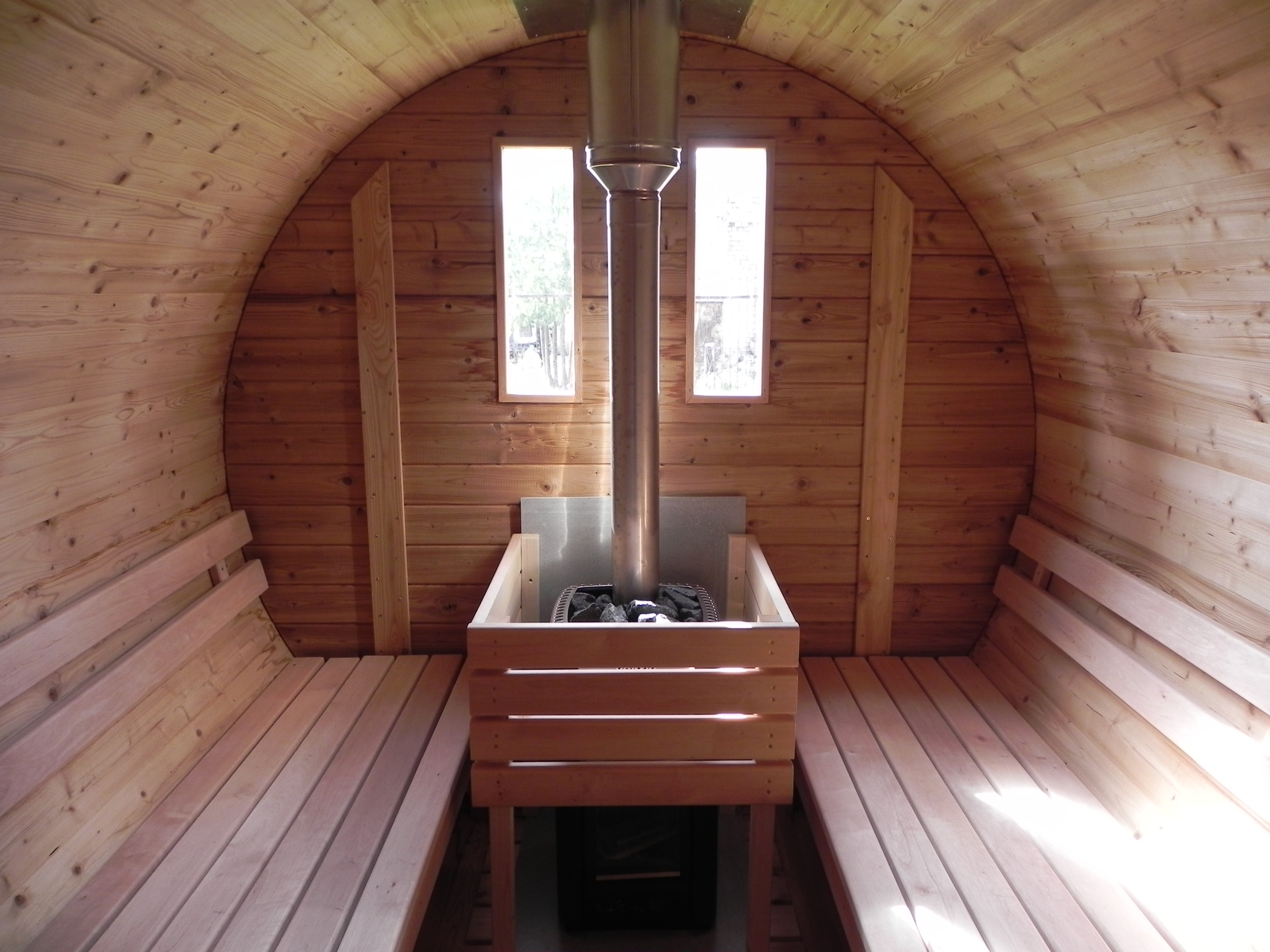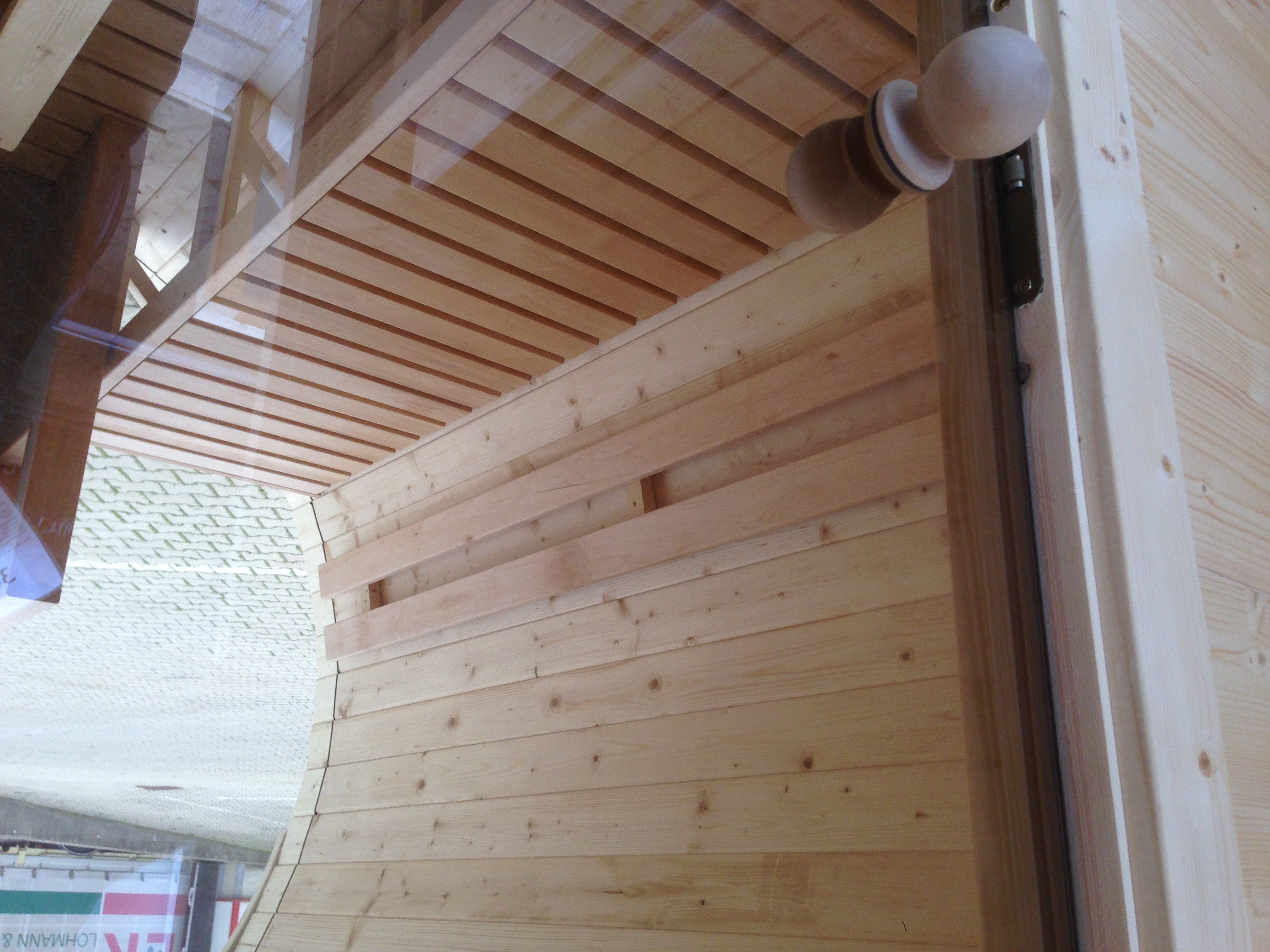 Auf Anfrage können wir einen Holzofen oder einen Elektrosaunaofen einbauen. Die Wände sind entweder 38 mm oder 58 mm dick. Der Massivboden hat eine Dicke von 18 mm. Das Dach ist -je nach Wahl- mit Bitumenschindeln (schwarz/rot/grün) oder Holzschindeln bedeckt.