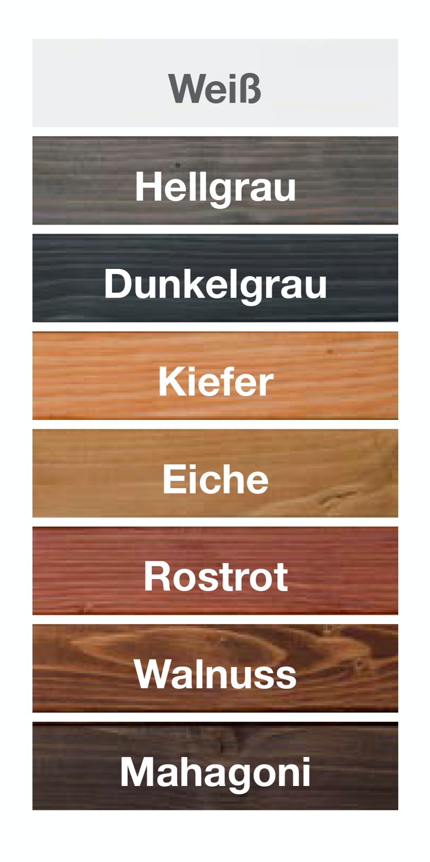 naturbelassen, kiefer, eiche hell, schwedenrot, lärche, weiß, grau oder nußbaum (nur möglich bei komplett montierten Saunafässern - Farbskala siehe Farben)