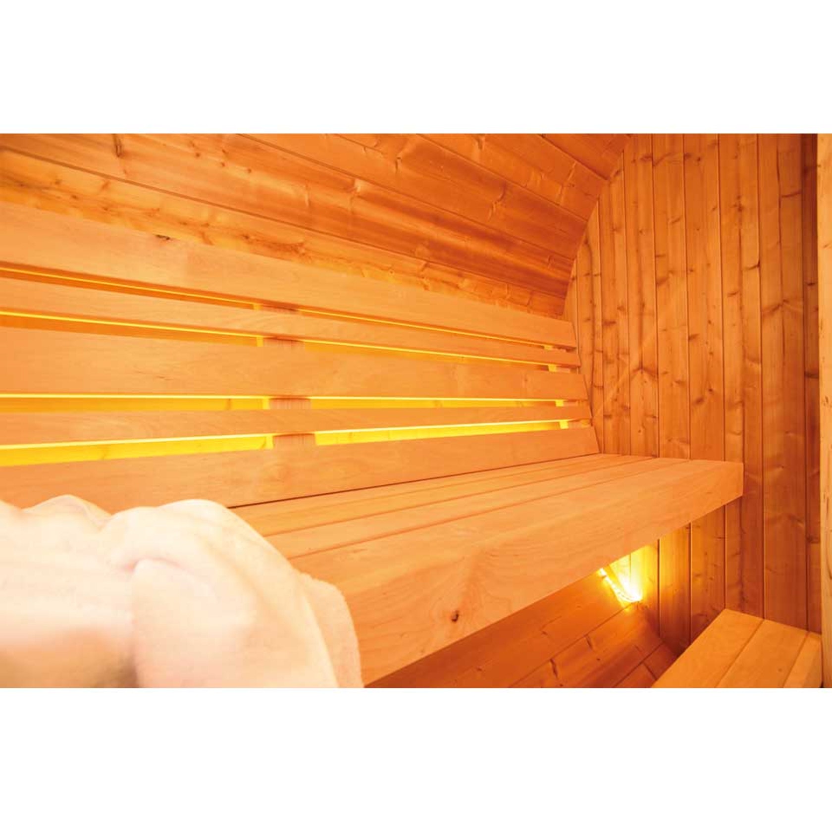 Das Saunafass de luxe 400 bringt Ihnen Entspannung pur in den eigenen Garten! Mit einer Liegefläche von 2,10 m haben Sie ausreichend viel Platz, um den Saunagang unbeschwert zu genießen. Dazu gehören auch die Besonderheiten unserer Fasssauna, die gegen Mehrpreis erhältlich sind, beispielsweise ein beleuchteter Aufgusskübel, der in der Bank eingelassen oder die Panoramaglasscheibe. Außerdem ist der wählbare Ofen nicht nur im stilvollen Design, sondern bietet auch mehr Platz für Saunasteine, sodass ihr Saunaerlebnis noch besser wird! Wahlweise ist unser Saunafass de luxe auch in Thermoholz zu erhalten.