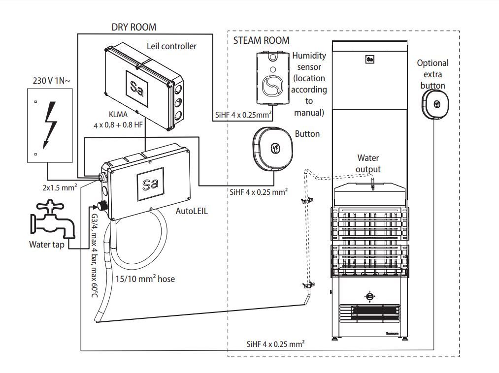 Im Lieferumfang des AutoLeil ist ein Wasserversorgungsknopf für die Saunakabine mit LED-Beleuchtung enthalten. Mit dieser Taste kann auch die automatische Wasserversorgung der Sauna von innen ein- oder ausgeschaltet werden. Die Standarddauer eines Wasserabgabezyklus beträgt 30 Minuten, kann aber beispielsweise für öffentliche Saunen auf bis zu 12 Stunden geändert werden. Wasser kann aus jedem Wasserhahn im Haus entnommen werden (bis 4 bar).