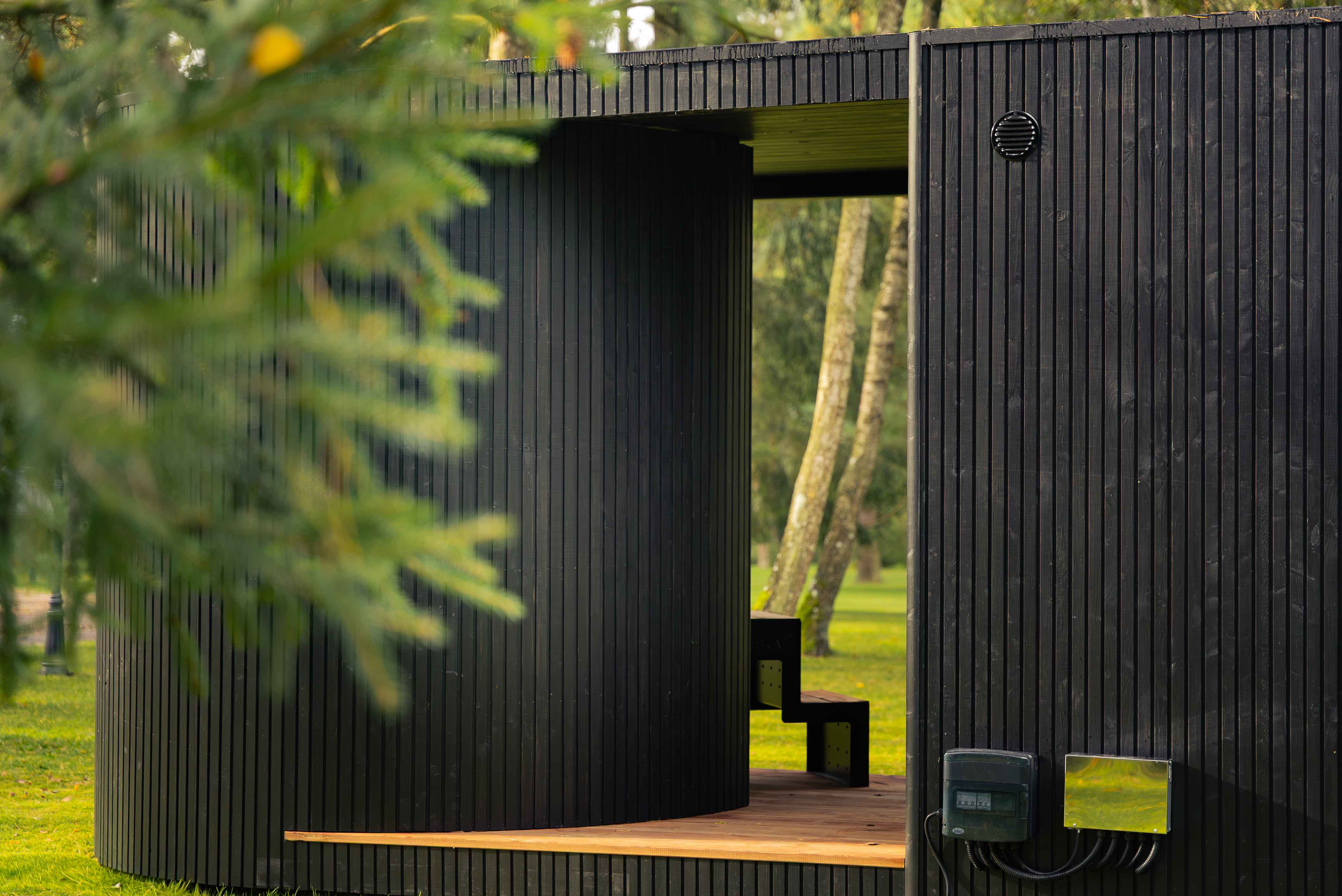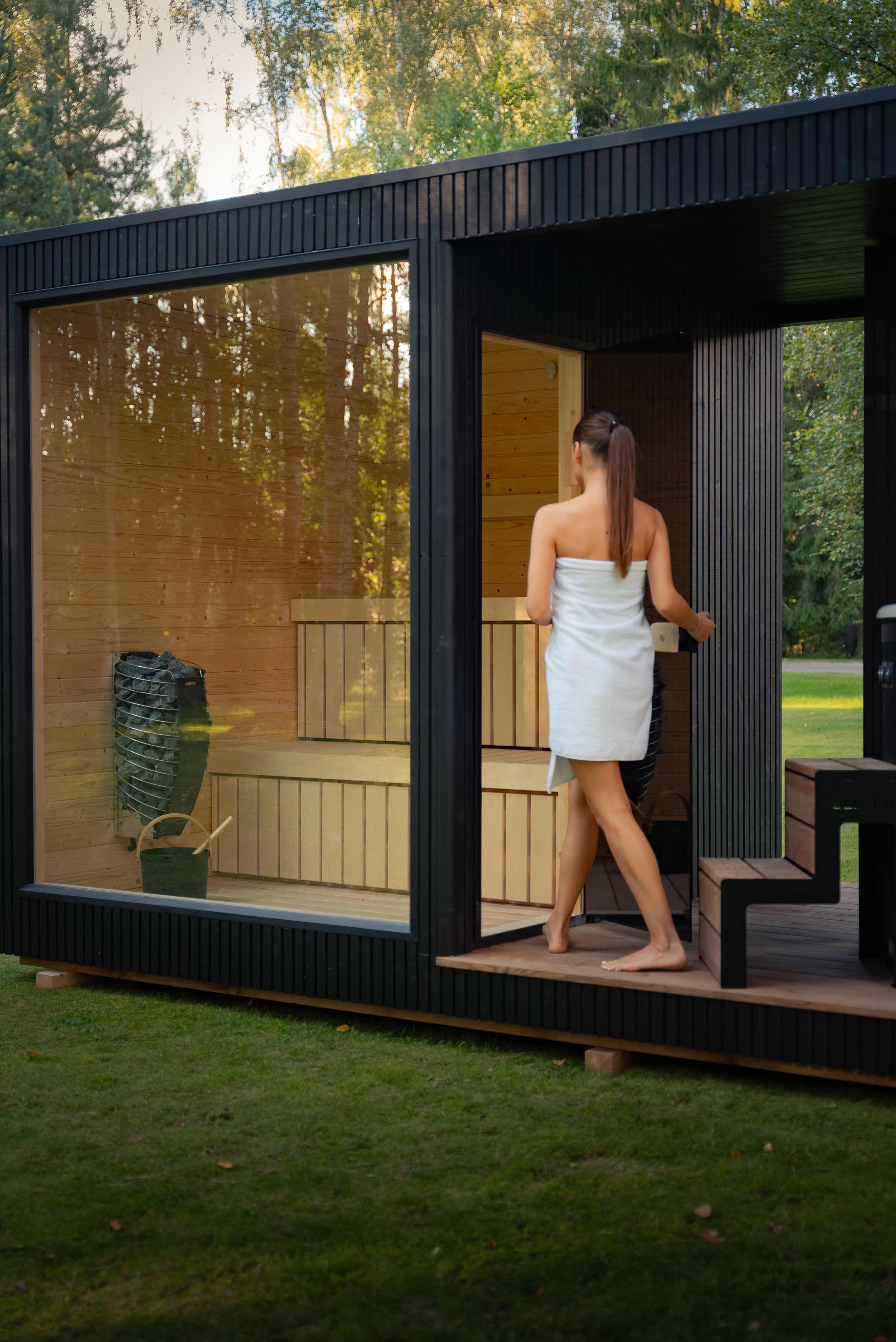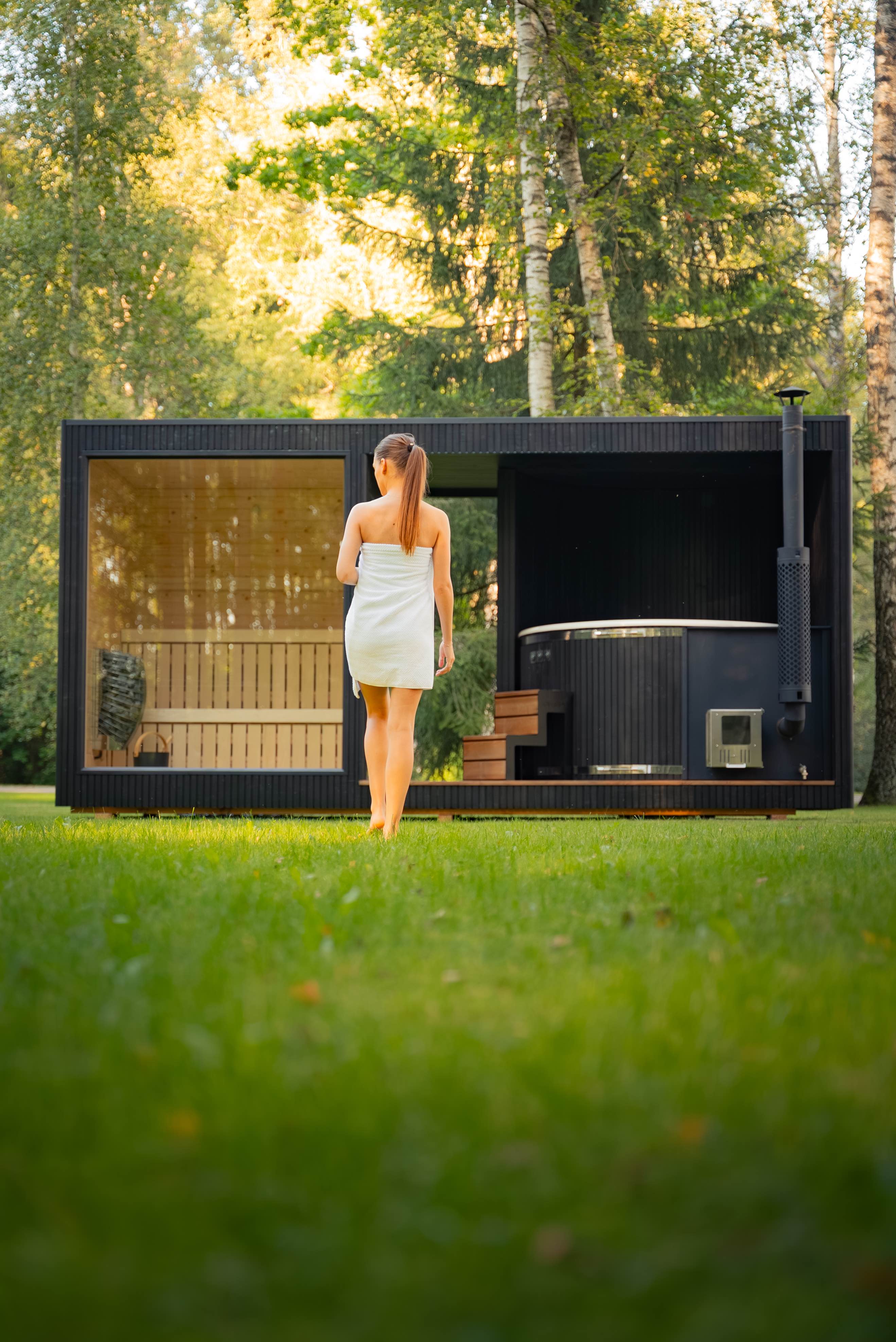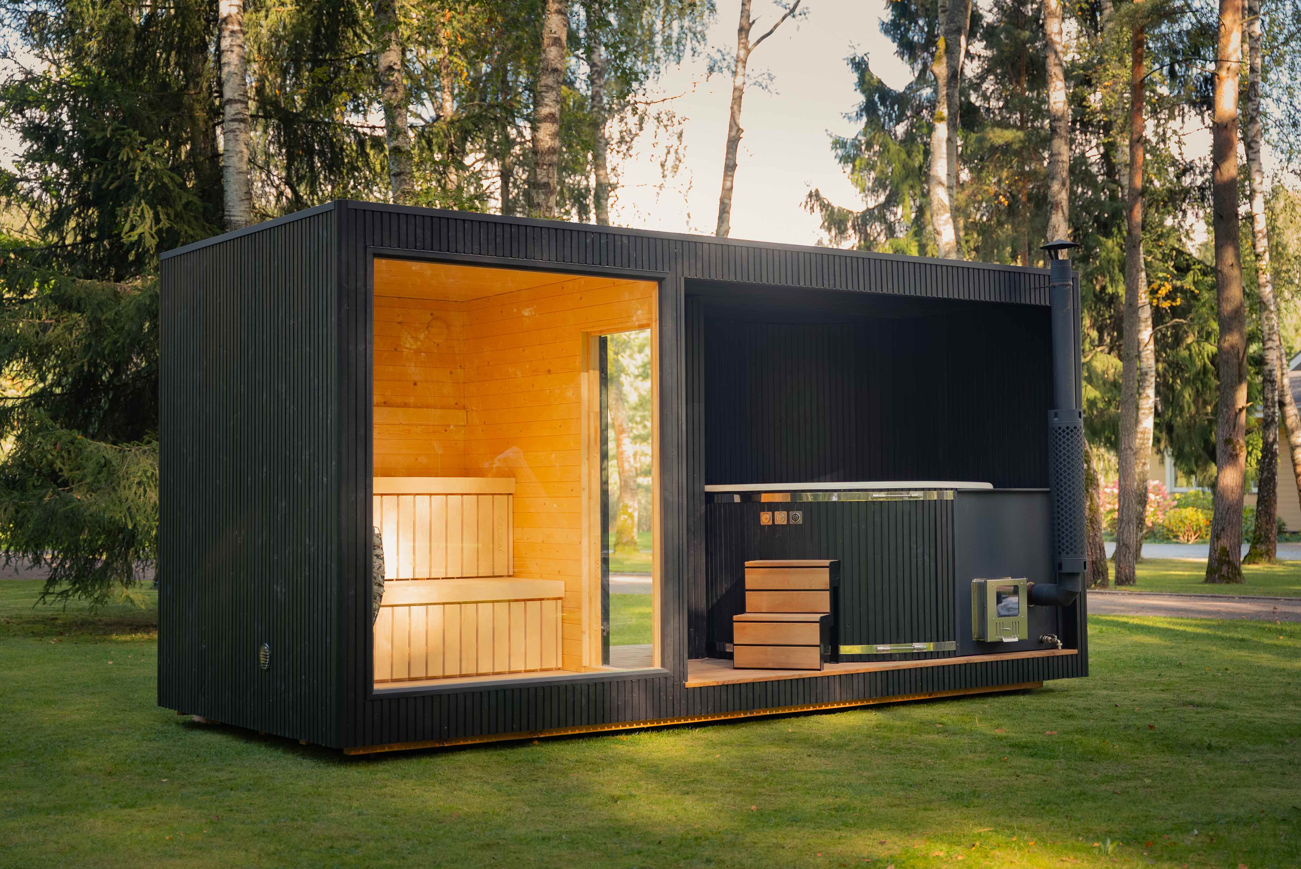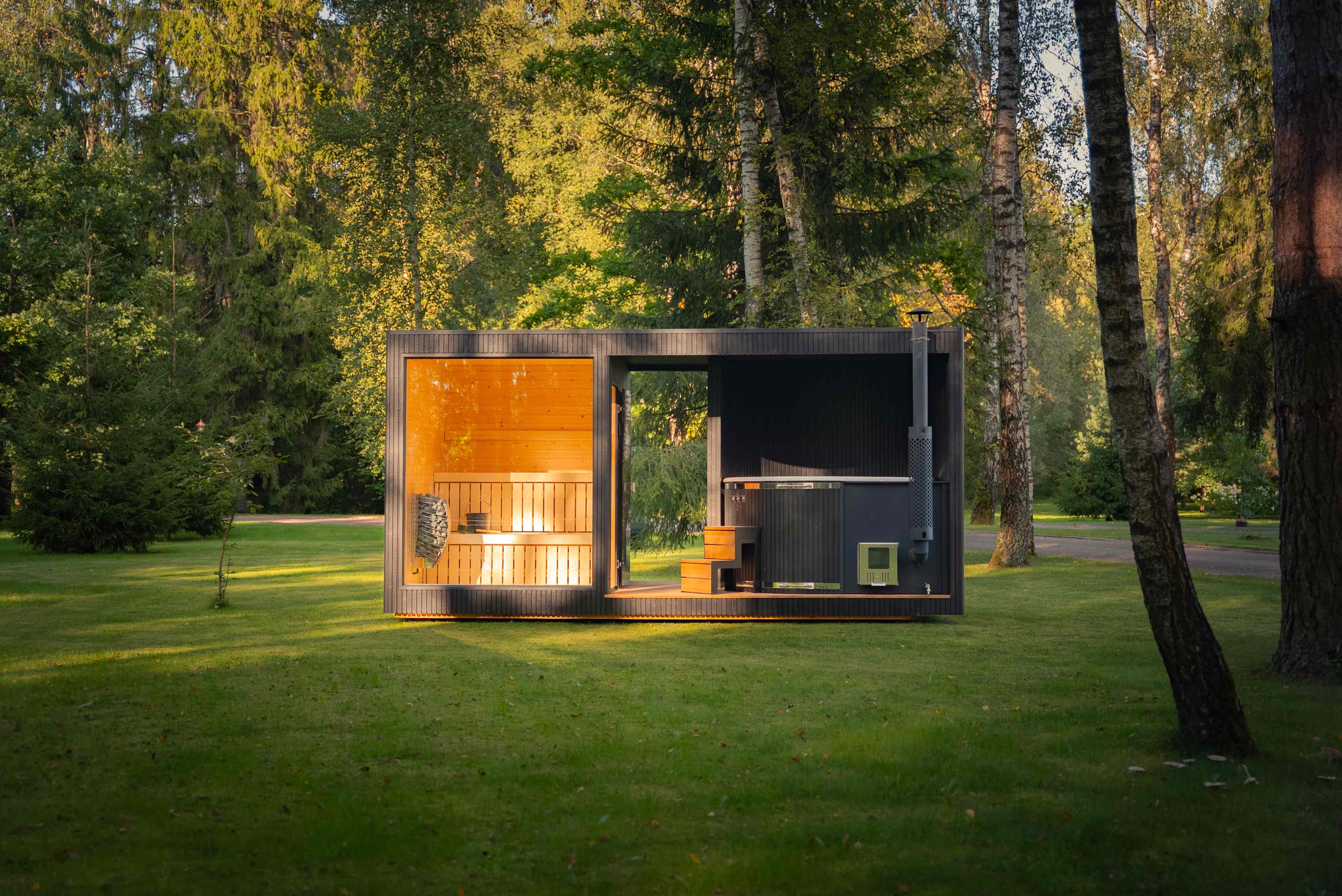 Tauras Grand ist eine hochwertige Wellnesseinheit, die eine großzügige Sauna und einen integrierten Hot Tub in einem eleganten, architektonischen Design vereint.