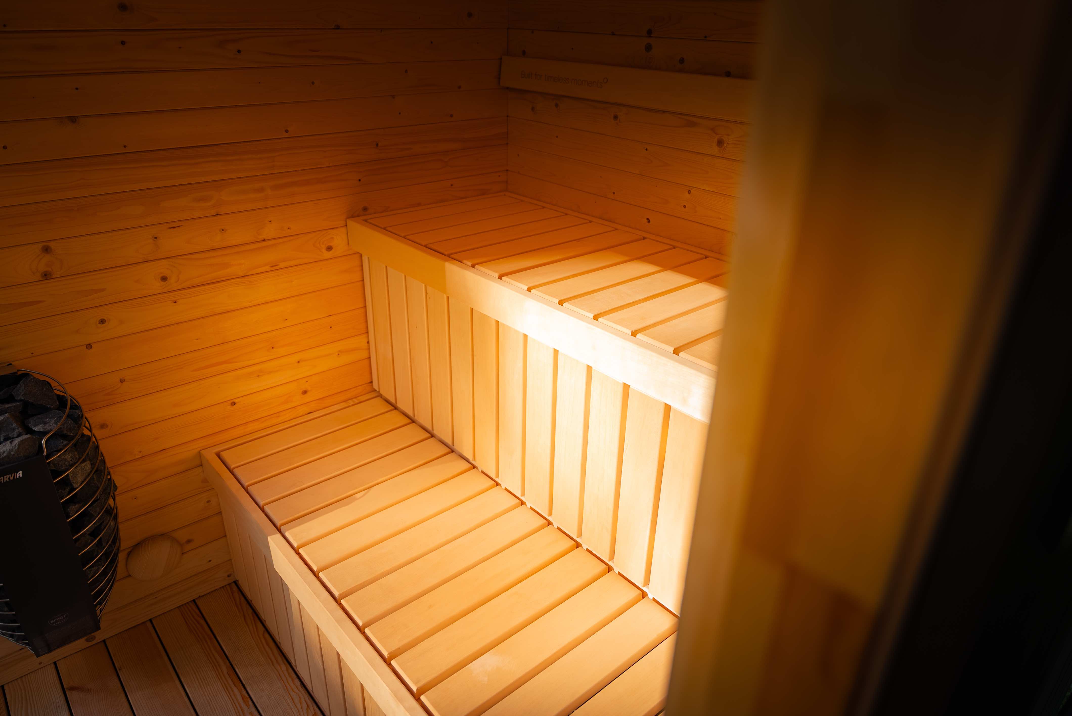Unsere Saunen sind standardmäßig mit Lindenholzbänken ausgestattet – leicht, glatt und ideal für hochtemperierte Umgebungen.