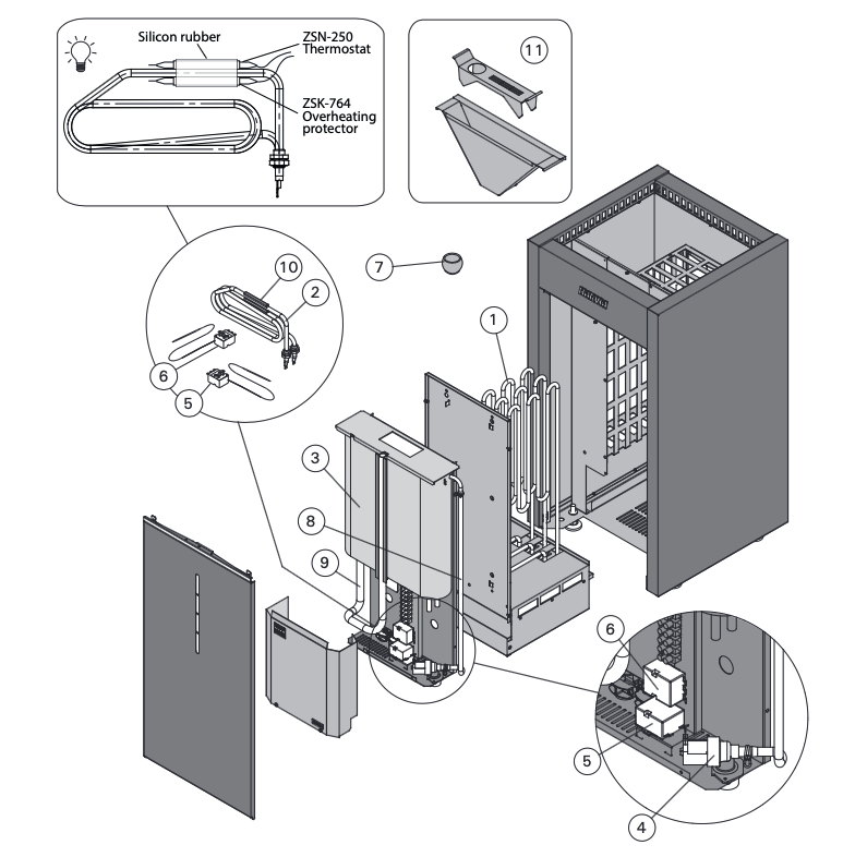 Virta Saunaöfen sind einfach zu installieren. Alle Anschlüsse sind unten an der Vorderseite des Ofens gut erreichbar und mit genügend Platz ausgestattet. Die Heizelemente sind von den Steinen getrennt, dies führt zu einer langen Lebensdauer. Im Servicefall sind sie einfach und schnell zu wechseln. Auch andere Wartungsarbeiten sind durch die durchdachte Bauweise der Öfen zügig durchzuführen.