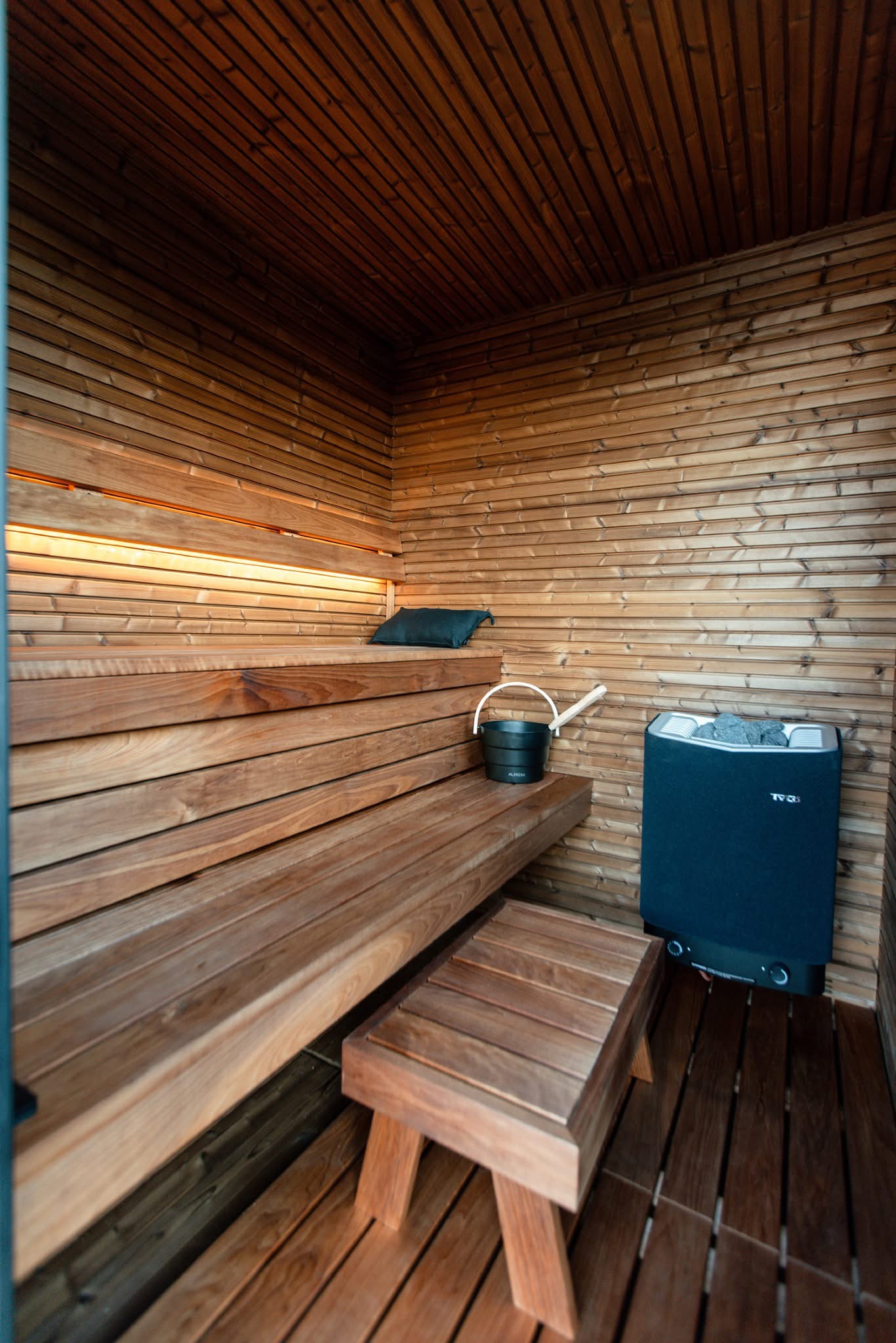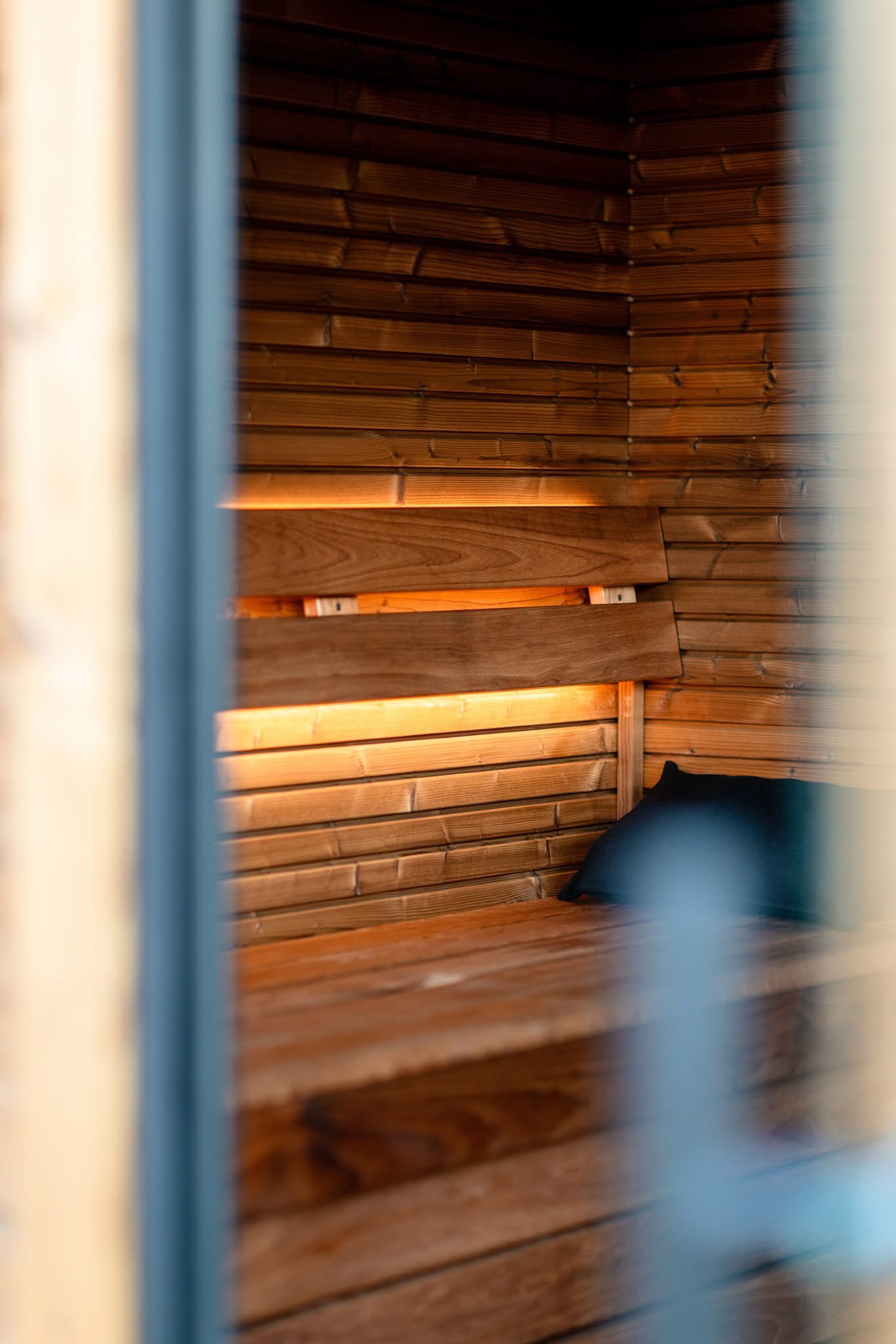 Die integrierte Beleuchtung unterstreicht den warmen, einladenden Innenraum der Sauna