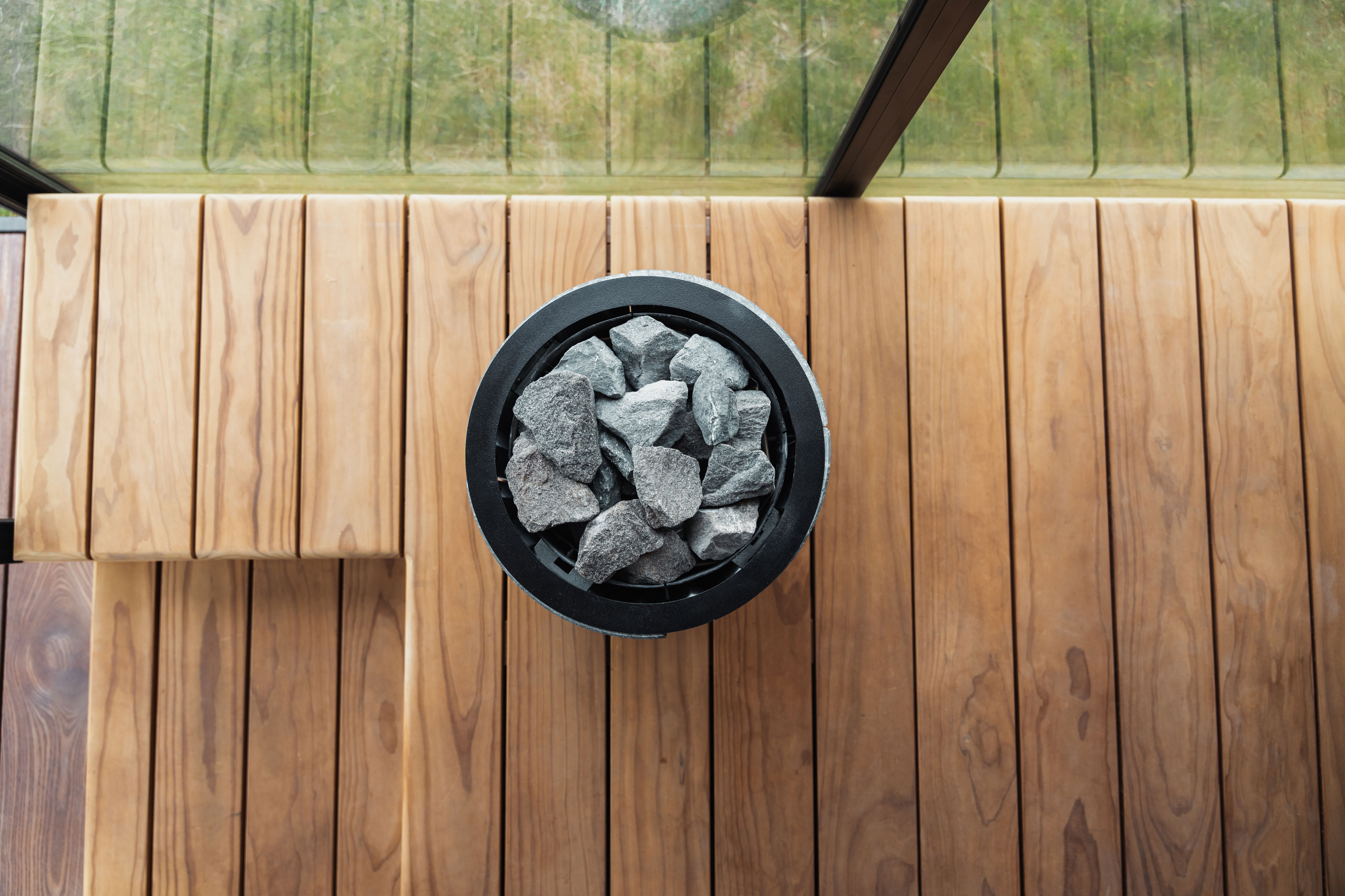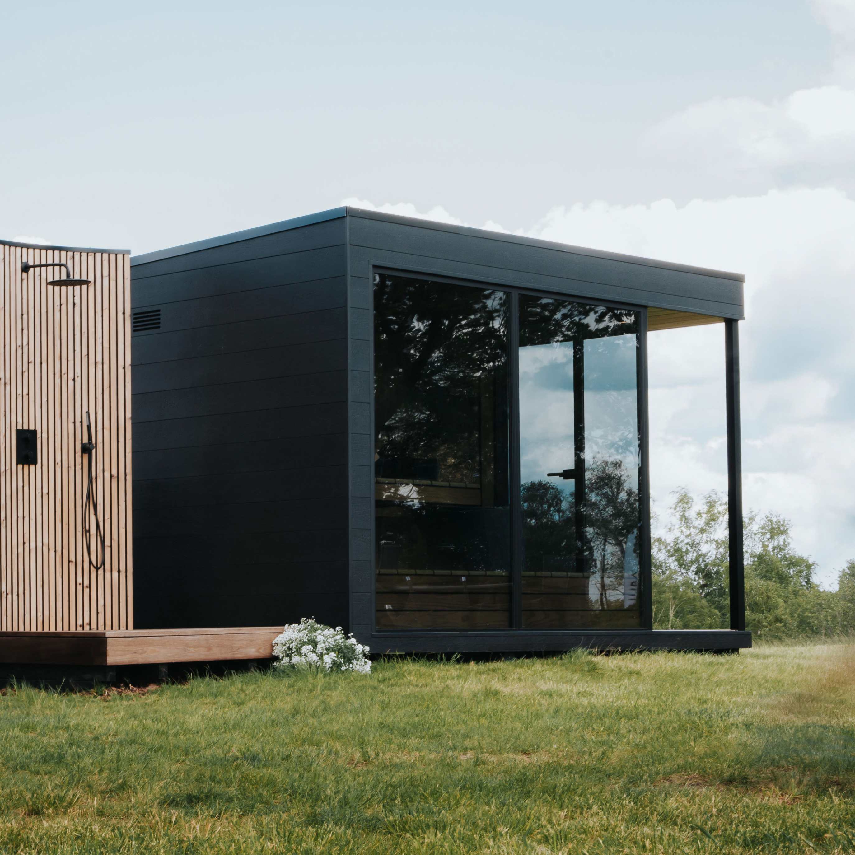 Eingehüllt in unsere charakteristische Ignite-Verkleidung – eine thermisch modifizierte, gebürstete und schwarz lackierte Holzoberfläche – zieht Quu schon von außen die Blicke auf sich. Im Inneren bietet sie einen beruhigenden Rückzugsort mit klaren Linien, Panoramablick und schwebenden Bänken aus Thermo-Radiata-Kiefer.
