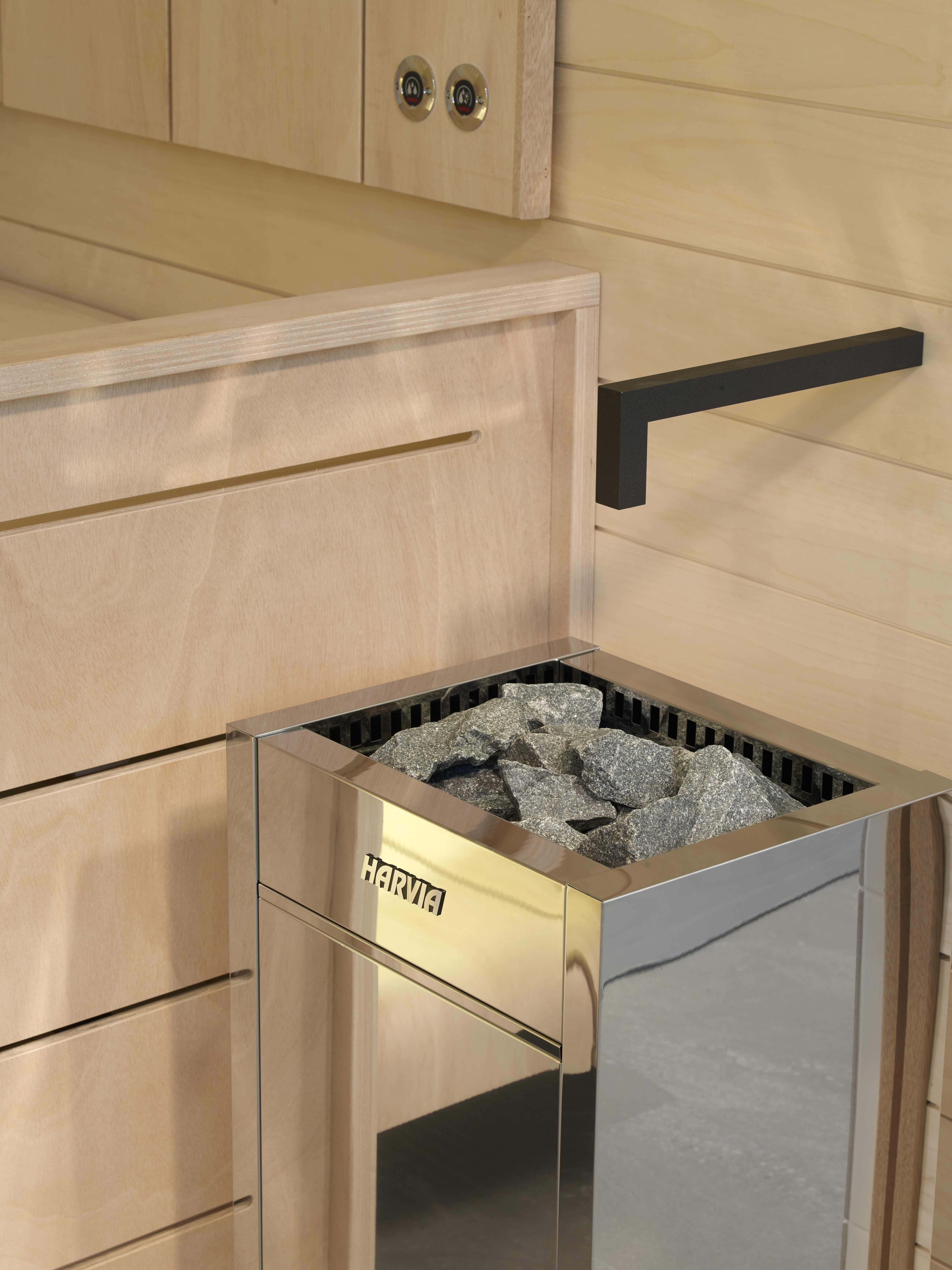 Das Rohrsystem kann auch integriert durch die Wandverkleidung der Sauna geführt werden, so dass das Rohrsystem verschwindet und das äußerliche Erscheinungsbild der Sauna ordentlich bleibt.