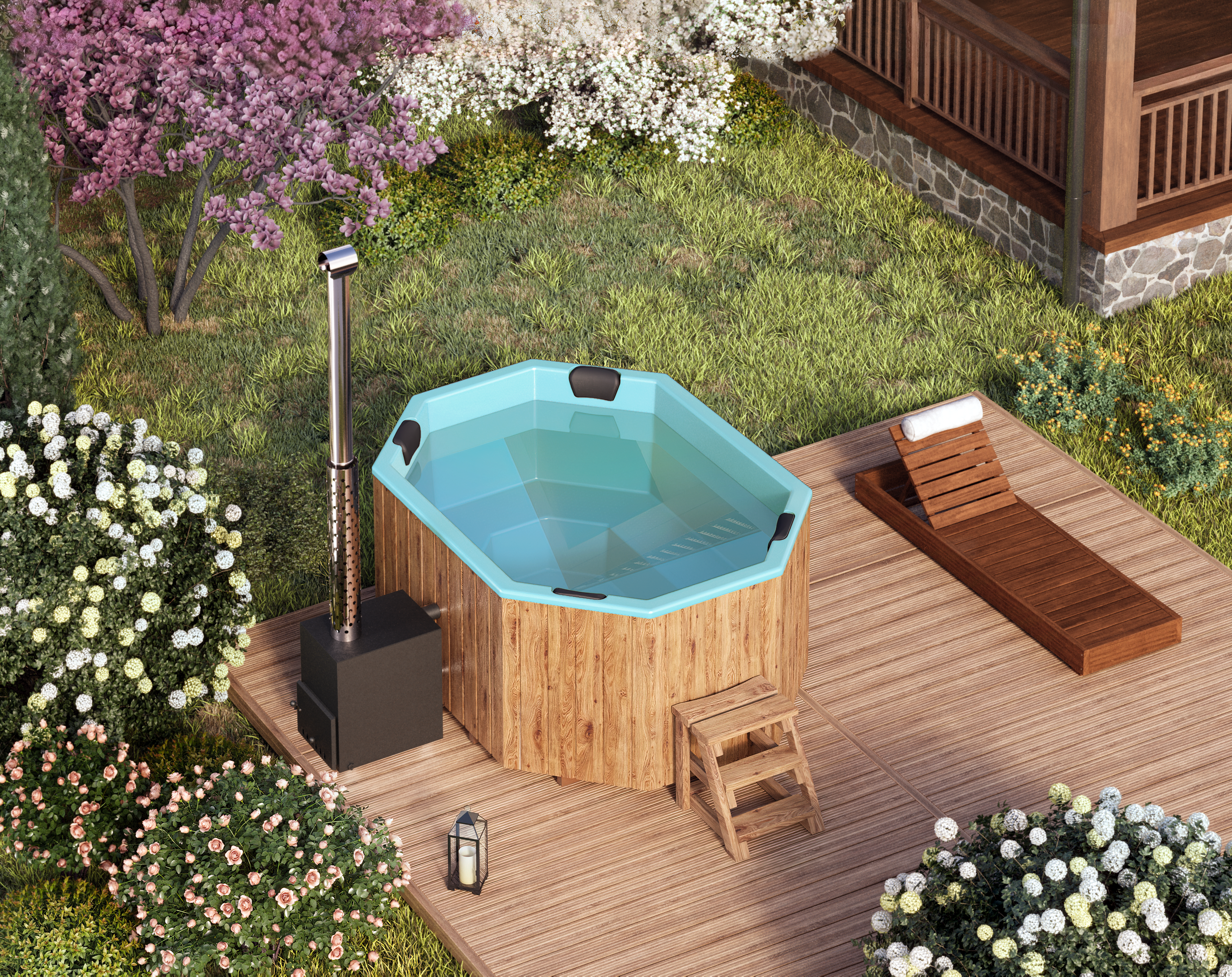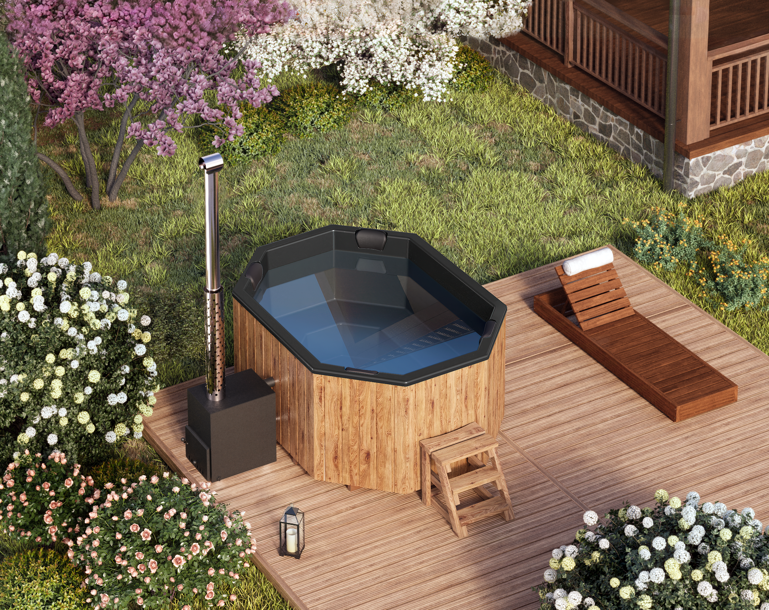 Sie können einen von 3 Holzöfen auswählen und die Badetonne mit Ofen nach Ihrem Geschmack mit zusätzlichem Zubehör ausstatten: Luftmassage, Wassermassage und atmosphärische LED-Beleuchtung.