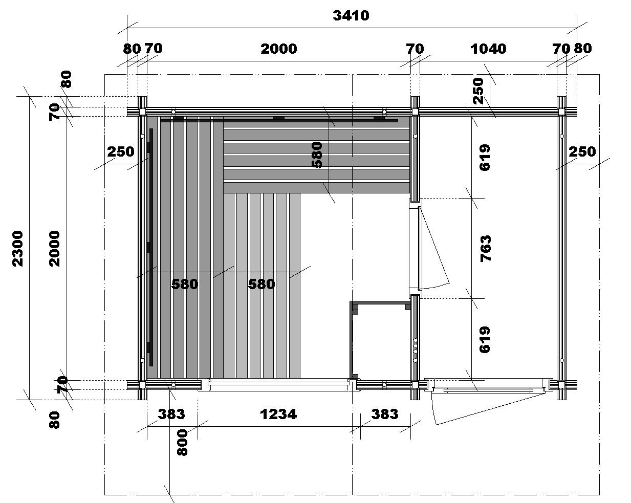 Zwischenbankverkleidung, Ofenschutzgitter, Fußrost, moderner Eckblendschirm mit Saunalampe; Glastür 1844 x 625 x Schwelle, Saunadach isoliert.
