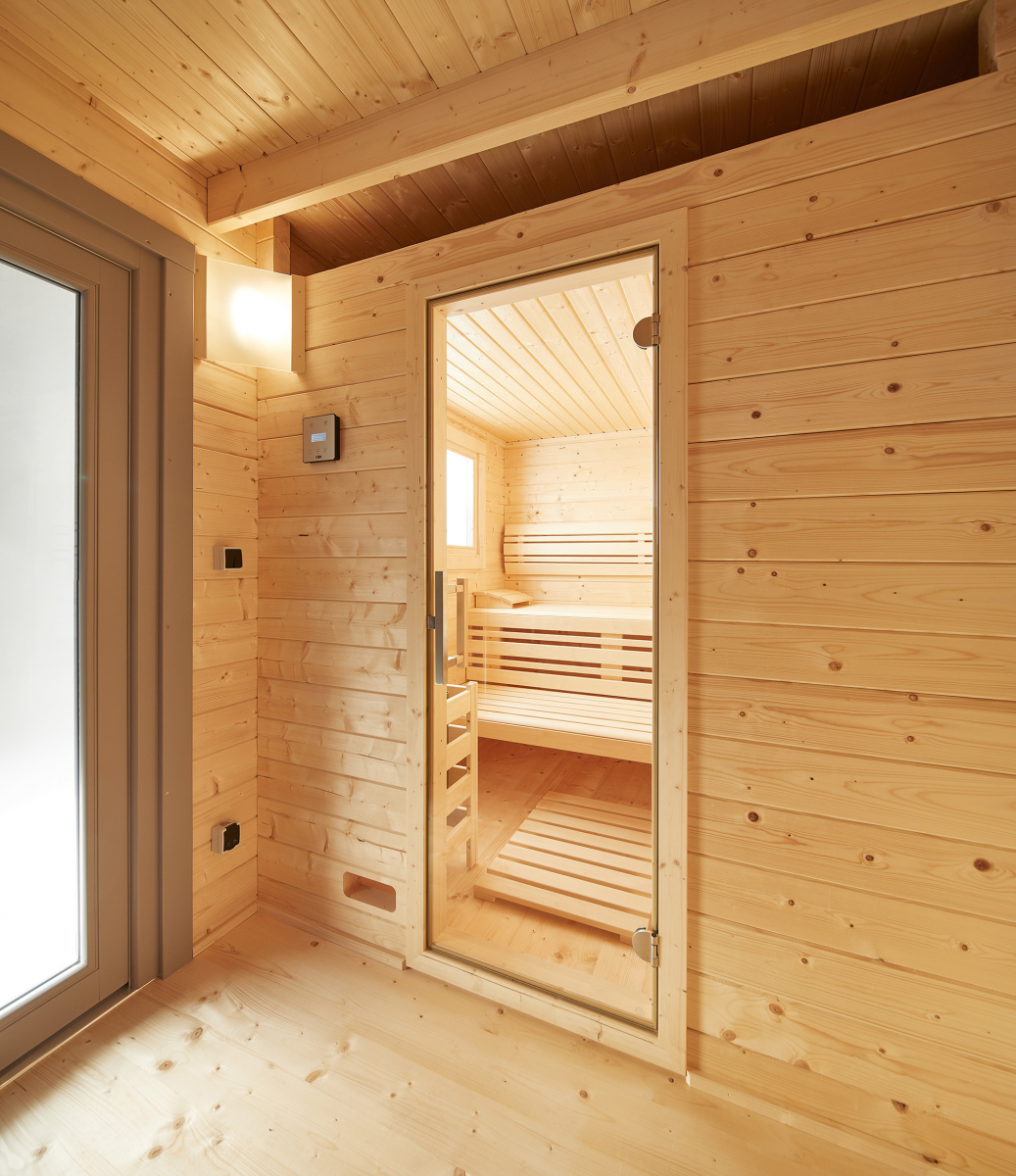 Massivholzsauna aus 70 mm nordischer Fichte mit Ecküberstand