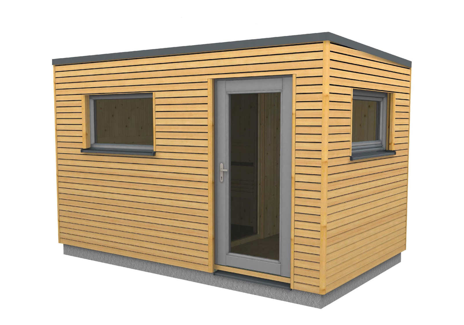 Moderne Gartensauna mit Außenverkleidung in Läche-Fassenprofilen oder witterungsbeständigen HPL-Platten