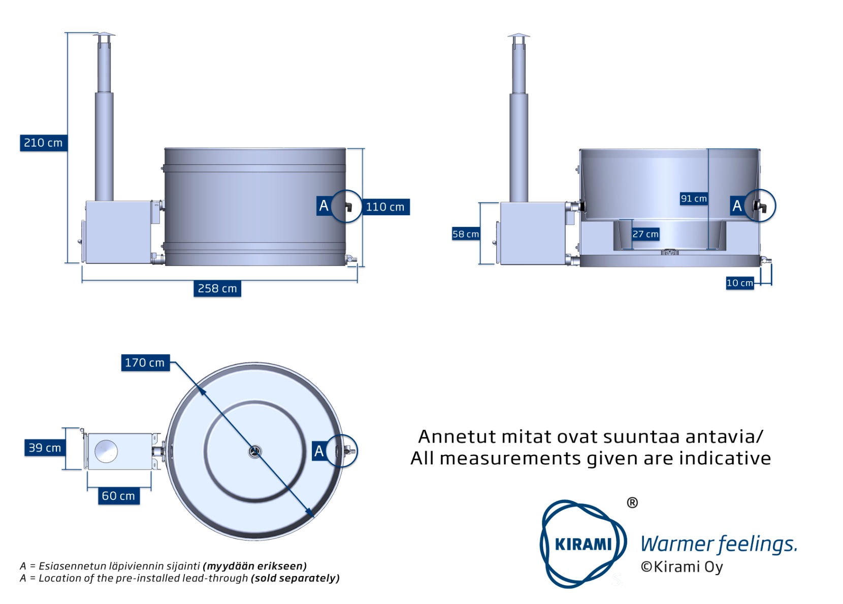 Der Durchmesser des Fasses beträgt 170 cm bei einem Fassungsvermögen von 1540 l und einem Trockengewicht von 142 kg. Das Badefass bietet Platz für 4-6 Personen. Die Bruttoleistung des CULT-si-Ofens liegt bei 36 kW und die dem Wasser gelieferte Leistung bei 22 kW.