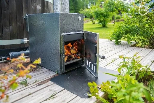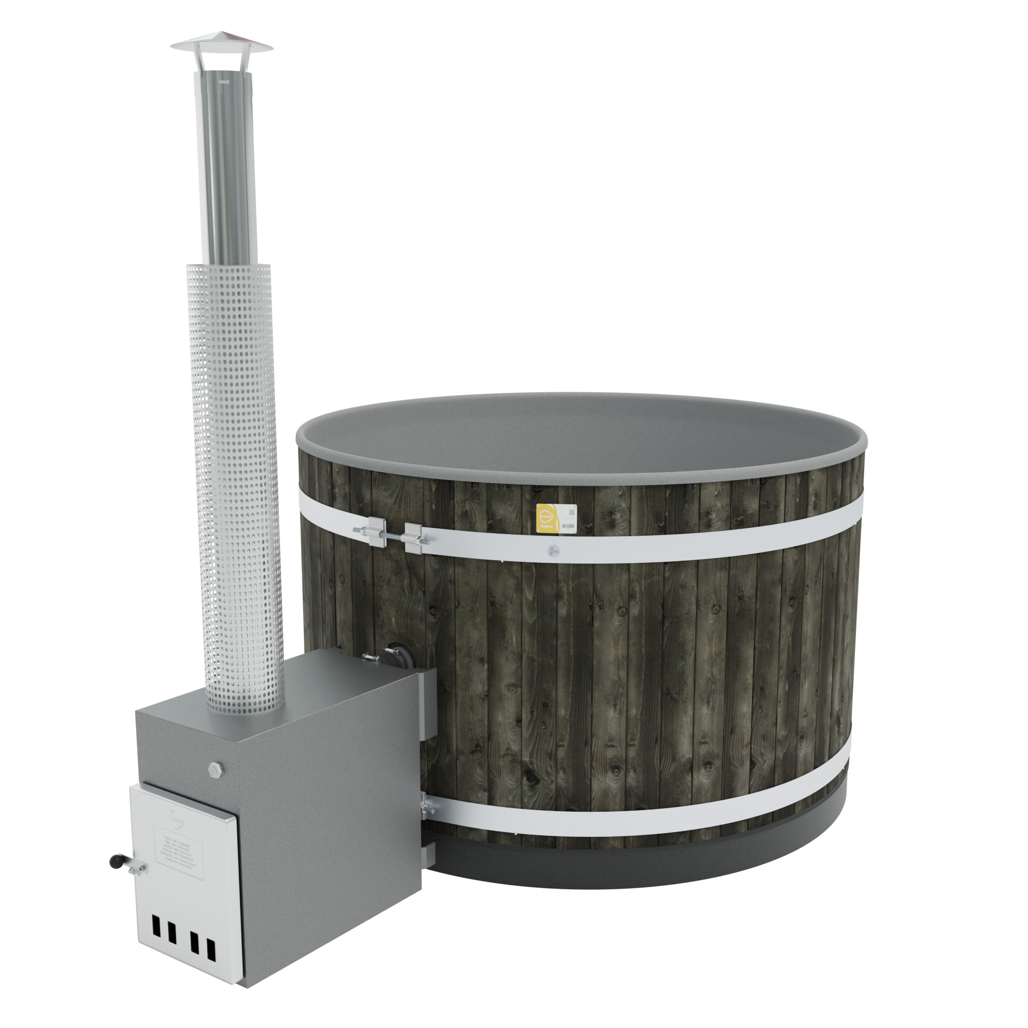 Als Außenofen kommt der grau gehaltene CULT-si zum Einsatz, der sich ideal zum Beheizen kleiner Badefässer eignet. Er wurde aus hochwertigem Meeresaluminium gefertigt, was eine äußerst gute Wärmeleitfähigkeit sicherstellt.