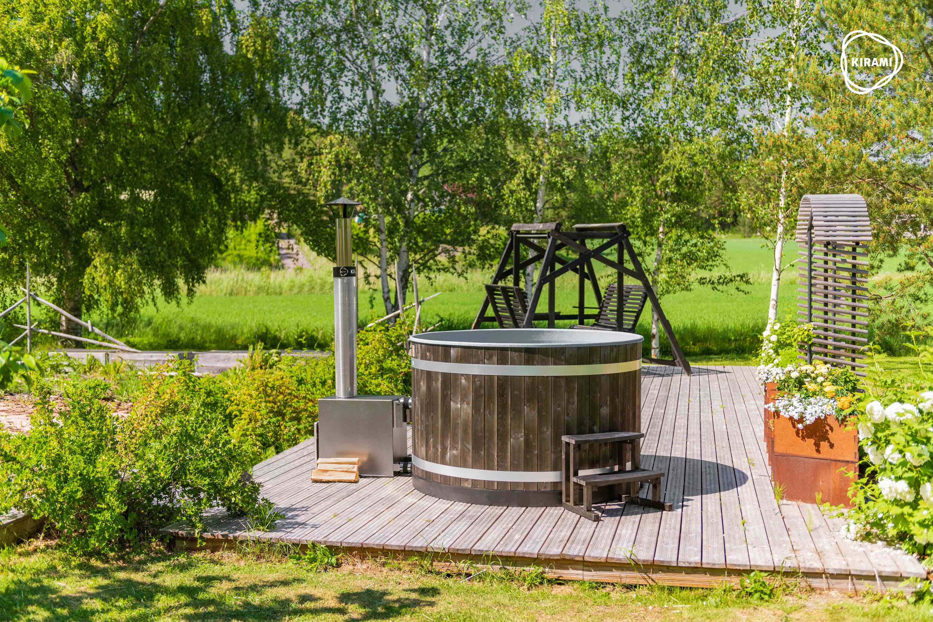 Als Außenverkleidung dienen in einem schwarzen Kohlefarbton gebeizte Fichtenpaneele aus Finnland, deren schönes Erscheinungsbild lange erhalten bleibt. Die durchscheinende, hellgraue Innenwanne wird durch den leichten “Flöckchen-Effekt” optisch zusätzlich aufgewertet. Die helle Farbe des Innenbeckens ist ebenso zeitlos wie trendy und fügt sich wunderbar in die Umgebung ein.