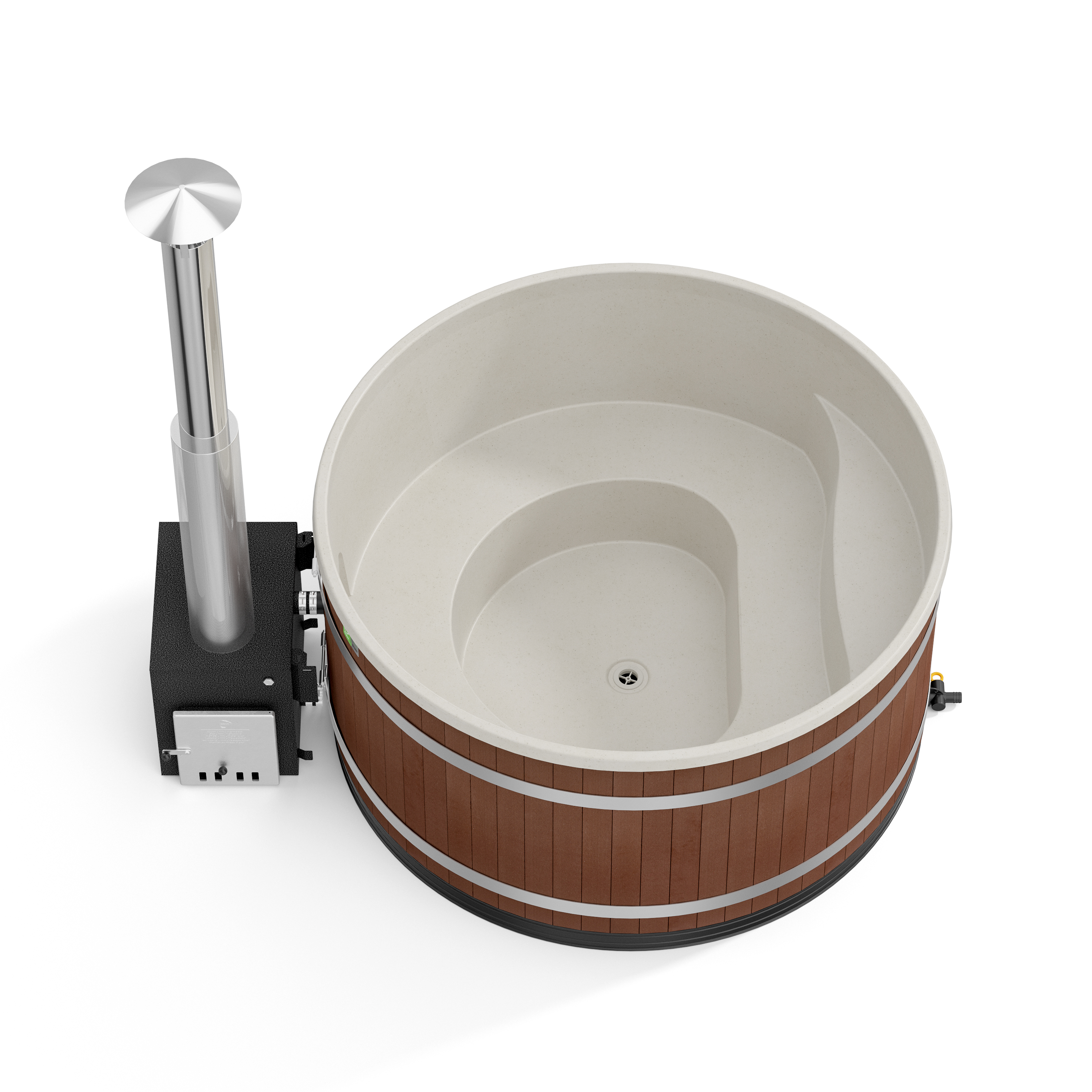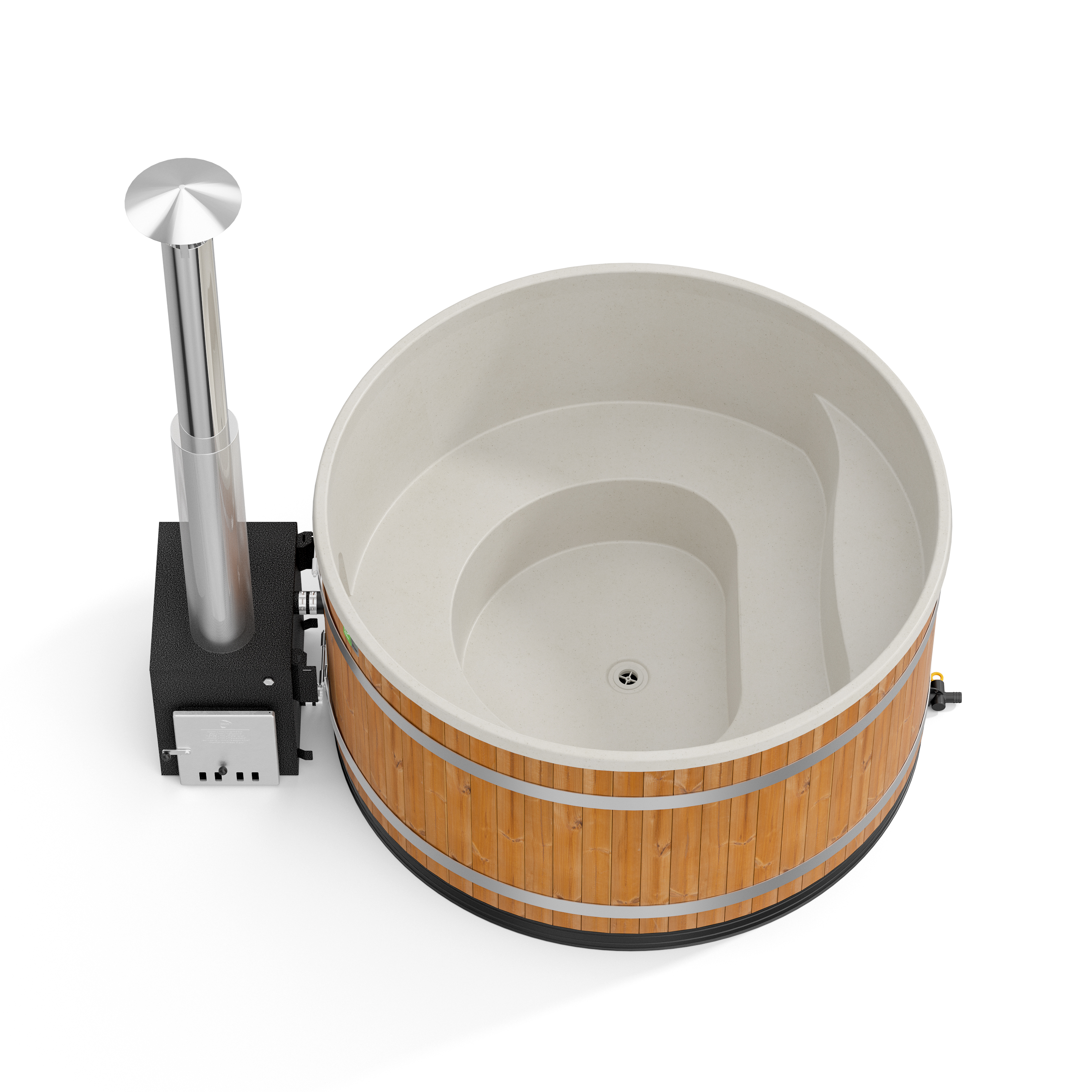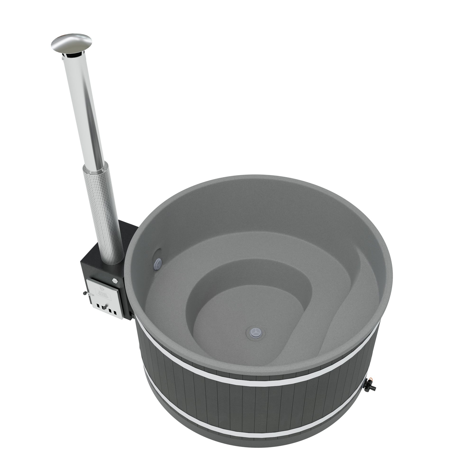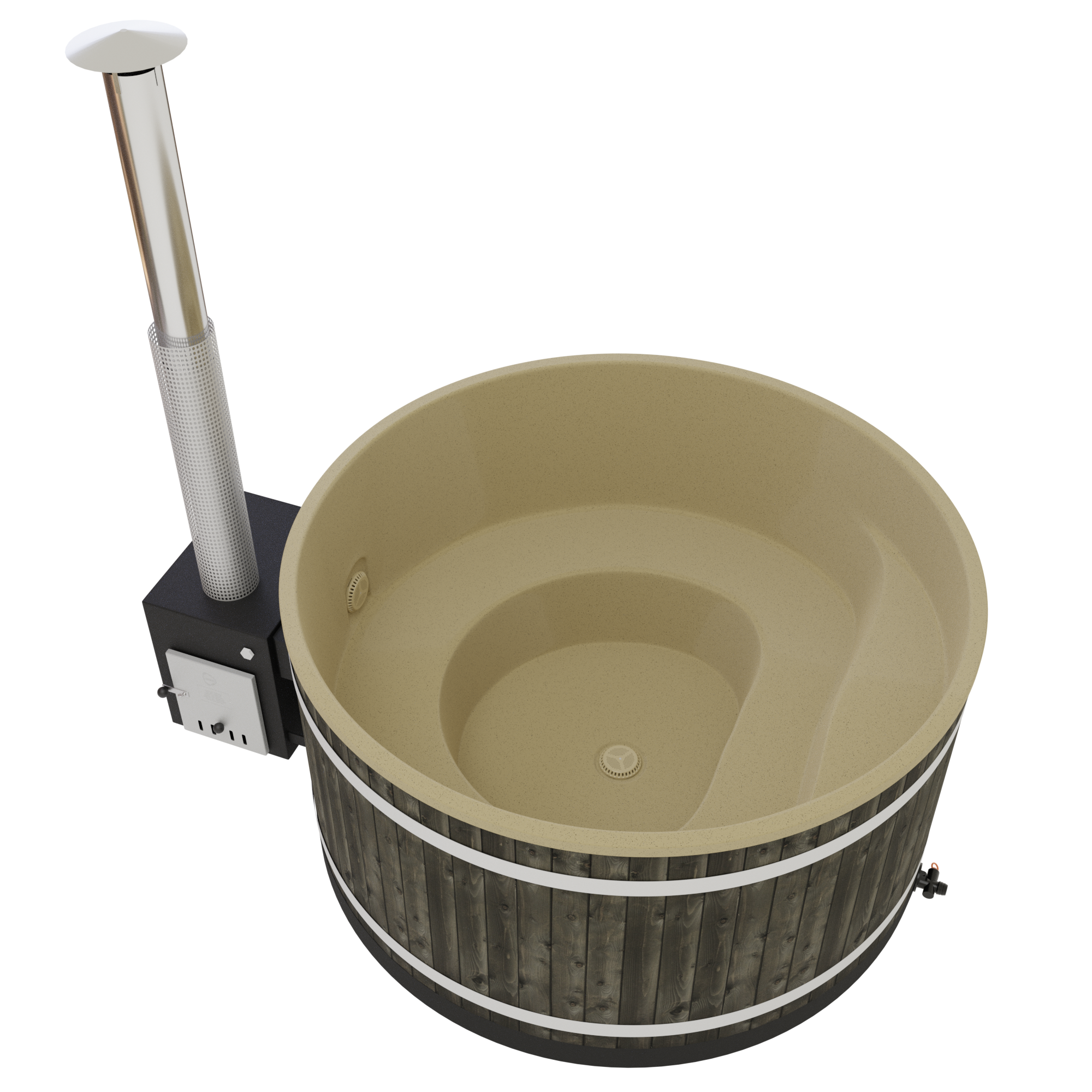 Als Außenofen kommt der schwarz gehaltene, leistungsfähige Cube zum Einsatz, der sich ideal zum Beheizen auch größer Badefässer eignet. Er wurde aus hochwertigem Meeresaluminium gefertigt, was eine äußerst gute Wärmeleitfähigkeit sicherstellt.