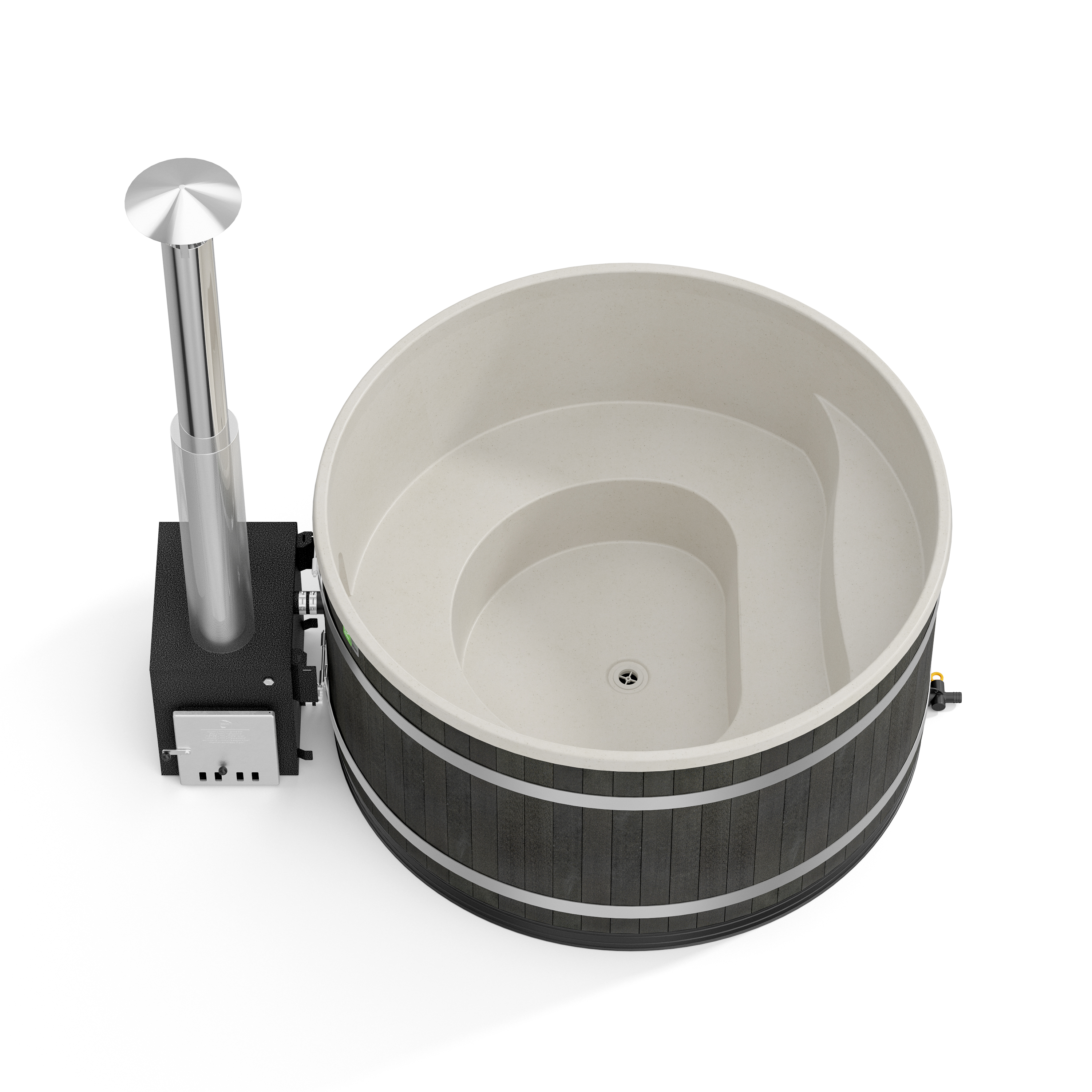 Als Außenverkleidung dienen in einem schwarzen Kohlefarbton gebeizte Fichtenpaneele aus Finnland, deren schönes Erscheinungsbild lange erhalten bleibt. Die durchscheinende, hellgraue Innenwanne wird durch den leichten “Flöckchen-Effekt” optisch zusätzlich aufgewertet. Die helle Farbe des Innenbeckens ist ebenso zeitlos wie trendy und fügt sich wunderbar in die Umgebung ein.